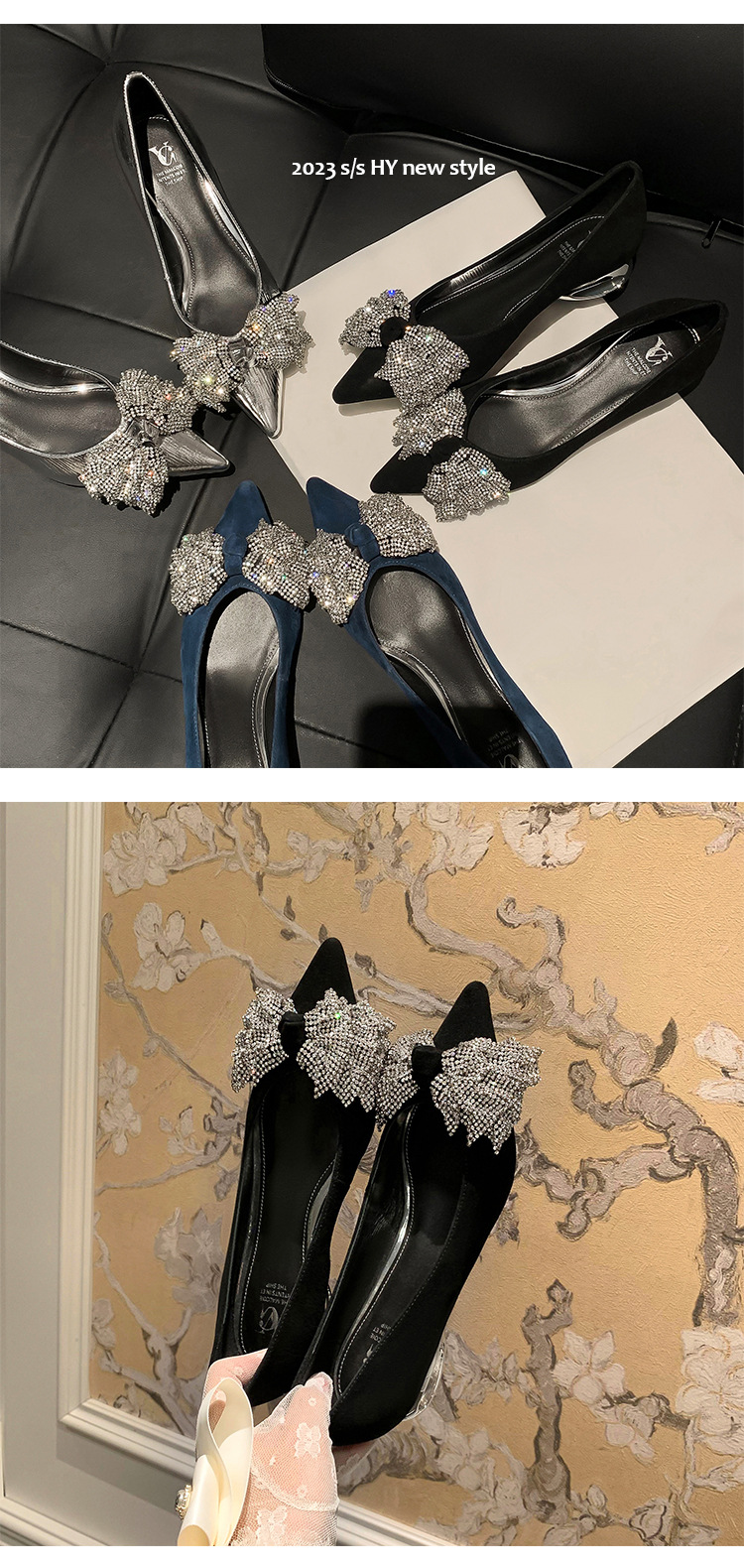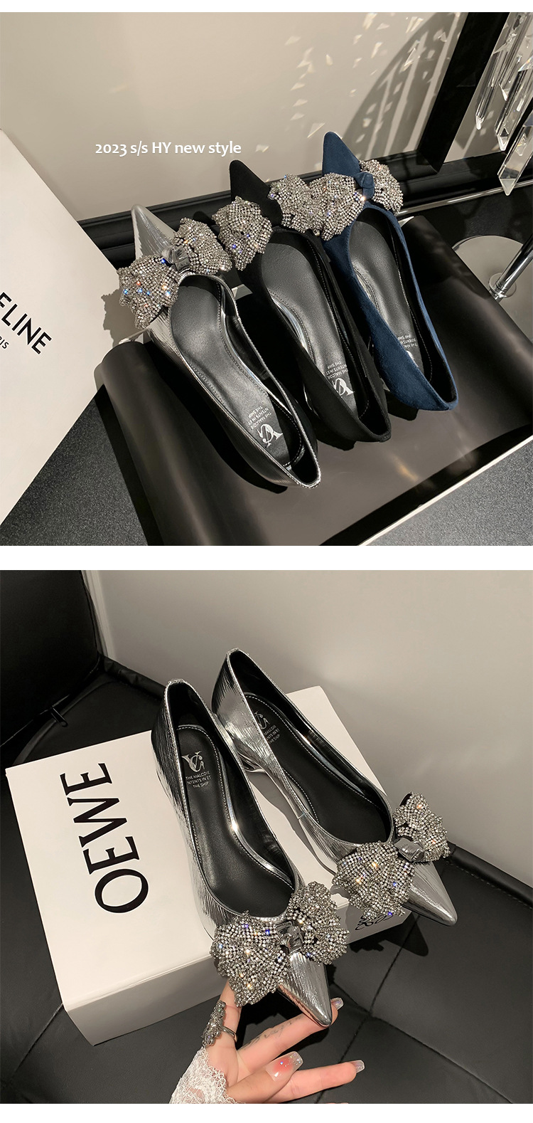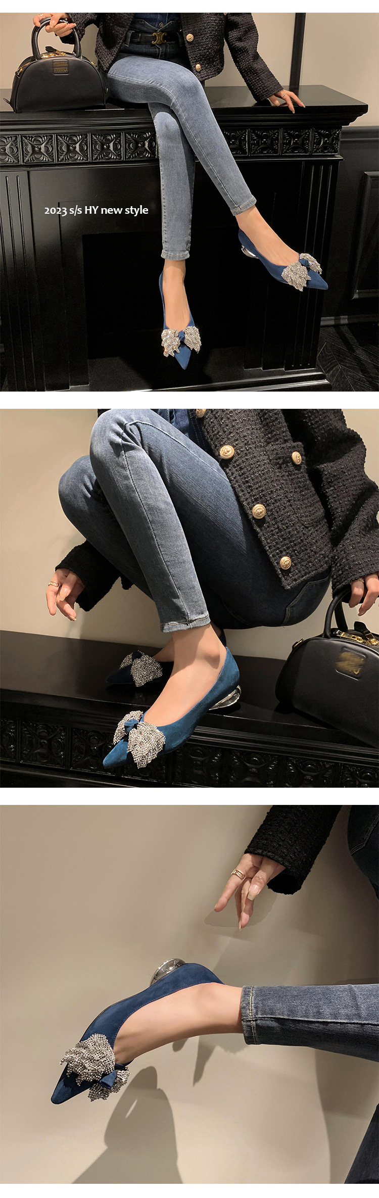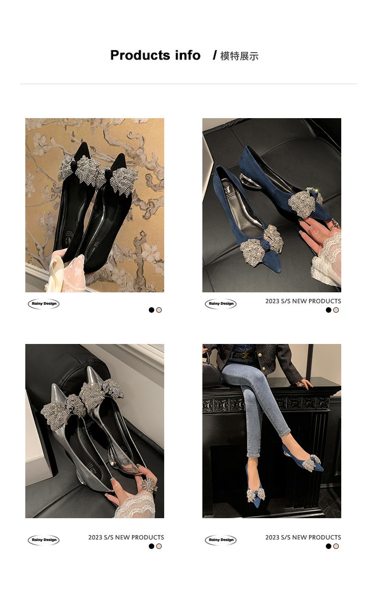 프랑스 스타일 Cowhide Rhinestone 활 낮은 발 뒤꿈치 신발 2024 봄과 여름 유럽 뾰족한 완두콩 신발 여성의 두꺼운 발 뒤꿈치 신발스토어 가기