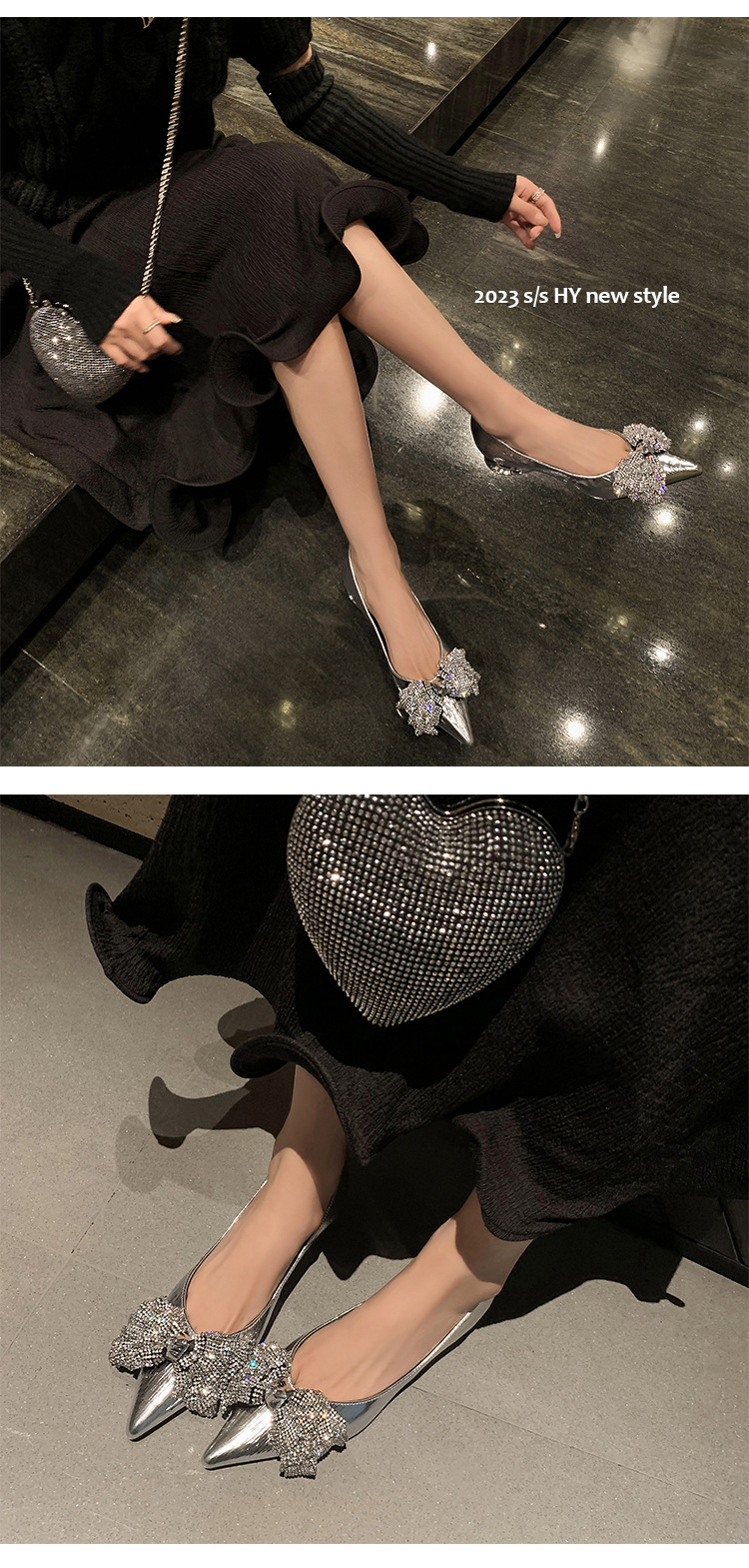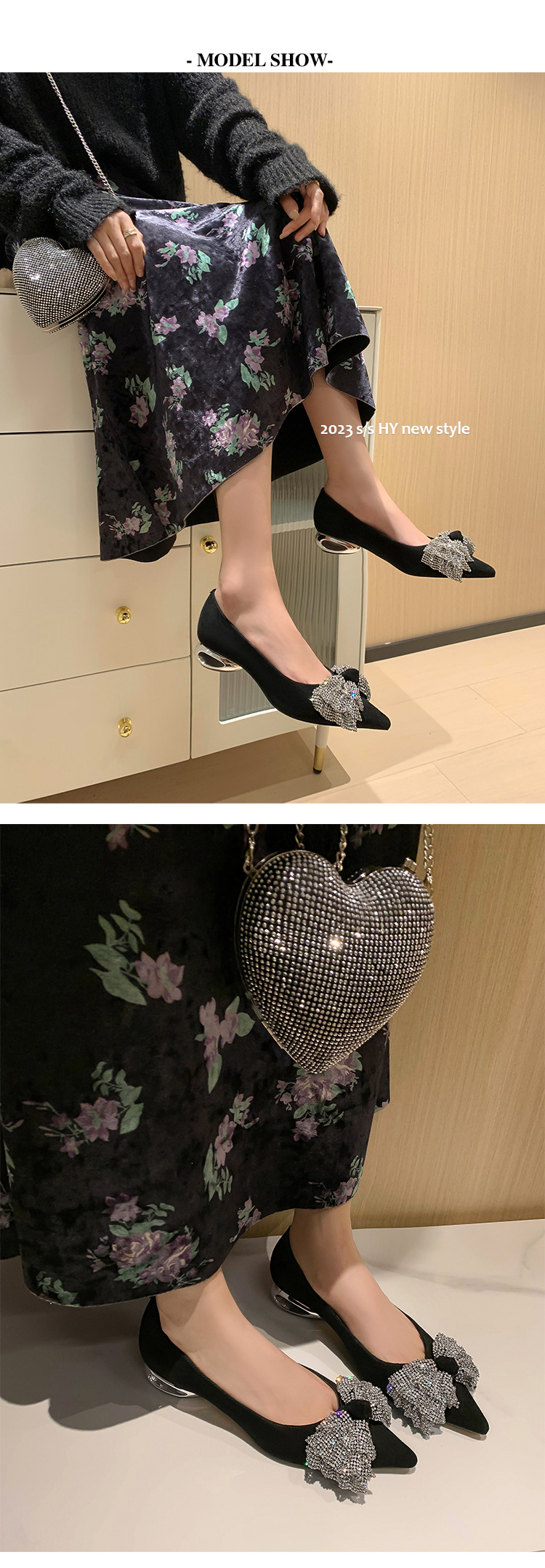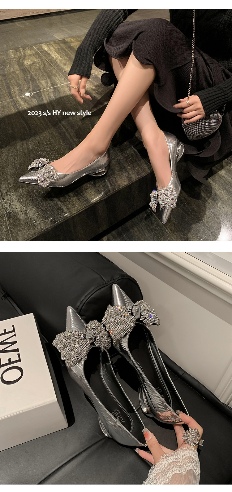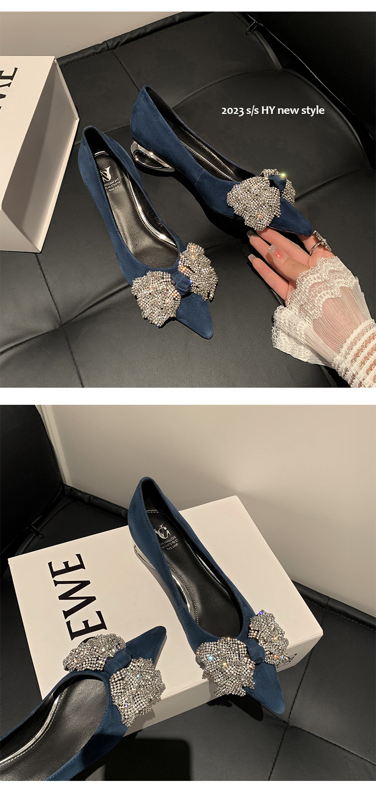 프랑스 스타일 Cowhide Rhinestone 활 낮은 발 뒤꿈치 신발 2024 봄과 여름 유럽 뾰족한 완두콩 신발 여성의 두꺼운 발 뒤꿈치 신발스토어 가기