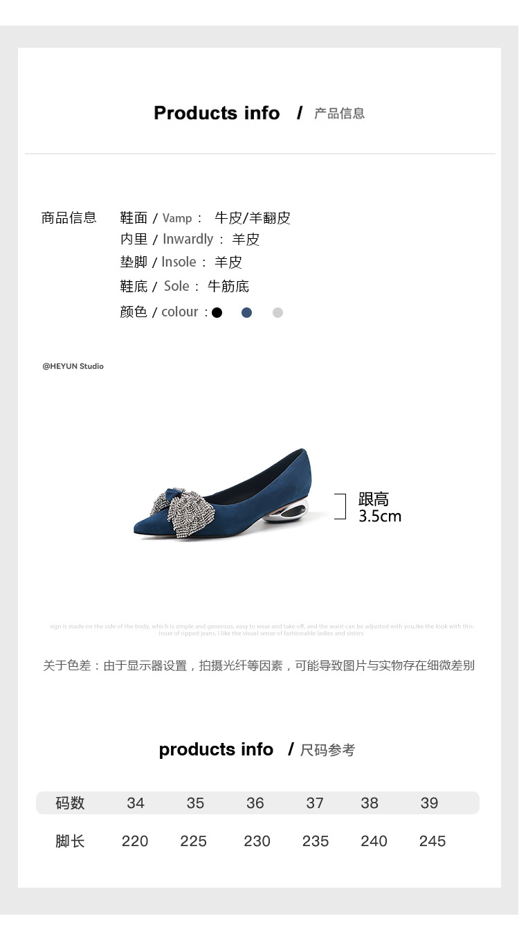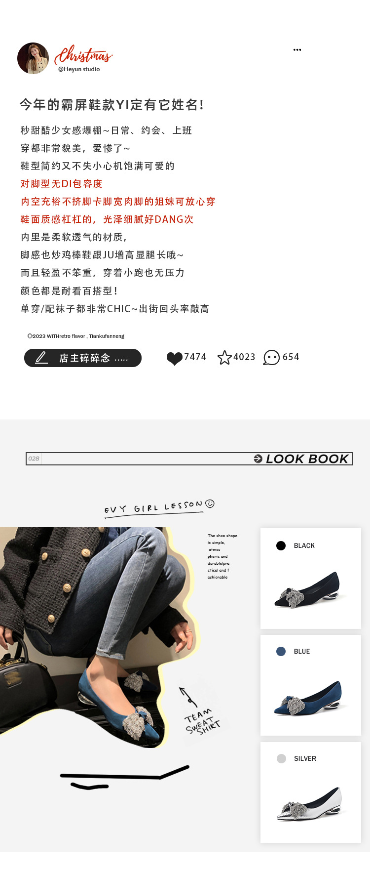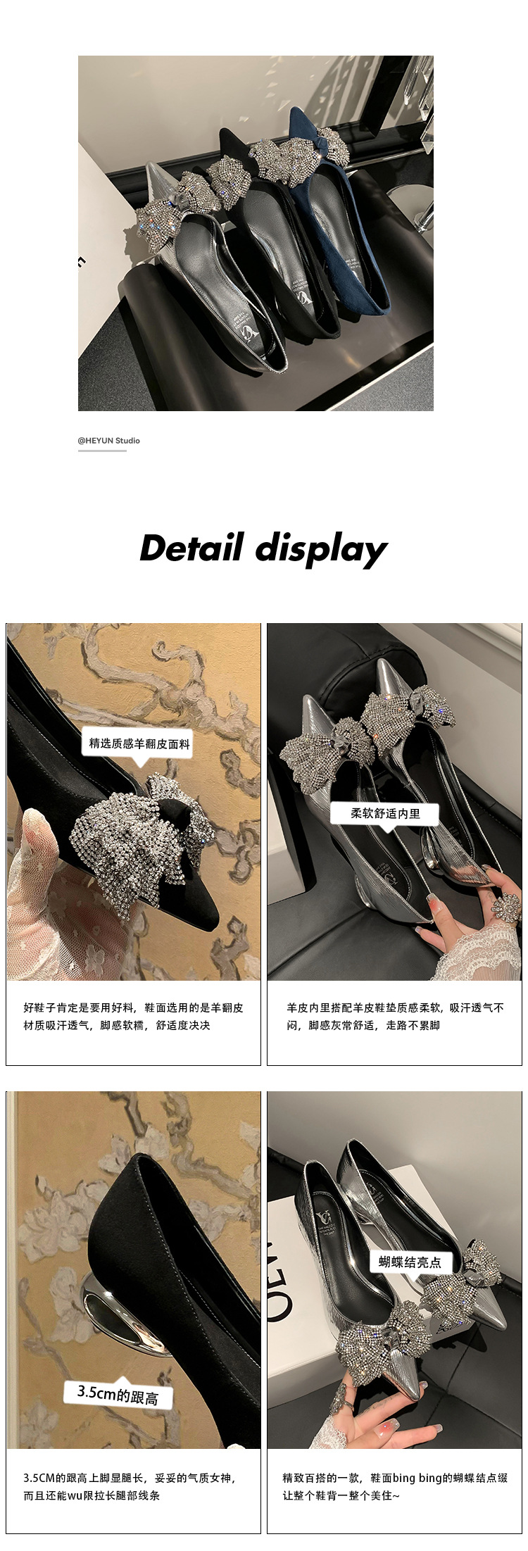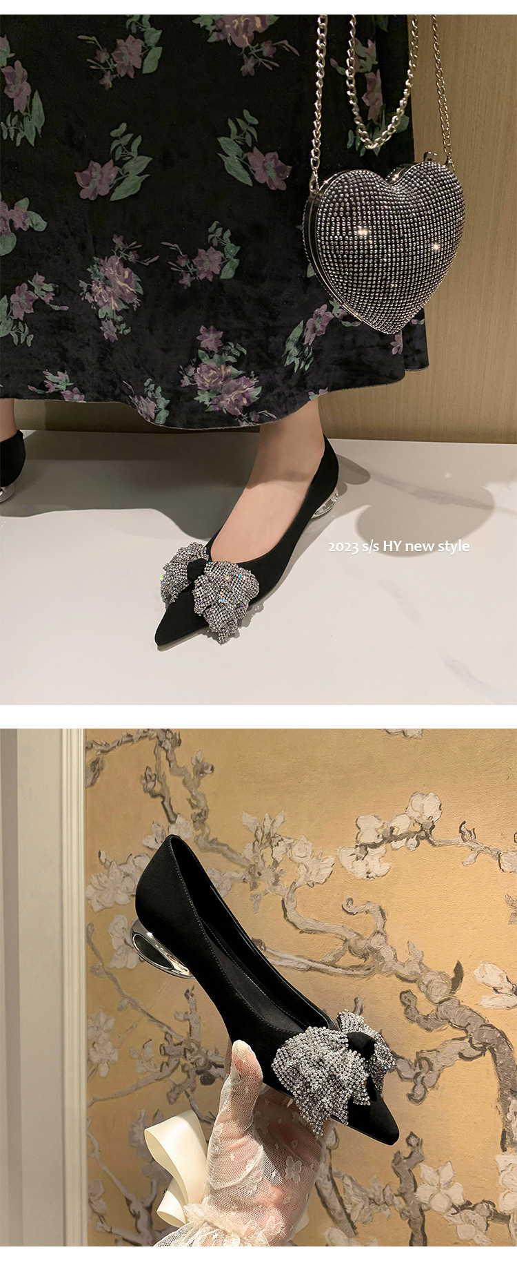 프랑스 스타일 Cowhide Rhinestone 활 낮은 발 뒤꿈치 신발 2024 봄과 여름 유럽 뾰족한 완두콩 신발 여성의 두꺼운 발 뒤꿈치 신발스토어 가기