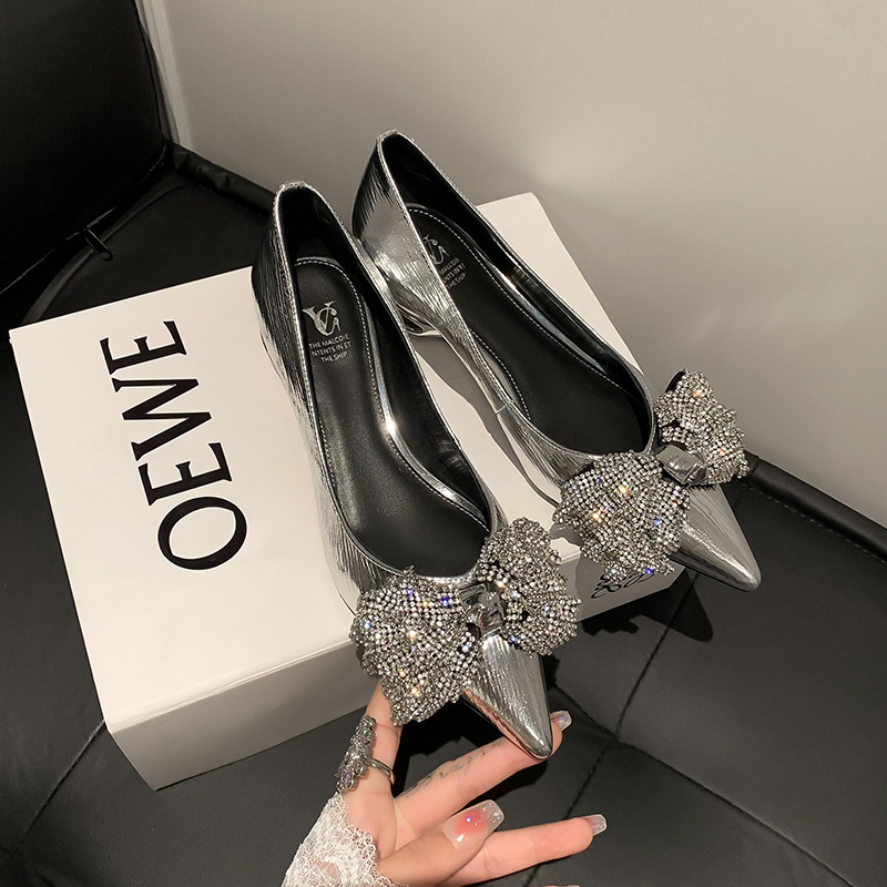 프랑스 스타일 Cowhide Rhinestone 활 낮은 발 뒤꿈치 신발 2024 봄과 여름 유럽 뾰족한 완두콩 신발 여성의 두꺼운 발 뒤꿈치 신발