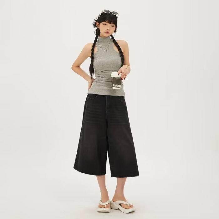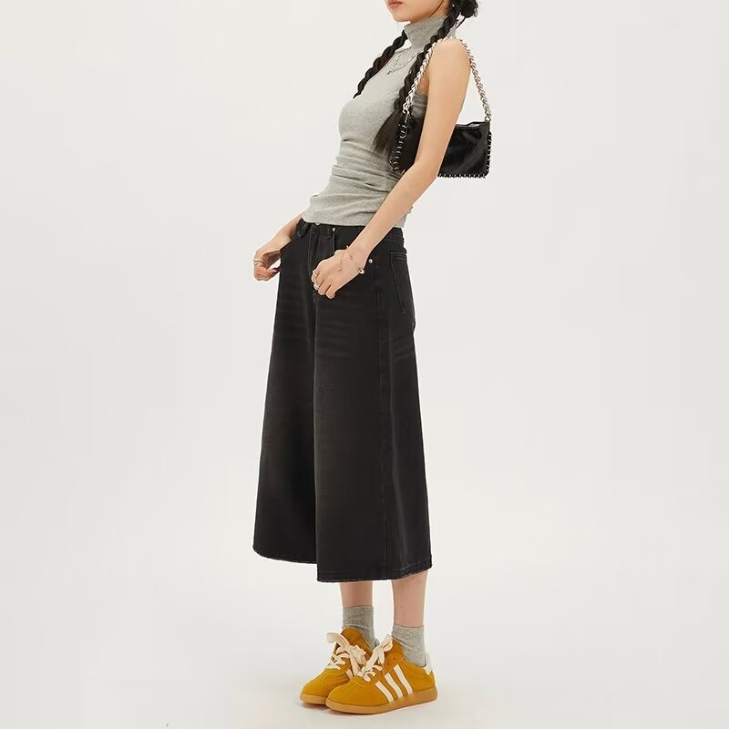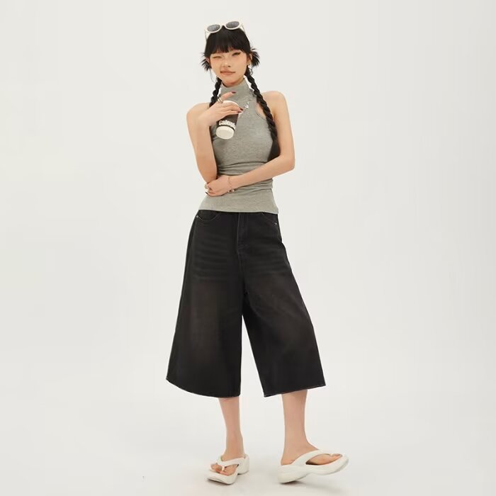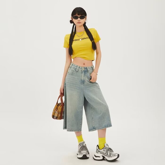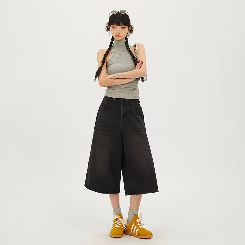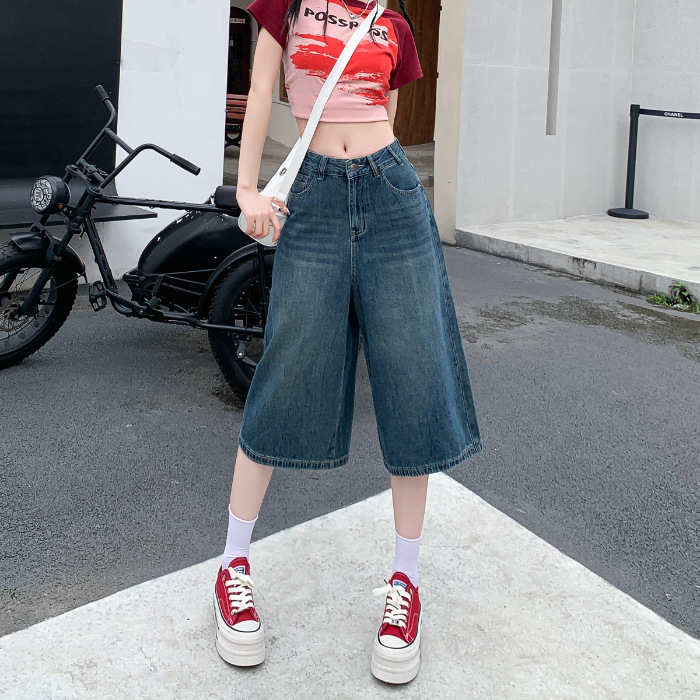 라이트 블루 데님 반바지 여성 여름 새로운 레트로 높은 허리 느슨한 스트레이트 바지 짧은 카프리 와이드 레그 바지