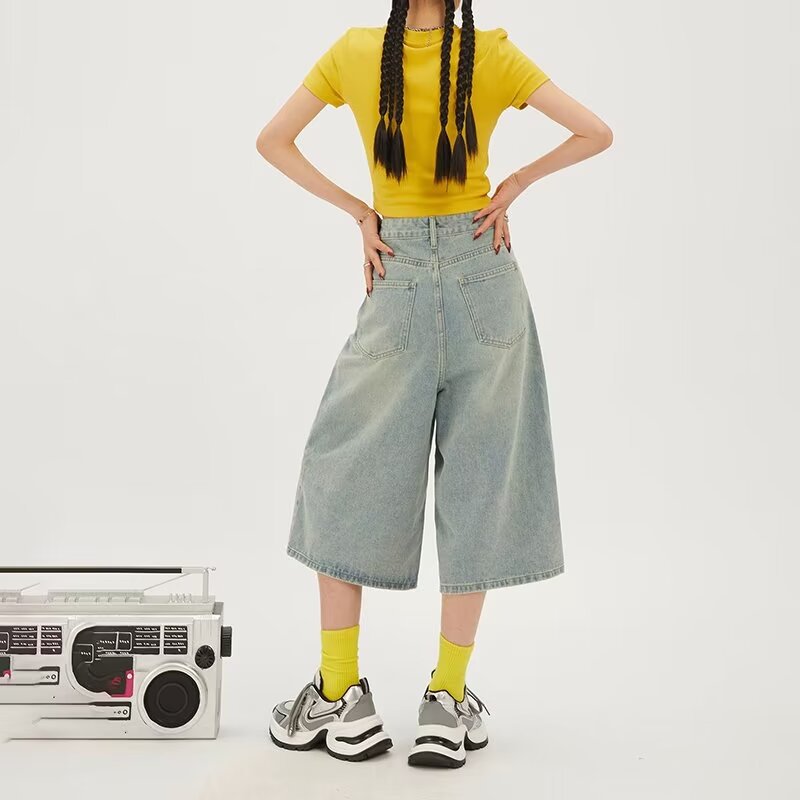 라이트 블루 데님 반바지 여성 여름 새로운 레트로 높은 허리 느슨한 스트레이트 바지 짧은 카프리 와이드 레그 바지스토어 가기