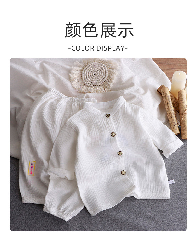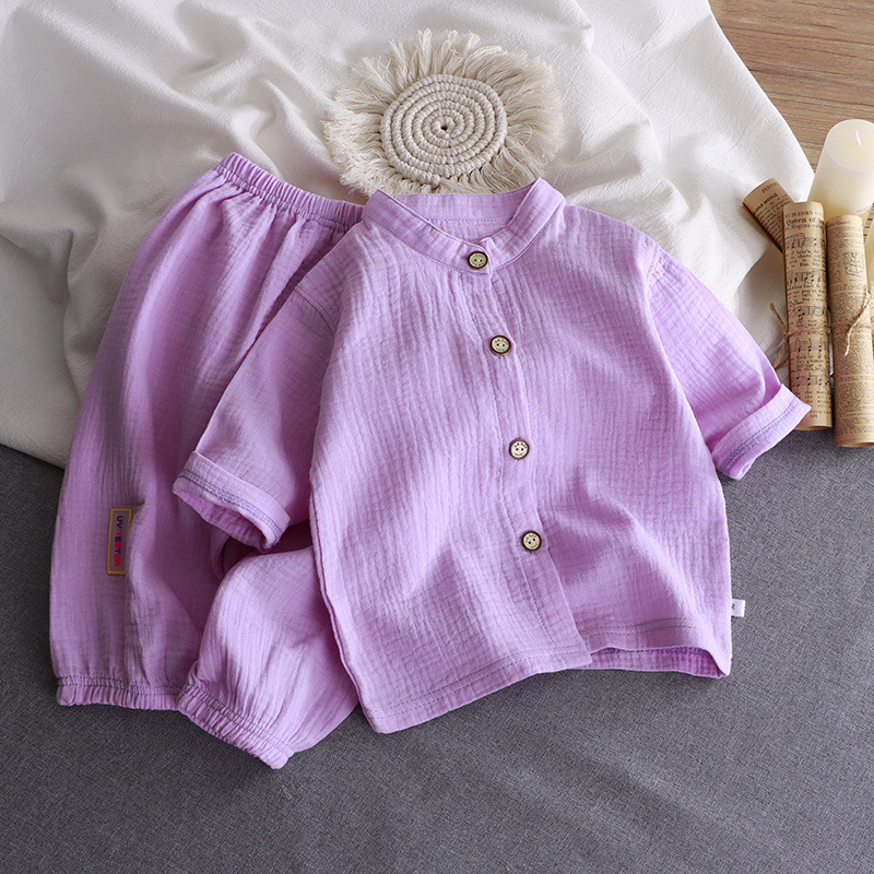 어린이 스탠드 칼라 면사 세트 여름 얇은 소년 소녀 면화 홈 옷 아기 거즈 에어컨 옷 아동복