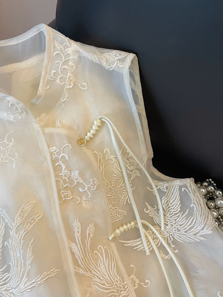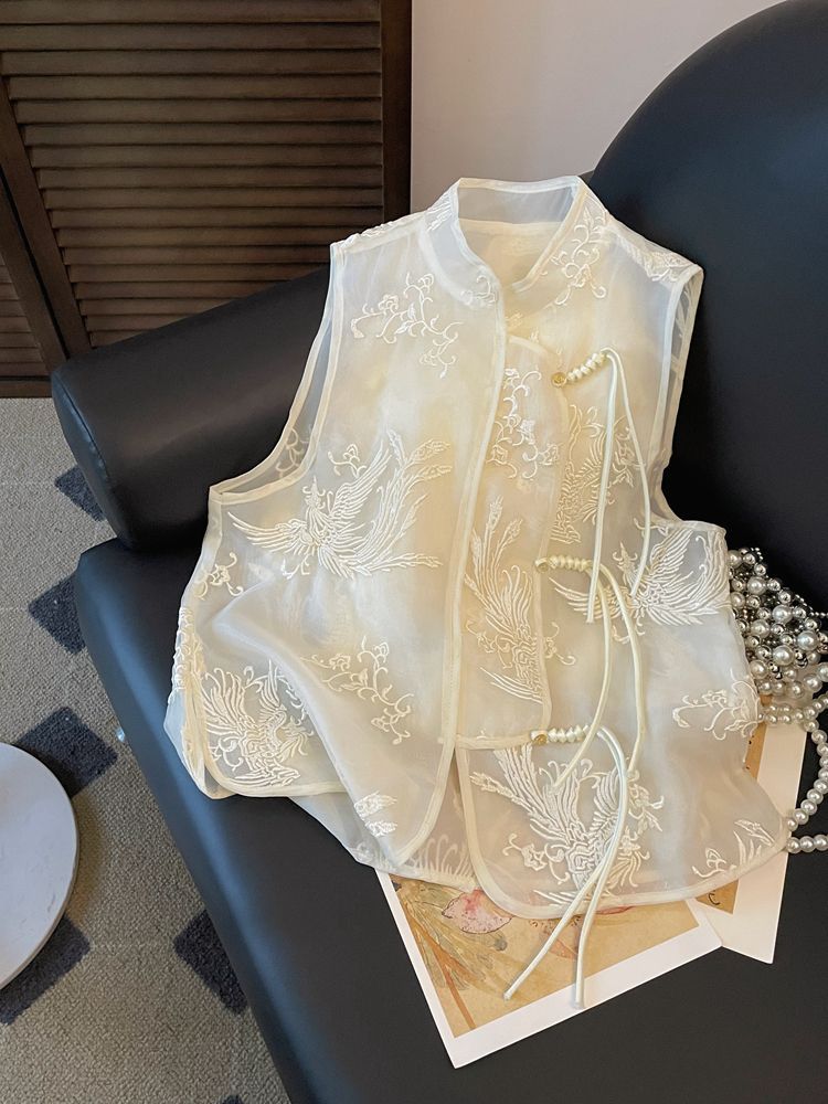 새로운 중국 스타일 국가 스타일 자수 2024 여름 새로운 칼라 조끼 여성 여름 탕 원피스 레이스 스티칭 조끼 탑스토어 가기