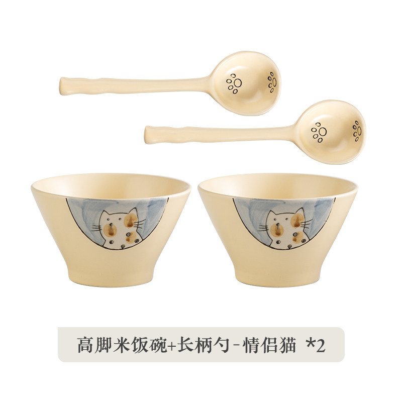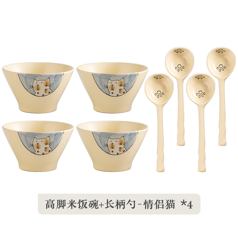 • 긴 손잡이 숟가락이있는 높은 다리 밥 그릇-커플 고양이 (4 팩)