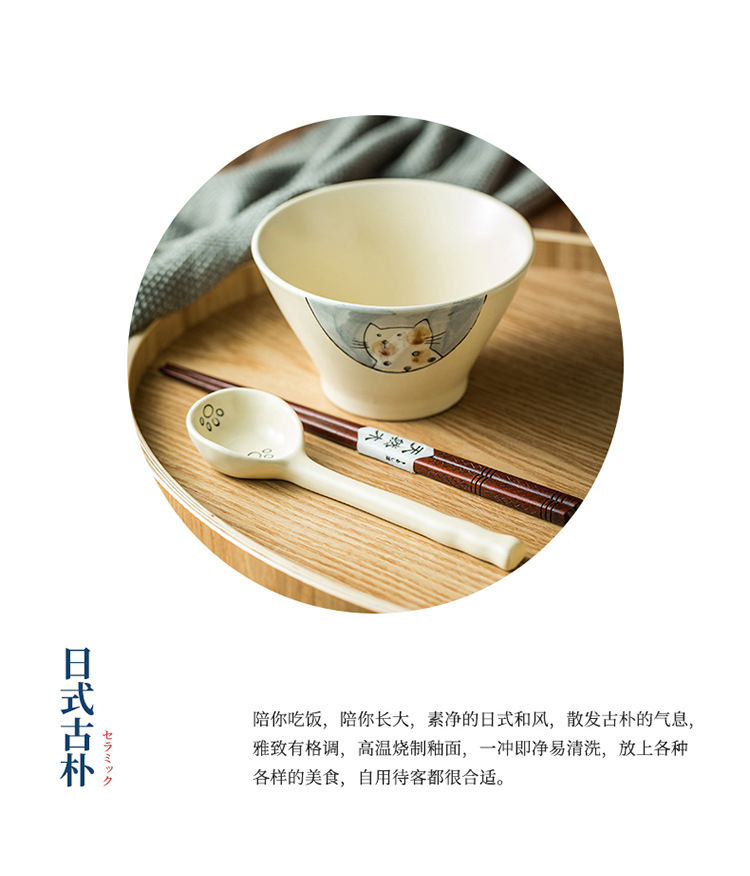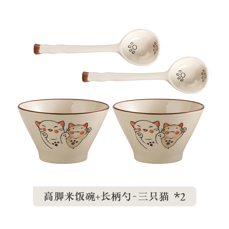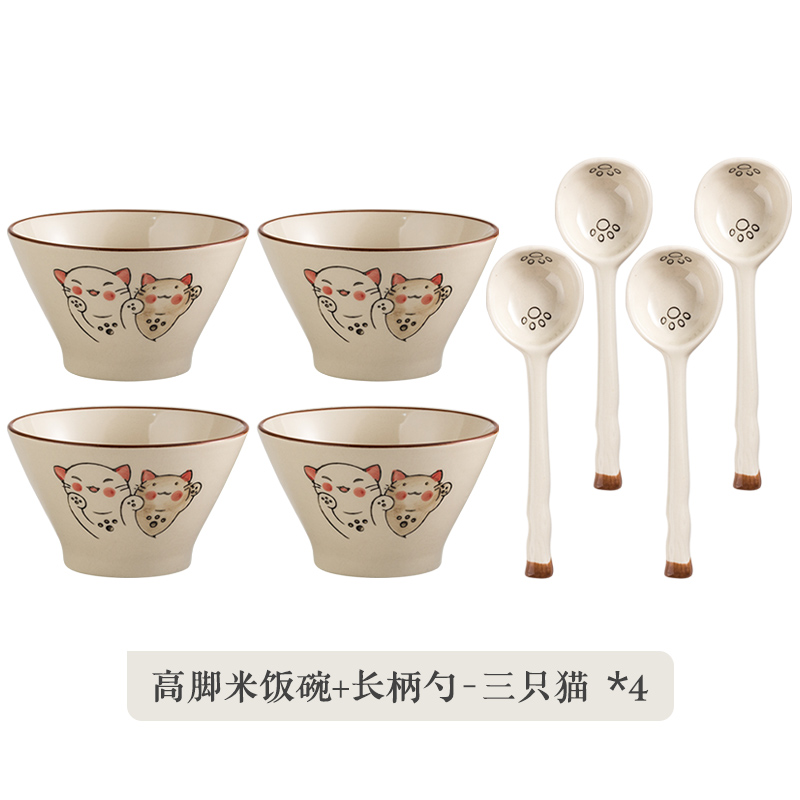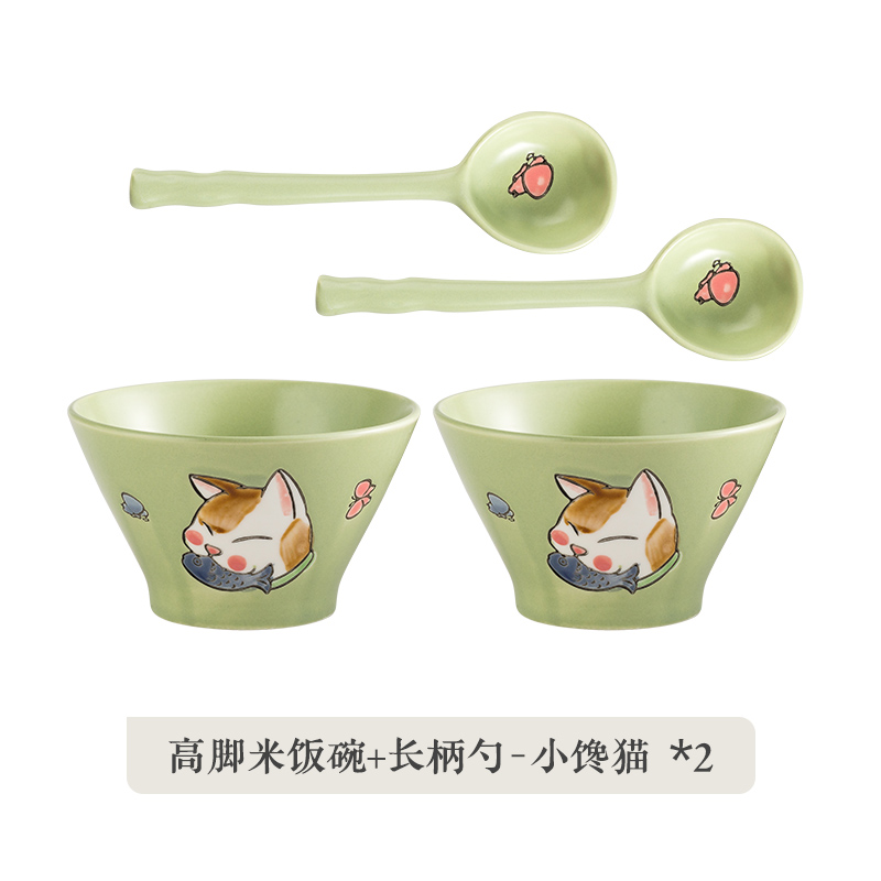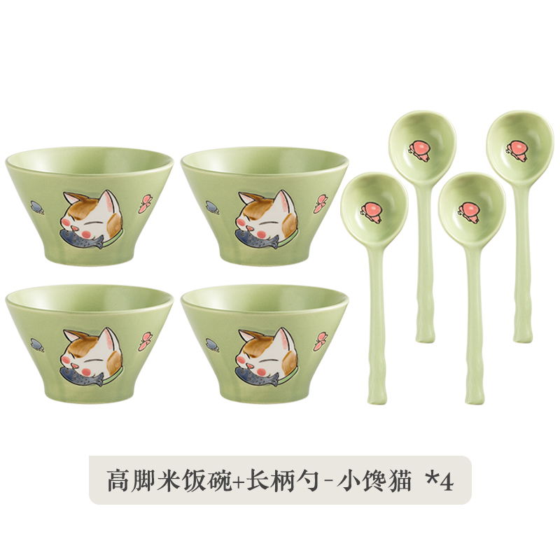 • 긴 손잡이 숟가락이있는 높은 다리 밥 그릇-작은 욕심 많은 고양이 (4 pcs)