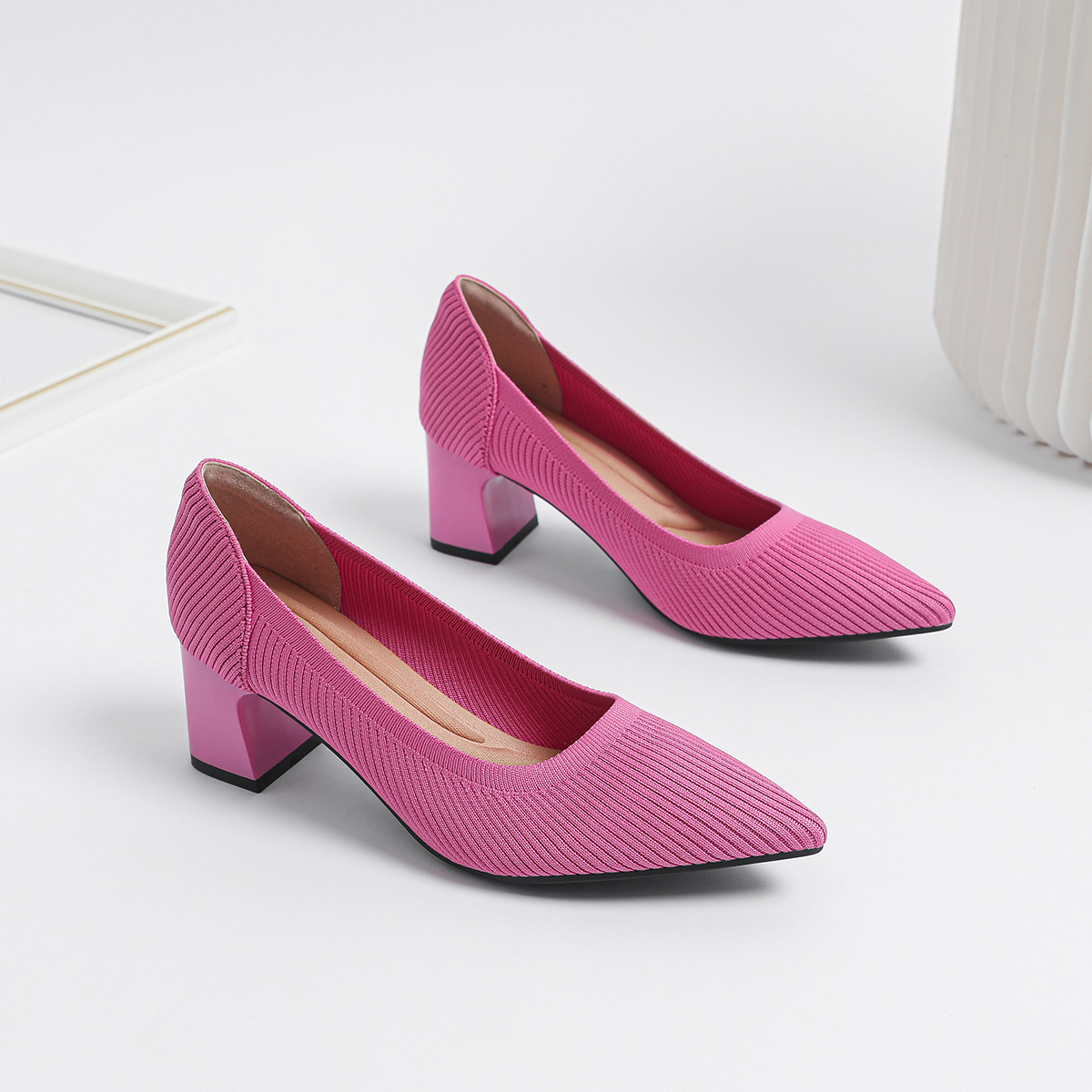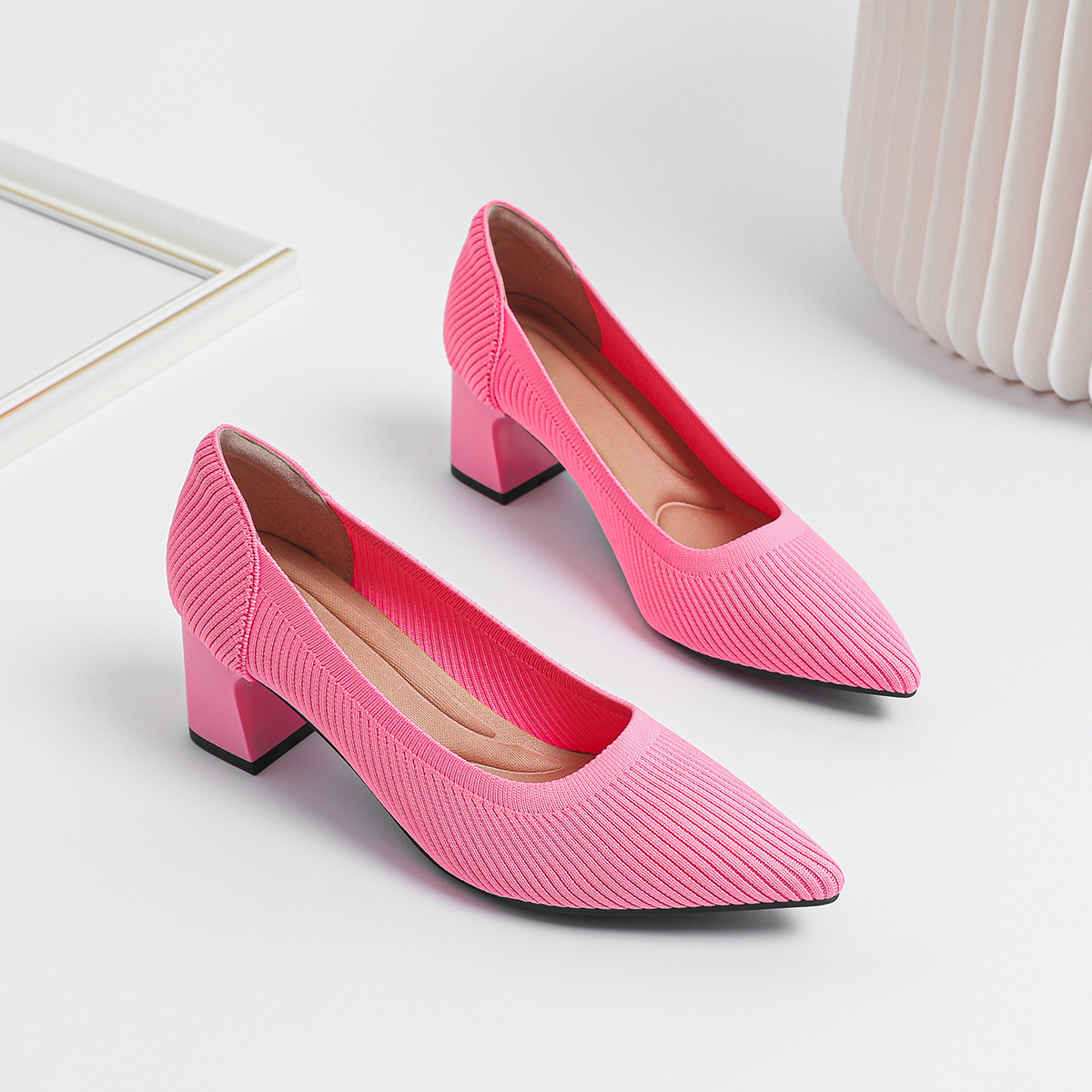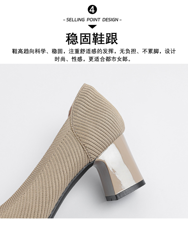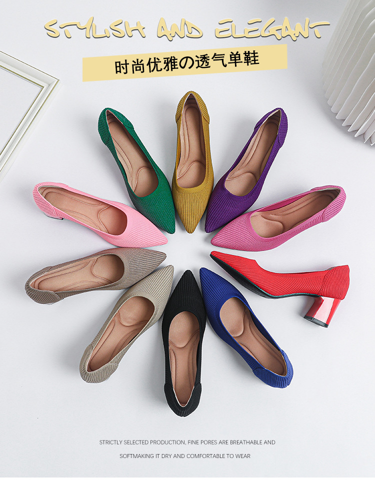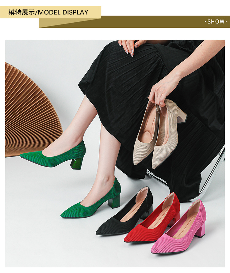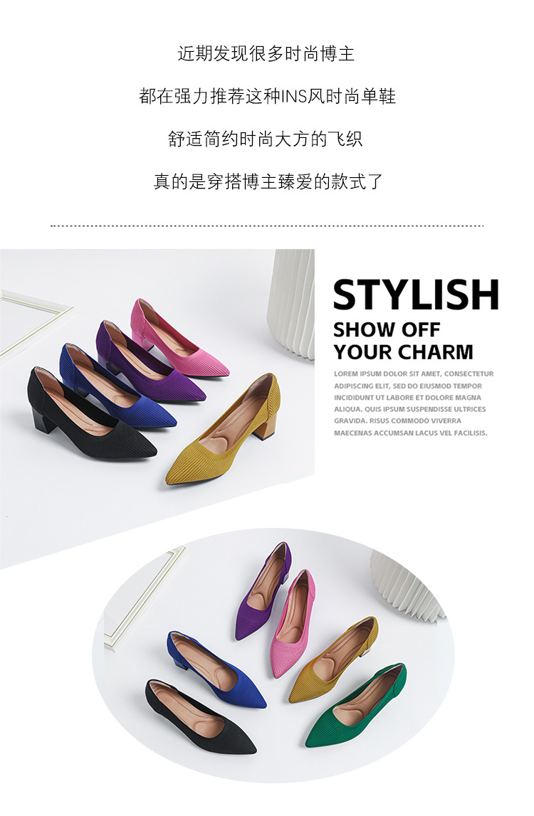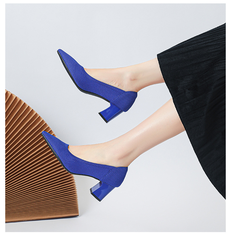 하이힐 스트레이트 패턴 슈즈, 패셔너블한 뾰족코 플라이 니트 슈즈, 얕은 굽의 두꺼운 굽 패션 슈즈, 여성스러운 하이힐 트렌드