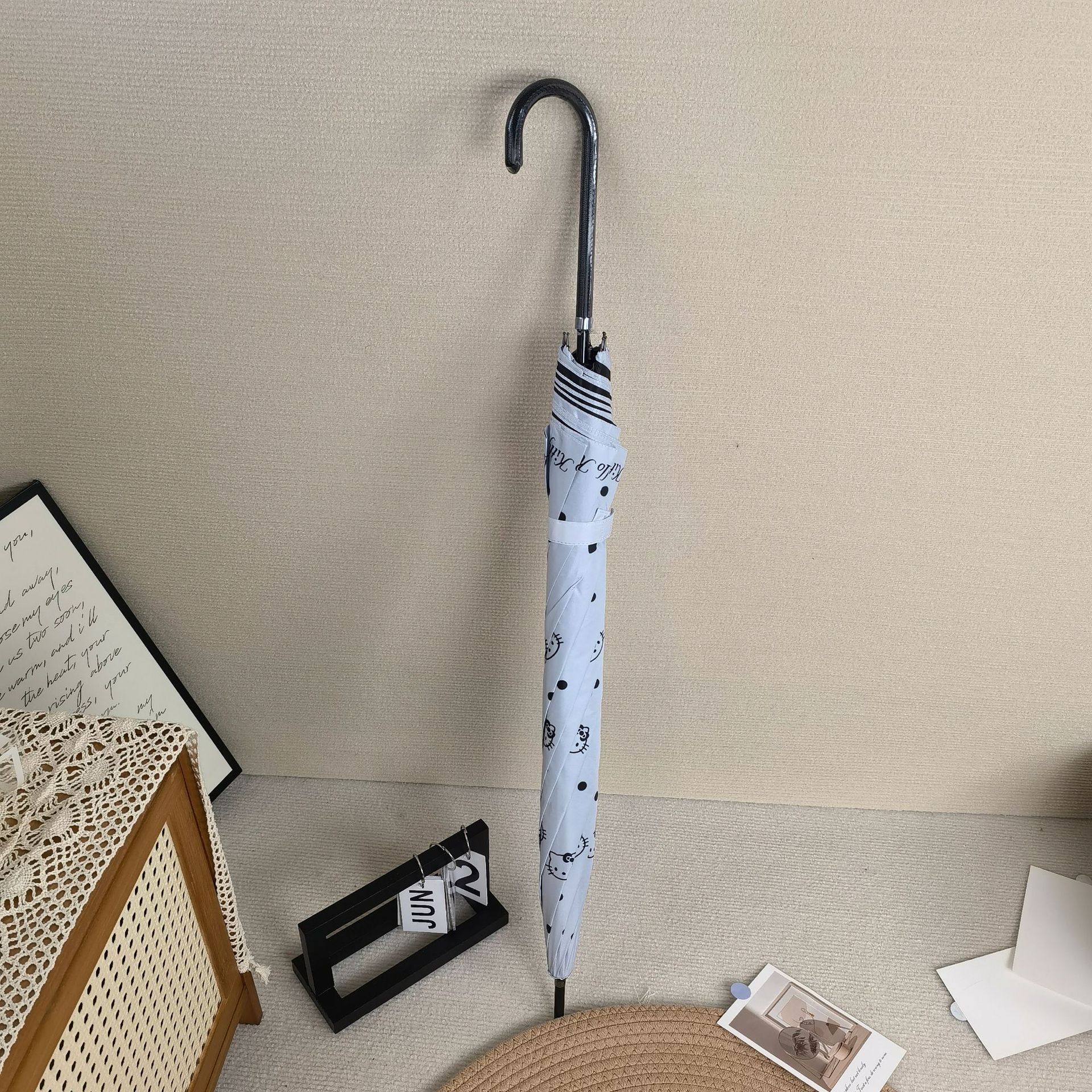 • 검은색 & 흰색 꼬마 K 고양이 롱 핸들 양산 - 블랙 코팅 두께 강화