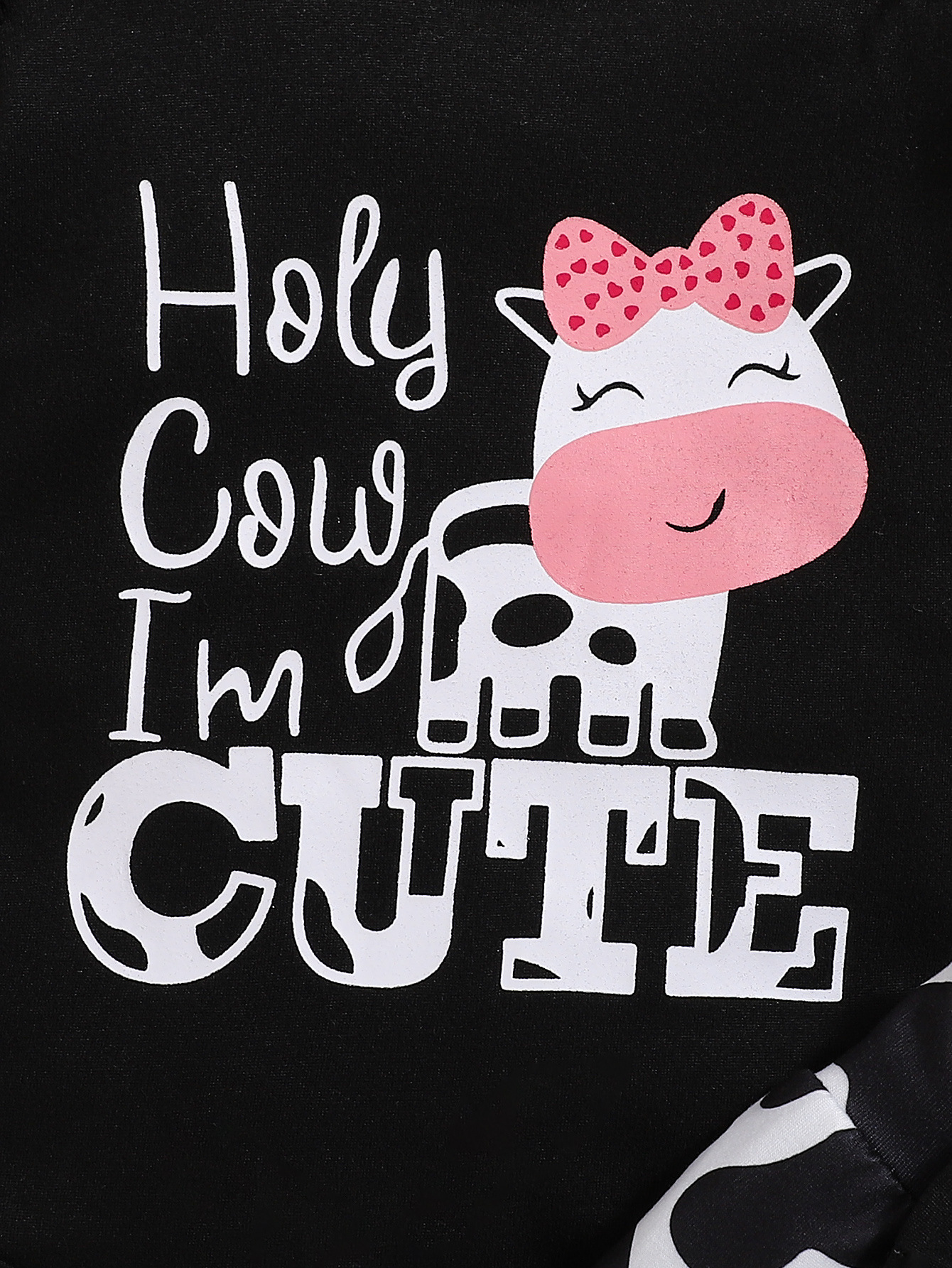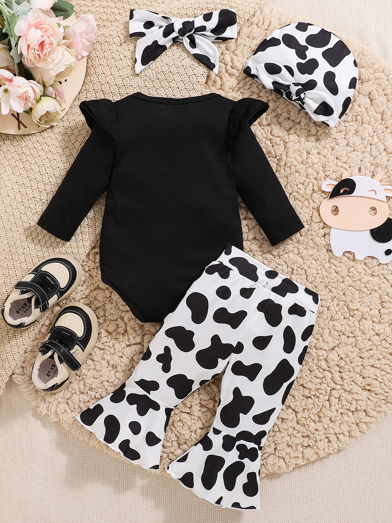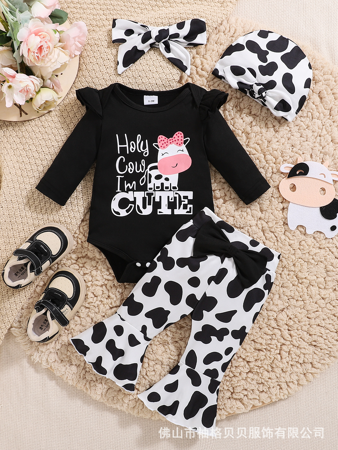 신생아 봄 여름 유럽과 미국의 긴 소매 만화 편지 인쇄 된 바지 암소 인쇄 된 머리띠 모자 세트
