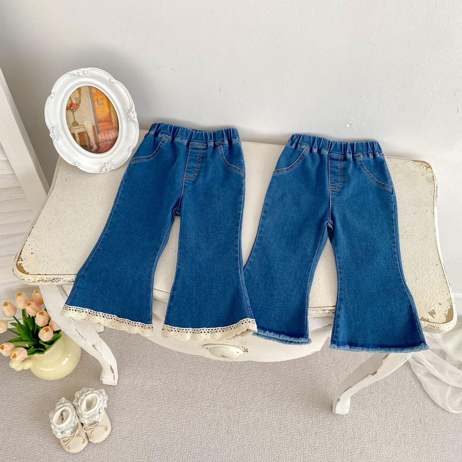 가을 2024 Ins 어린이 바지 소녀 아기 바지 간단한 슬림 핏 마이크로 플레어 바지 캐주얼 올 매치 청바지스토어 가기