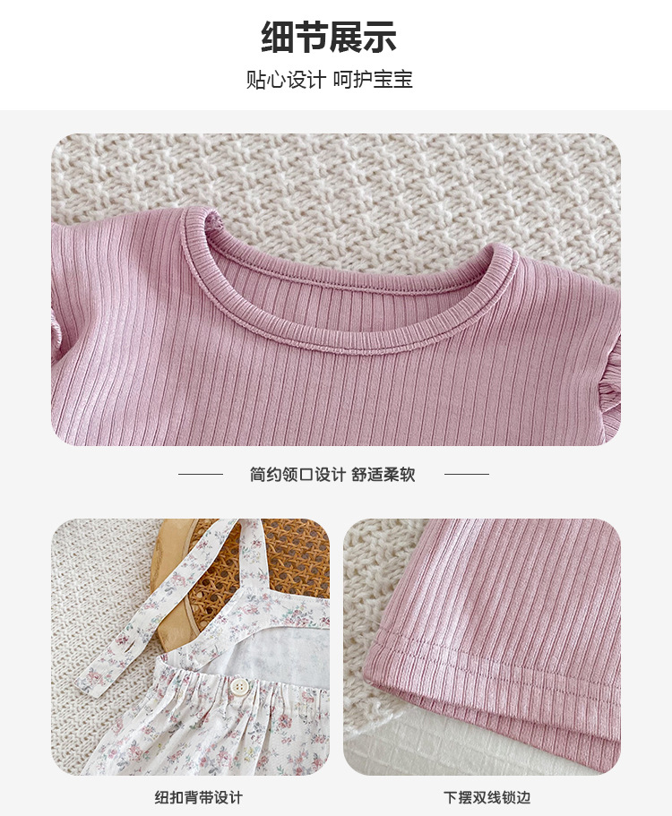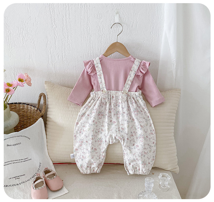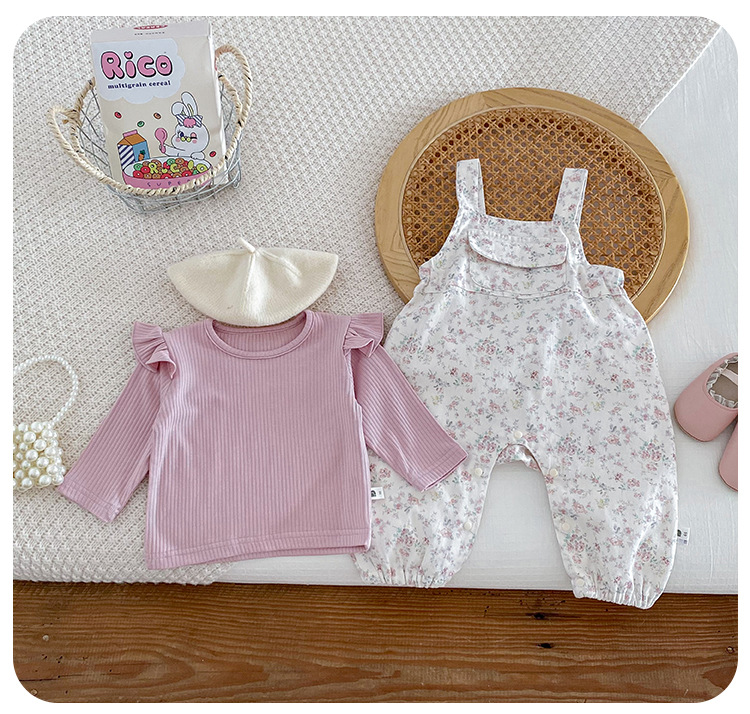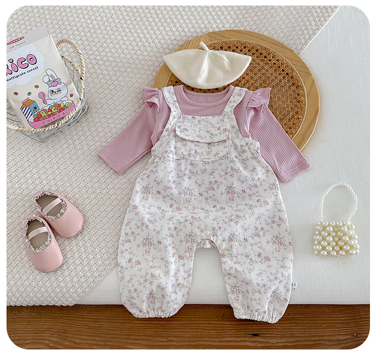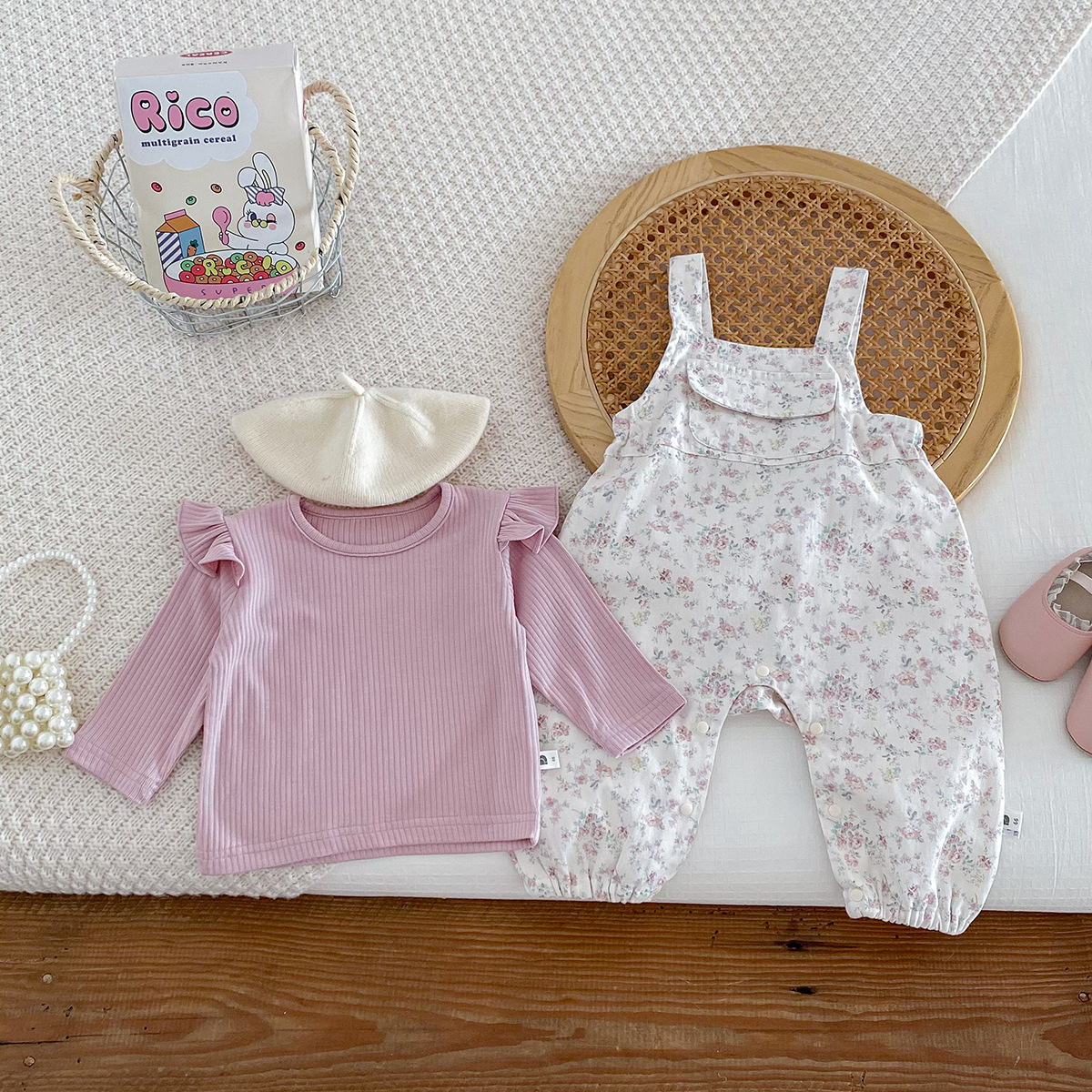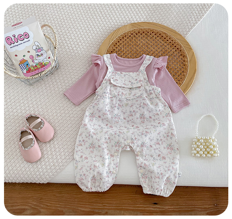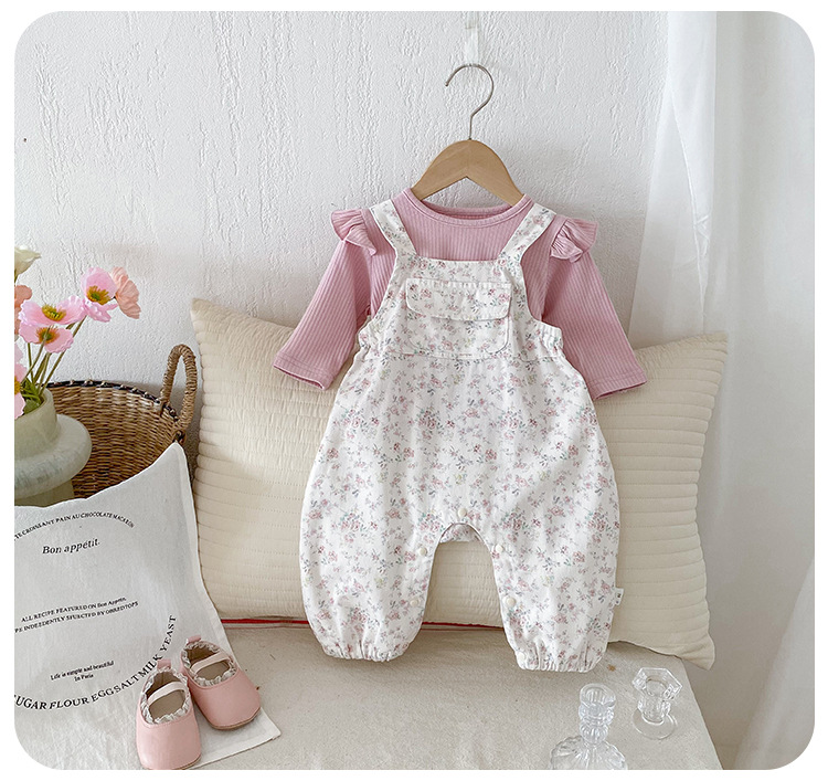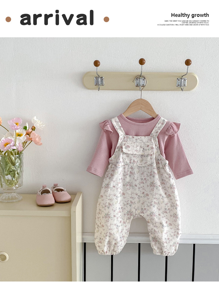 Dianxi 봄과 가을 2025 새로운 아기 소녀 점프 슈트 아기 바닥 셔츠 꽃 서스펜더 바지 투피스 세트