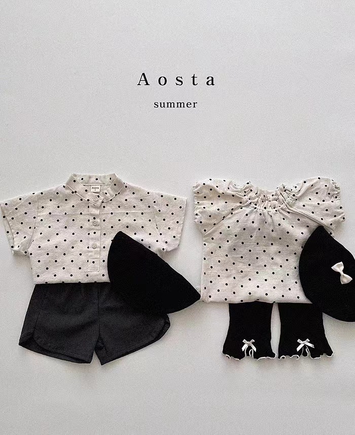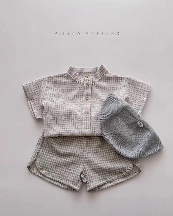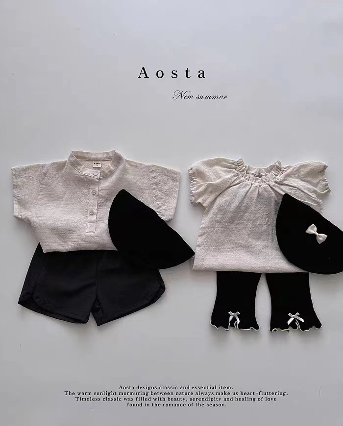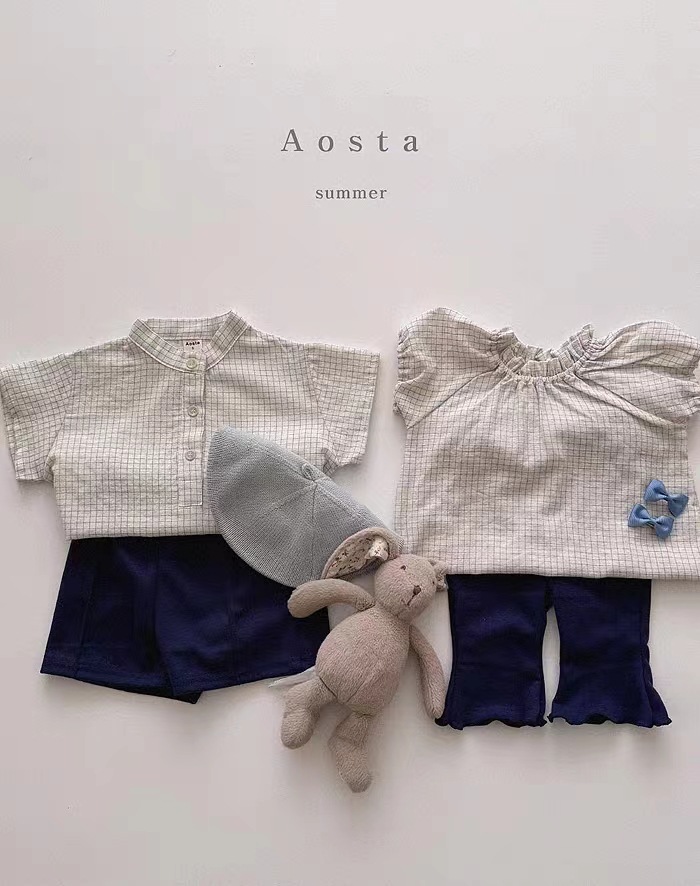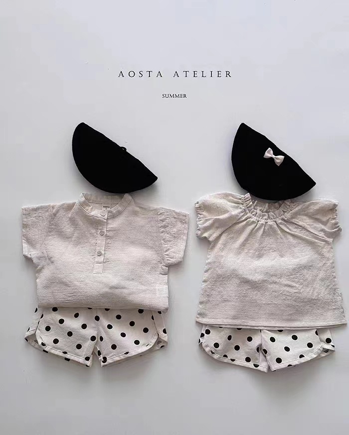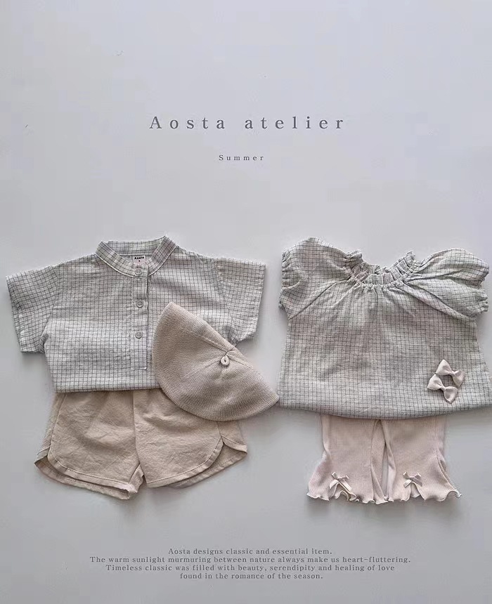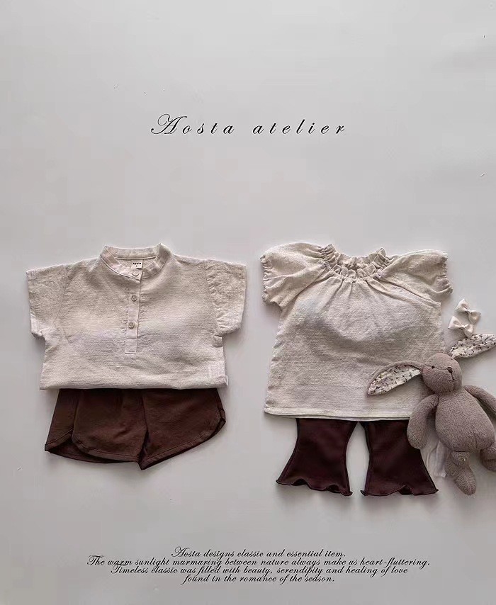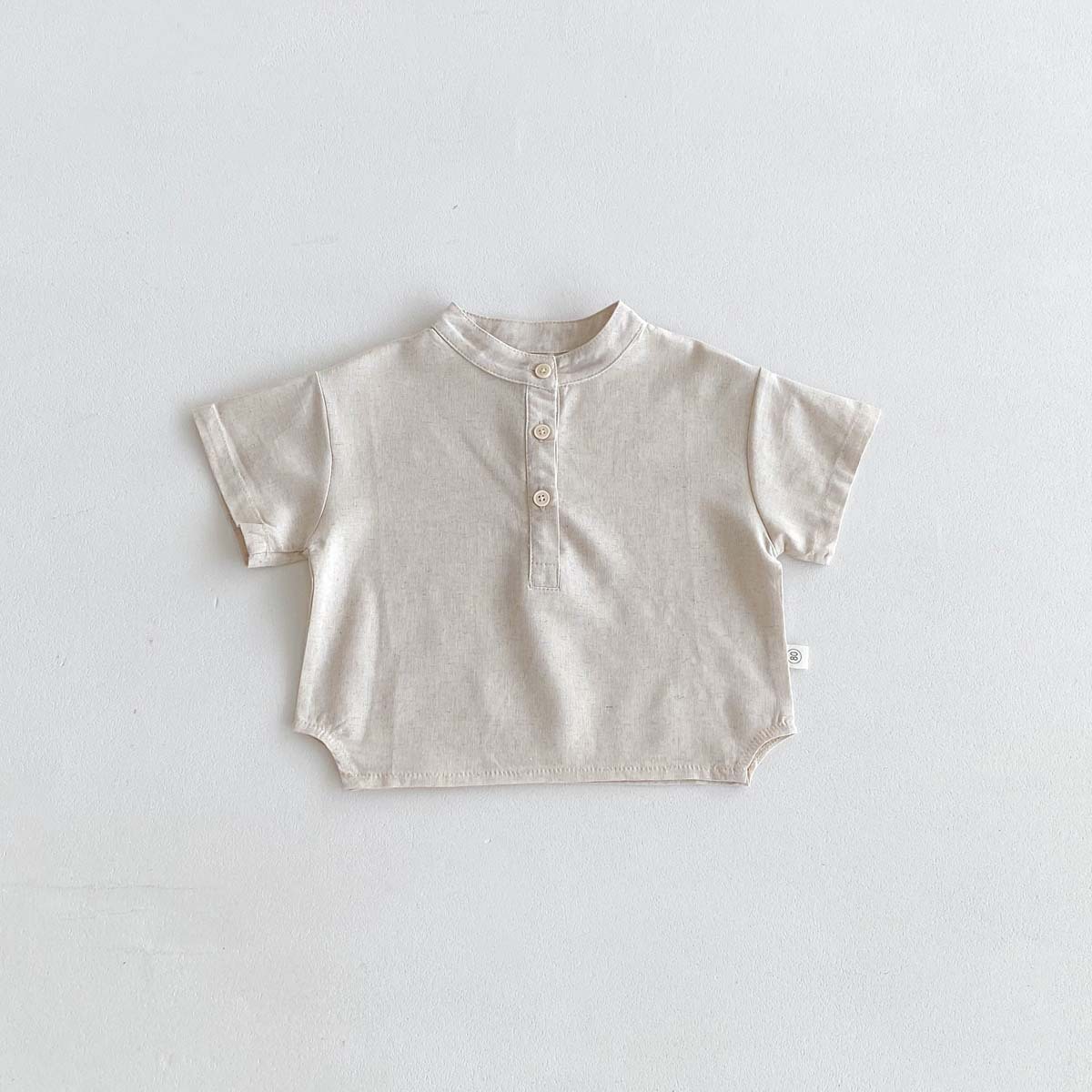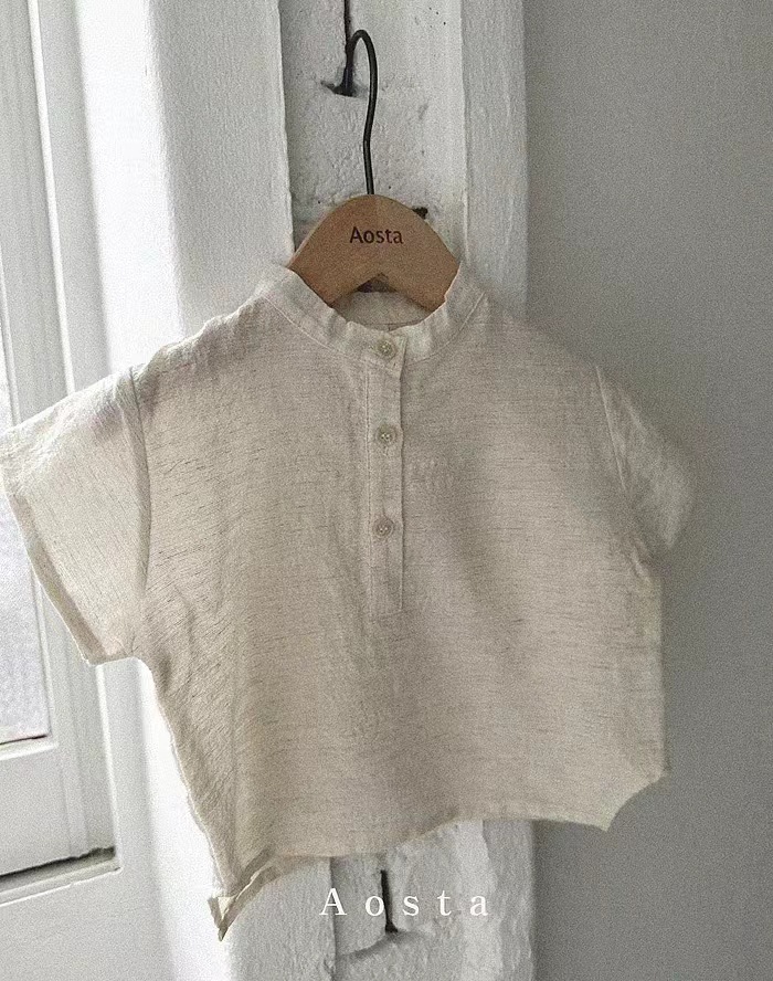 아기와 유아의 한국식 얇은면과 린넨 수직 칼라 반팔 셔츠 정상 소년 소녀를위한 캐주얼 느슨한 여름 외출 유행 의상스토어 가기