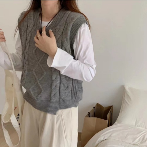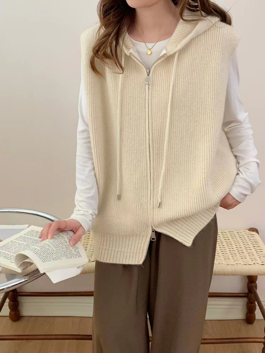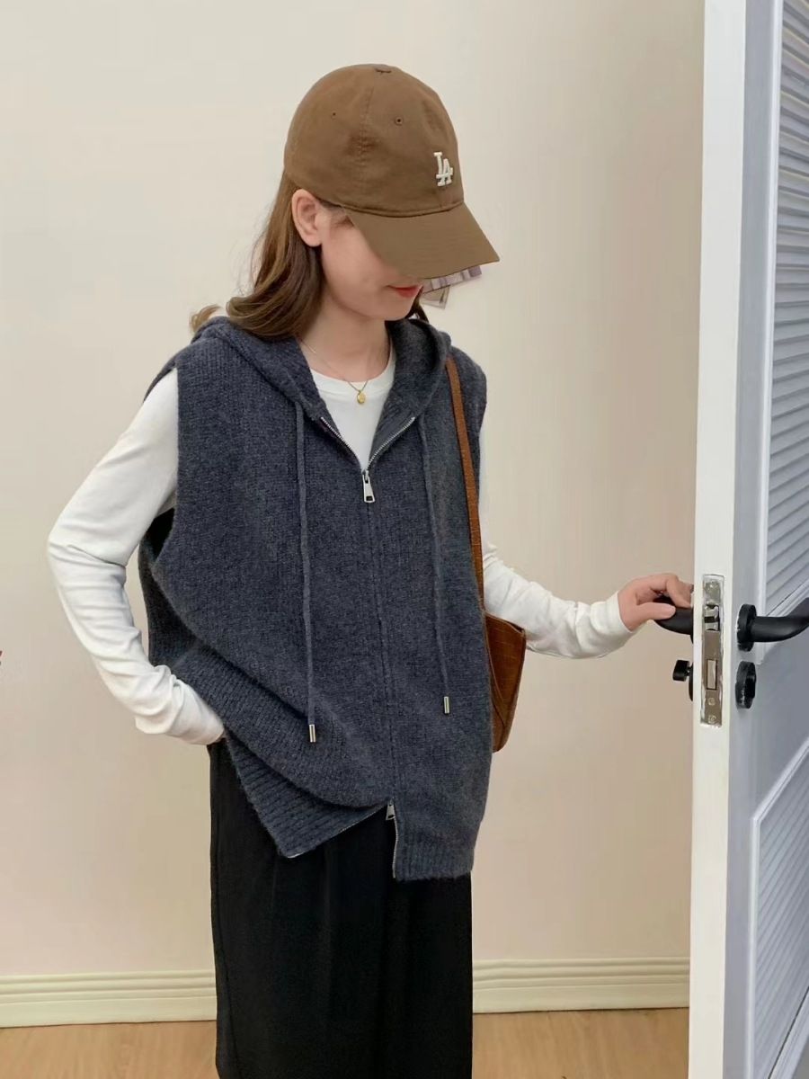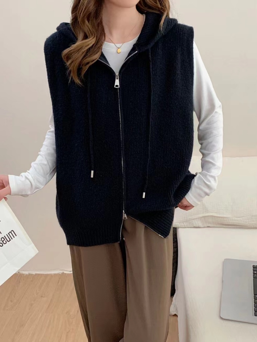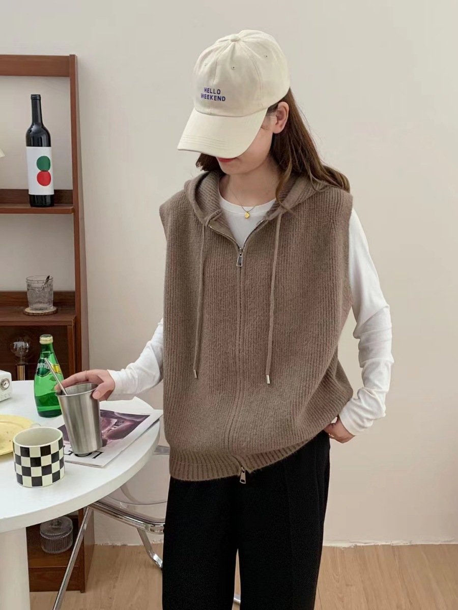 가을과 겨울 새로운 한국 스타일 느슨한 플러스 사이즈 후드 지퍼 민소매 캐주얼 편안한 니트 조끼 웨이스트 코트 여성 조끼스토어 가기