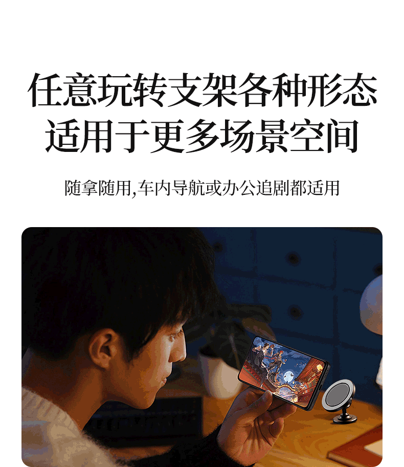 2:新一代分体式悬浮支架,调节角度更广,手机视角更全面。