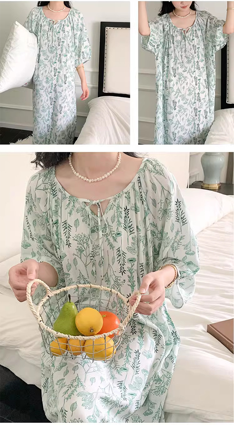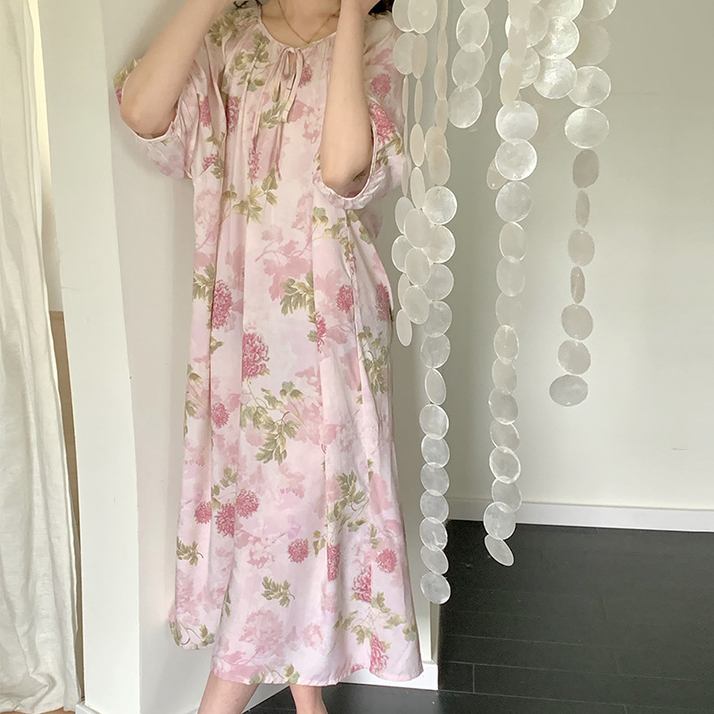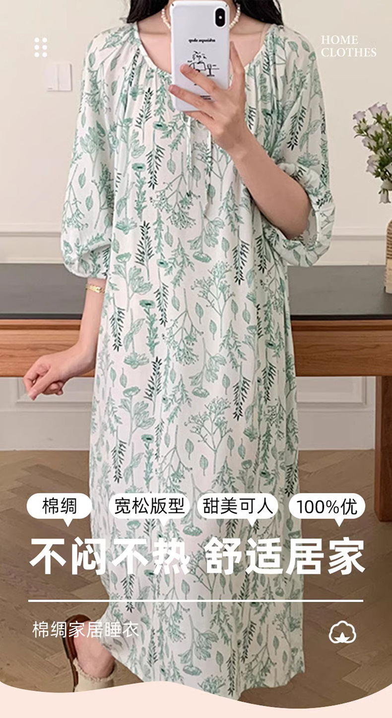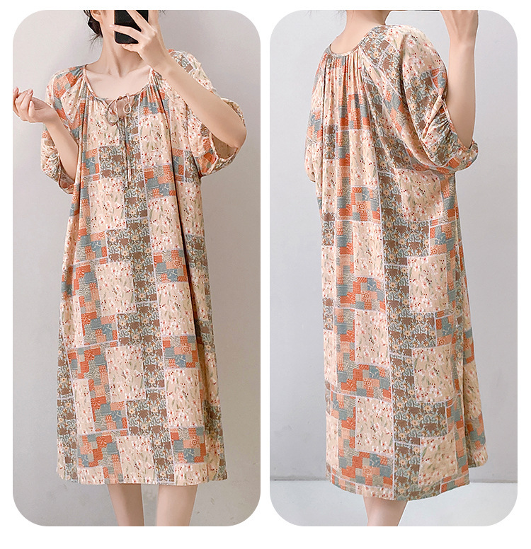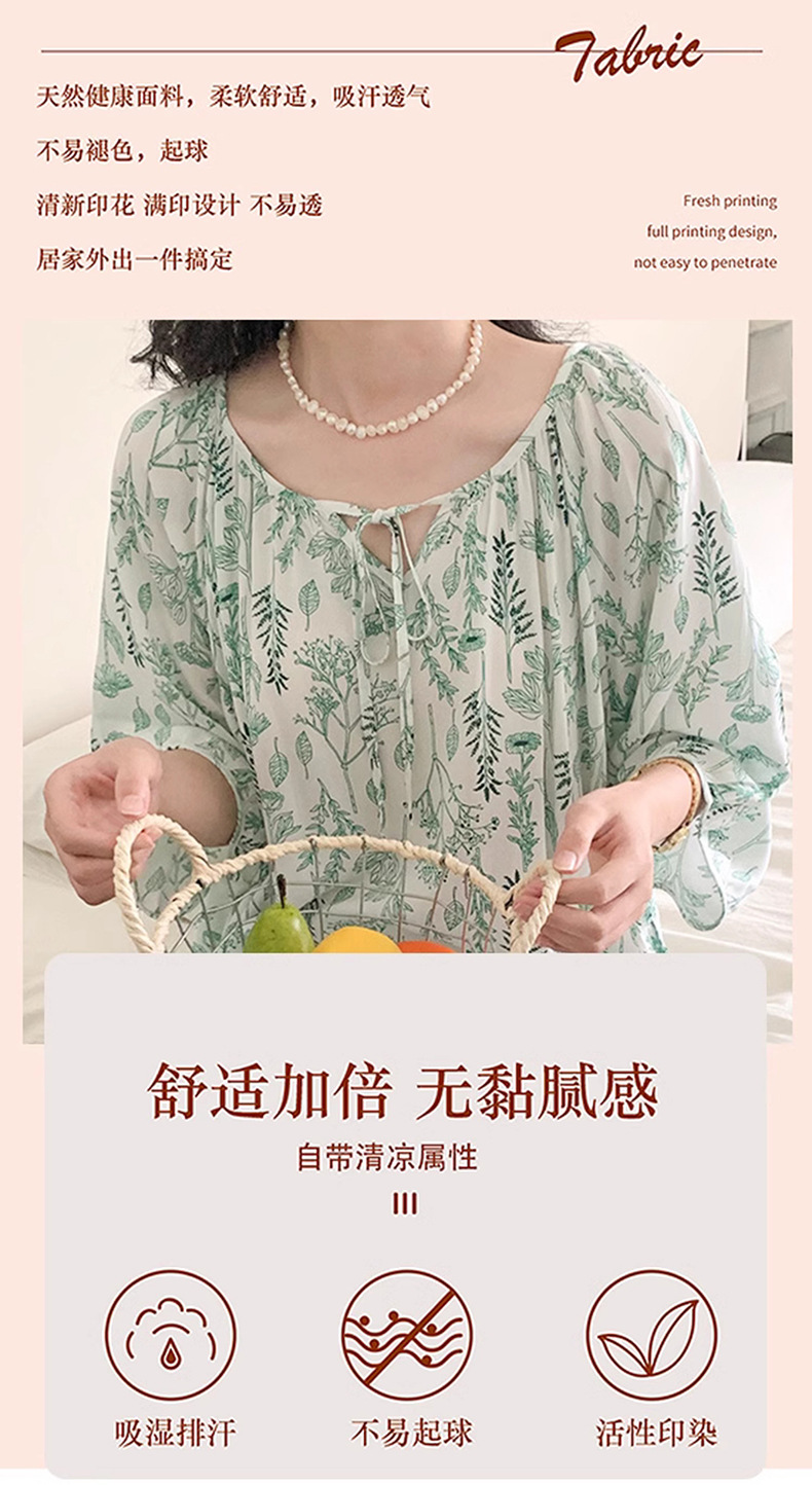여성을위한 새로운 중국 스타일의 면 실크 잠옷 여름 얇은 느슨한 편안한 드레이프 반팔 라운드 넥 인공 면화 가정 의류스토어 가기