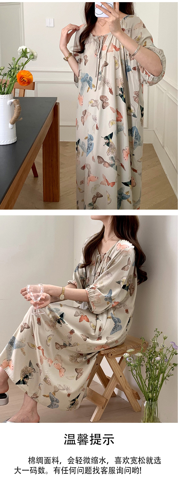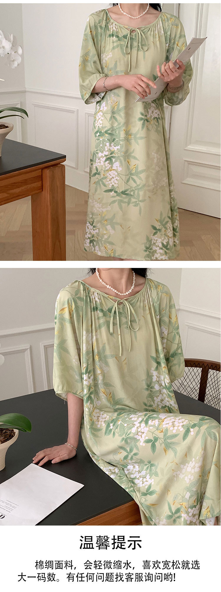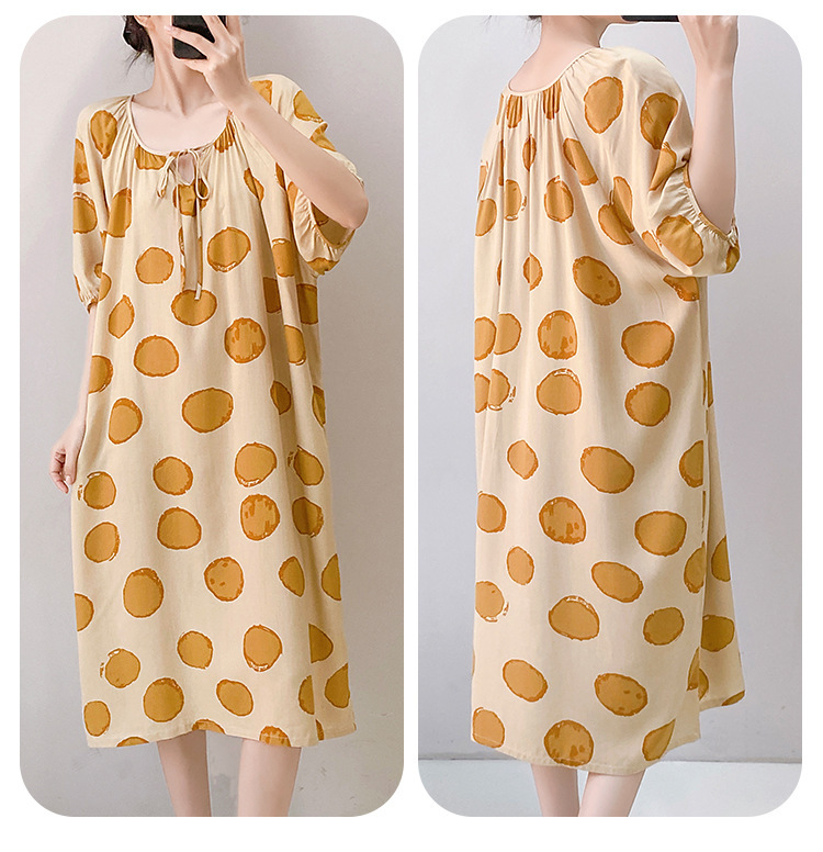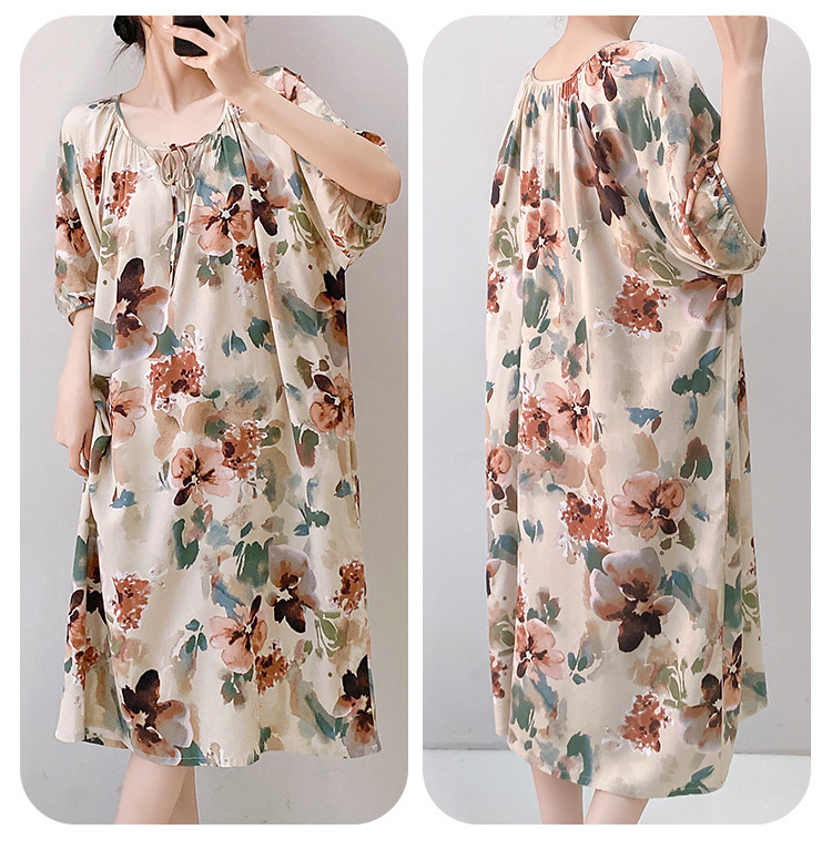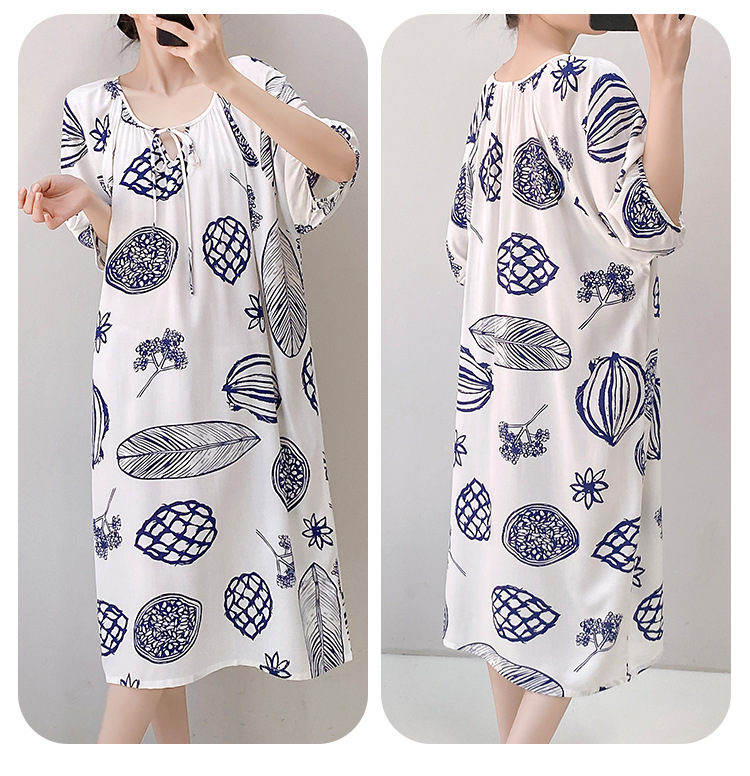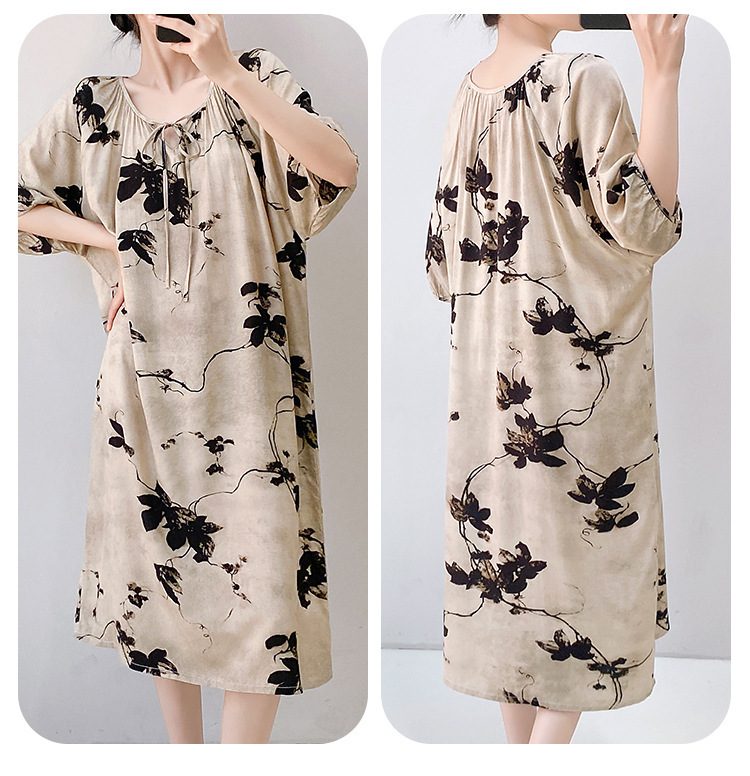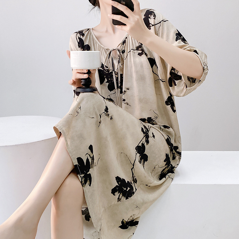 여성을위한 새로운 중국 스타일의 면 실크 잠옷 여름 얇은 느슨한 편안한 드레이프 반팔 라운드 넥 인공 면화 가정 의류스토어 가기