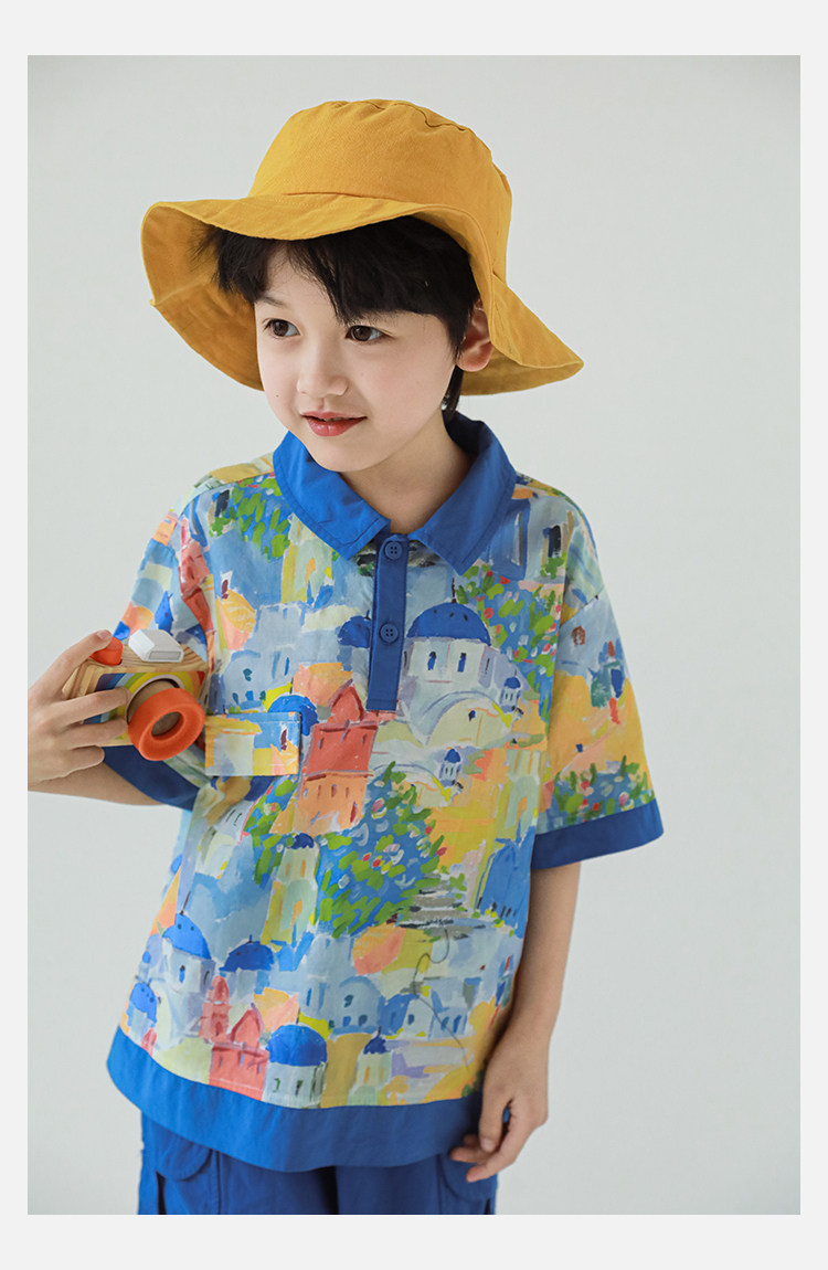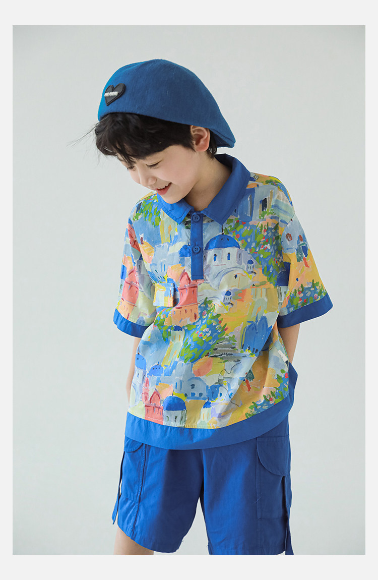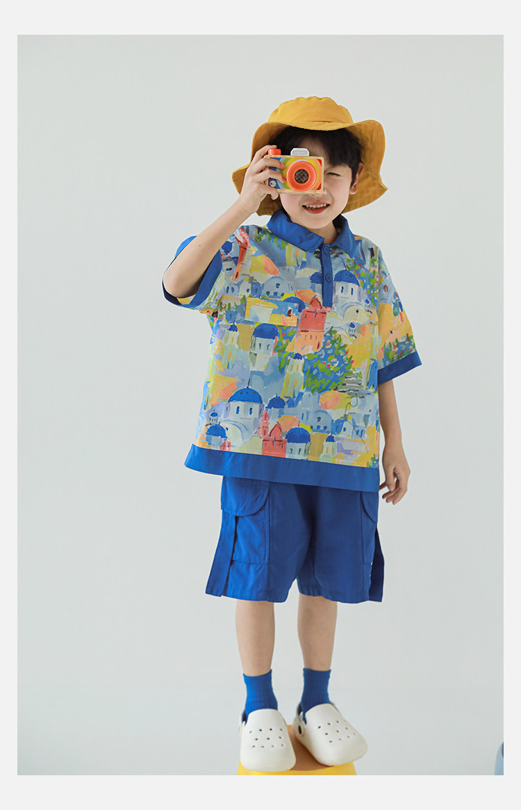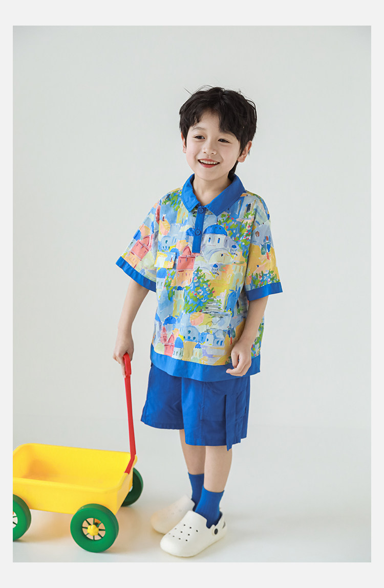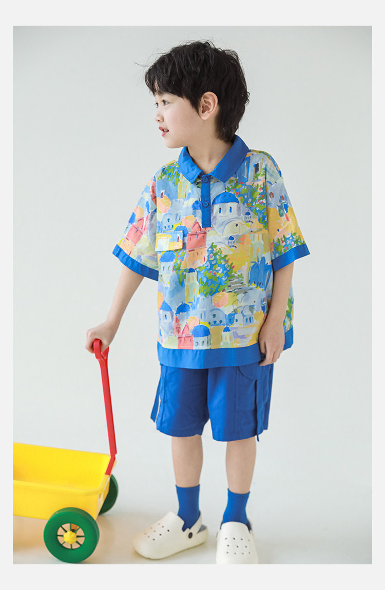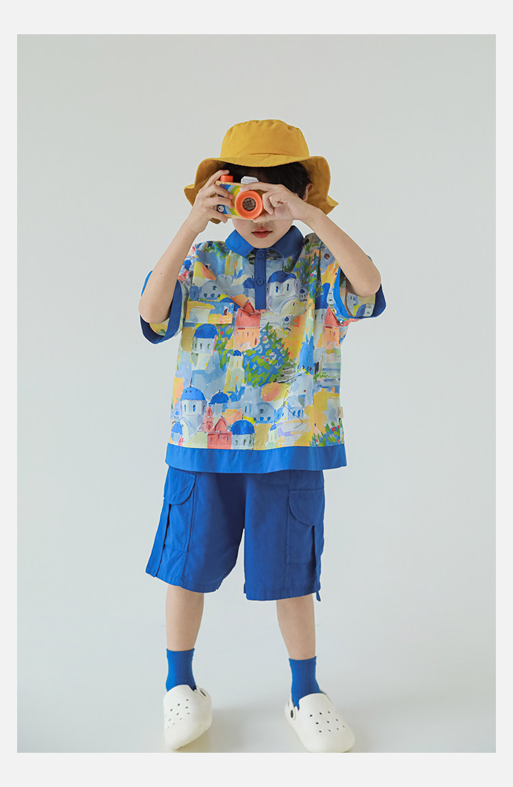 Wurib 소년 여름 새로운 유화 셔츠 짧은 소매 티셔츠 느슨한 도구 반바지 휴가 시리즈 세트스토어 가기