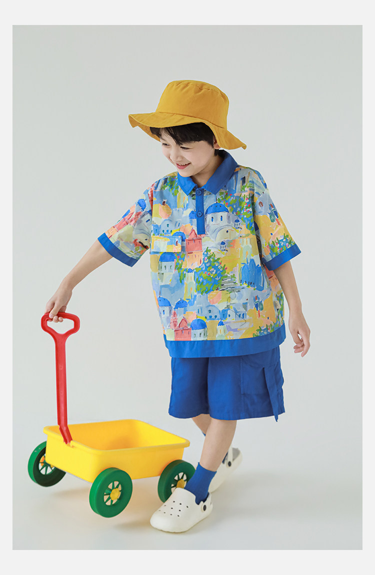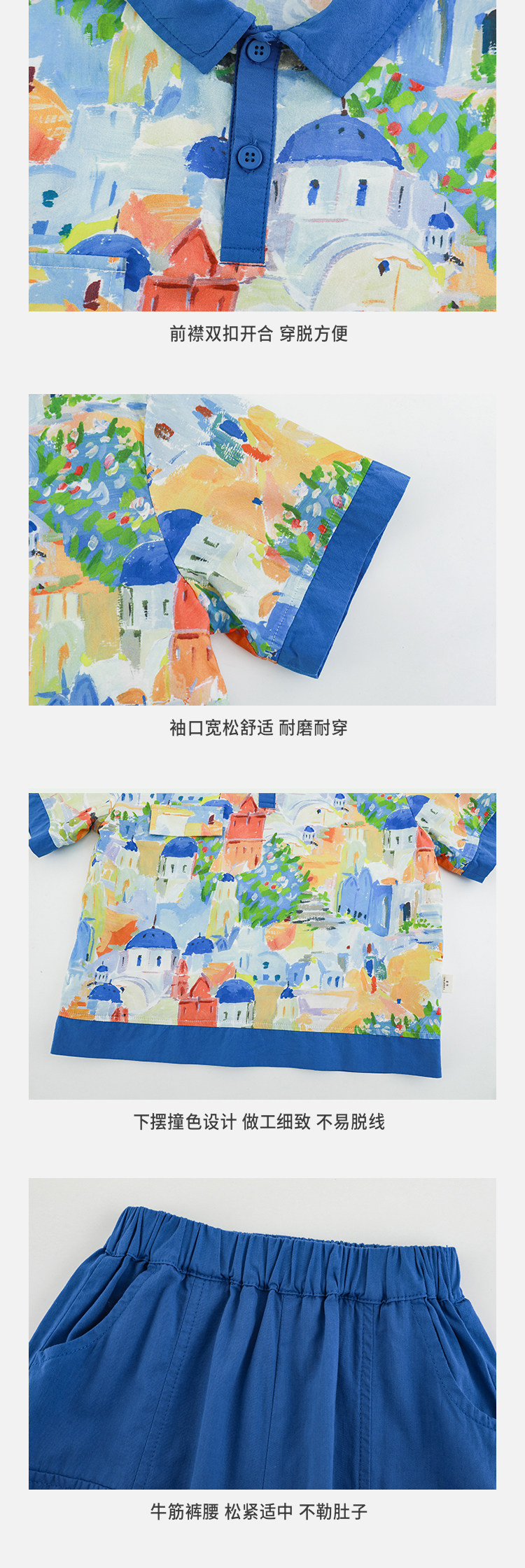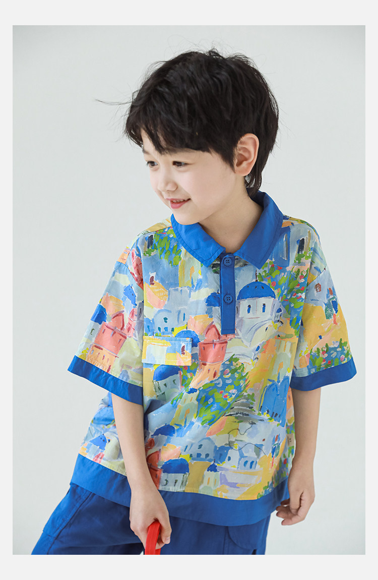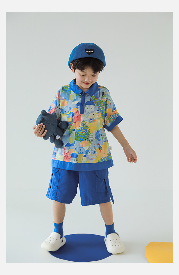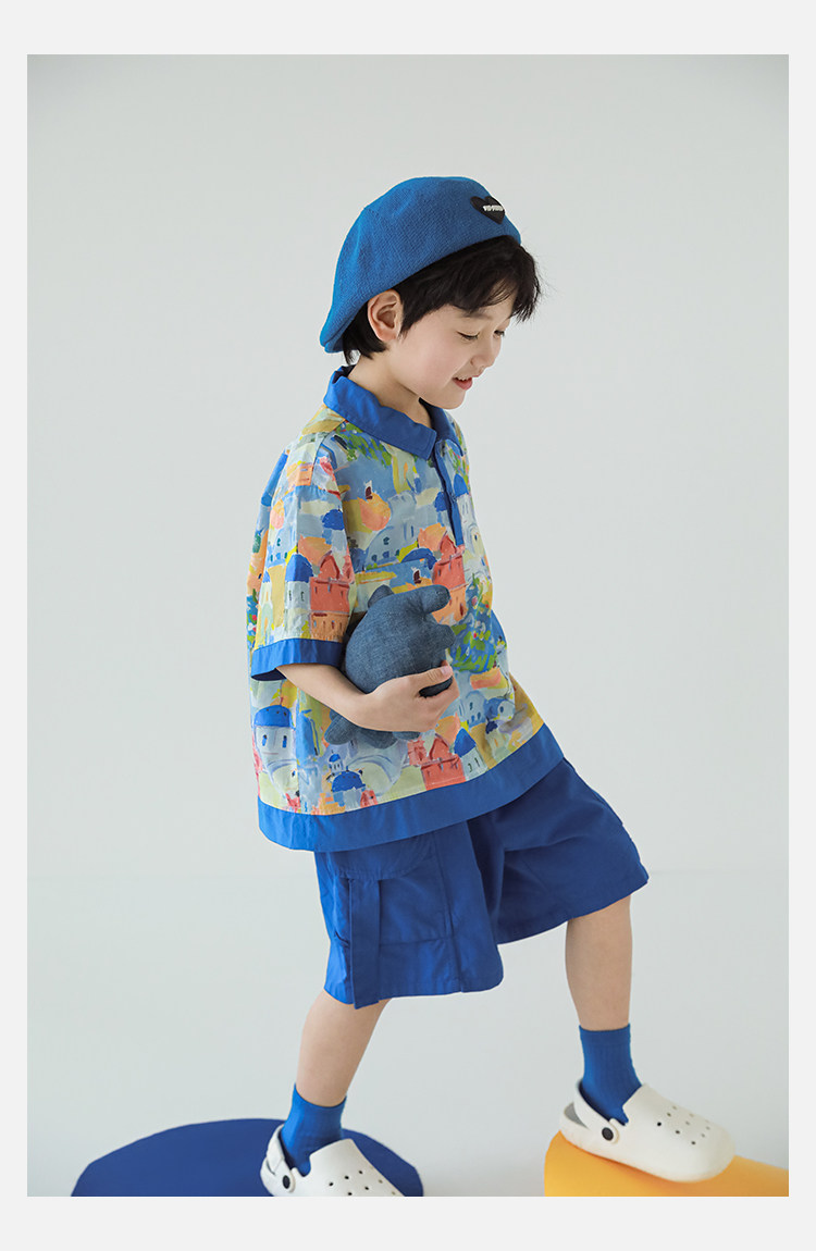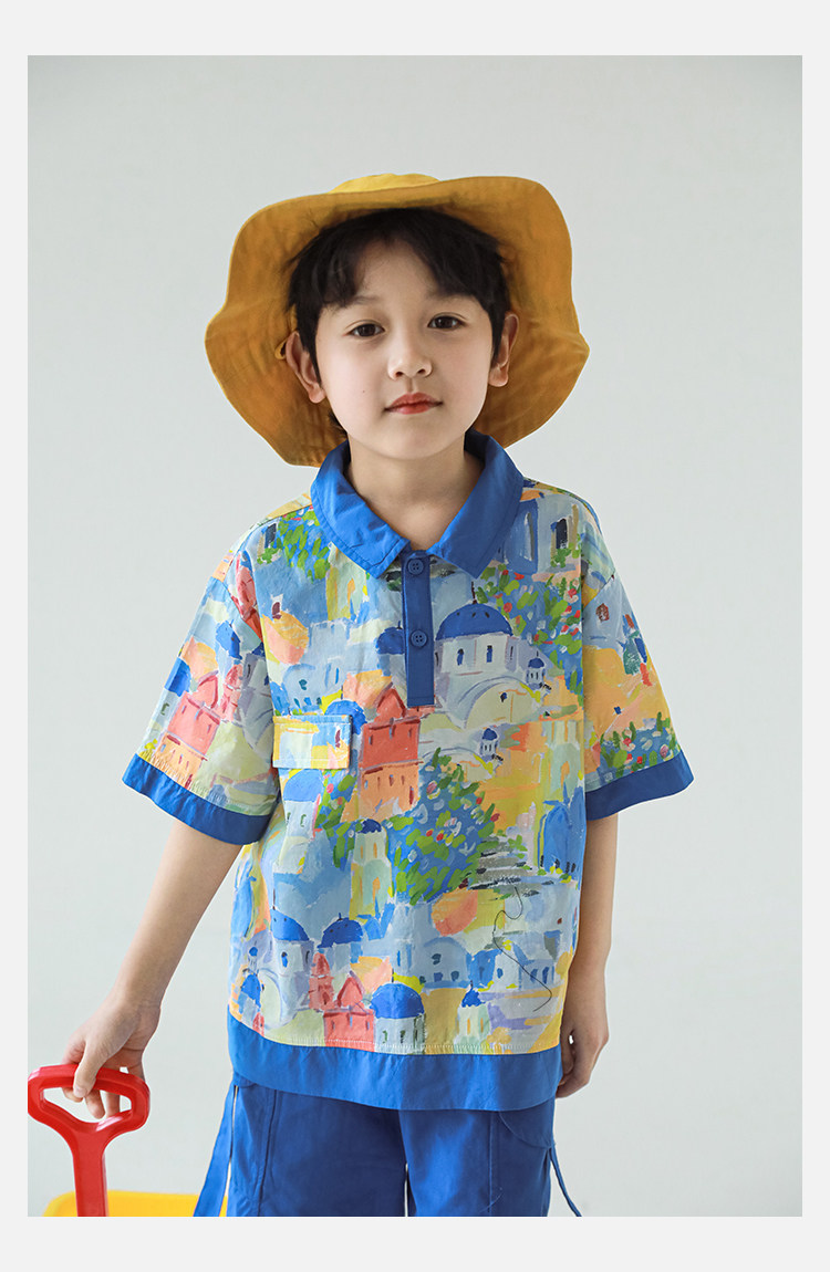 Wurib 소년 여름 새로운 유화 셔츠 짧은 소매 티셔츠 느슨한 도구 반바지 휴가 시리즈 세트스토어 가기