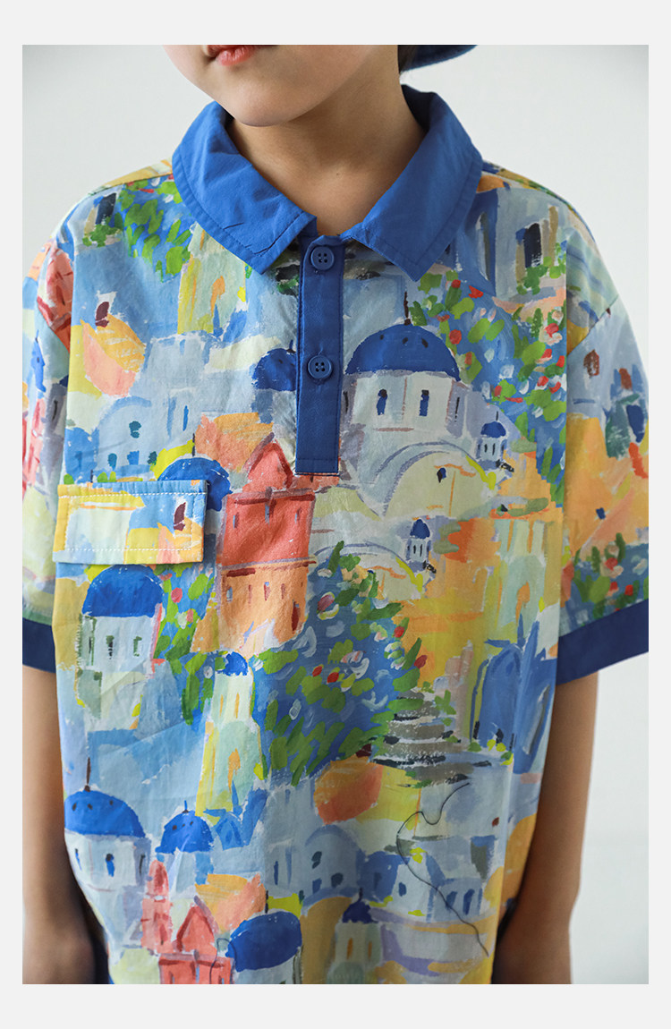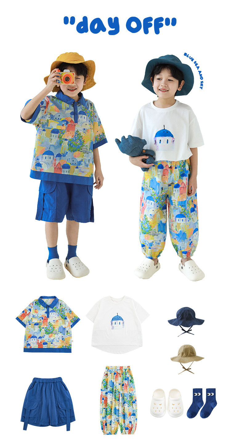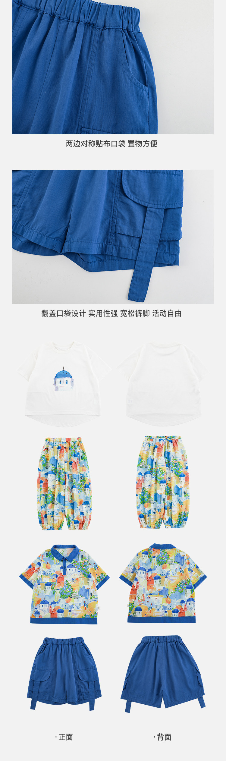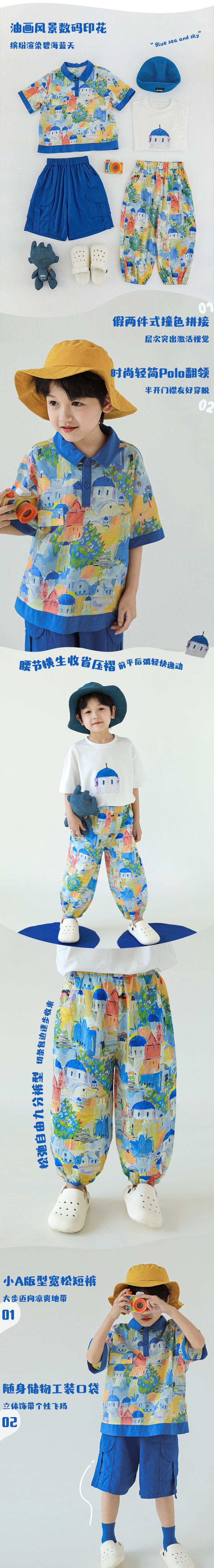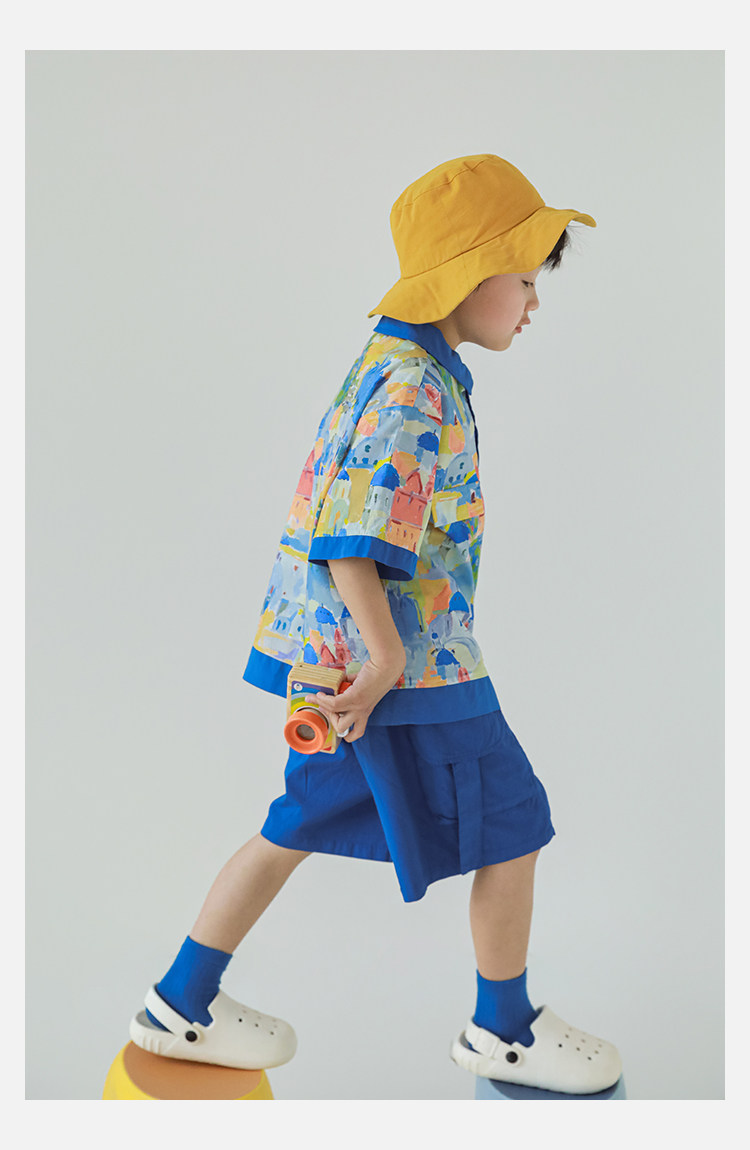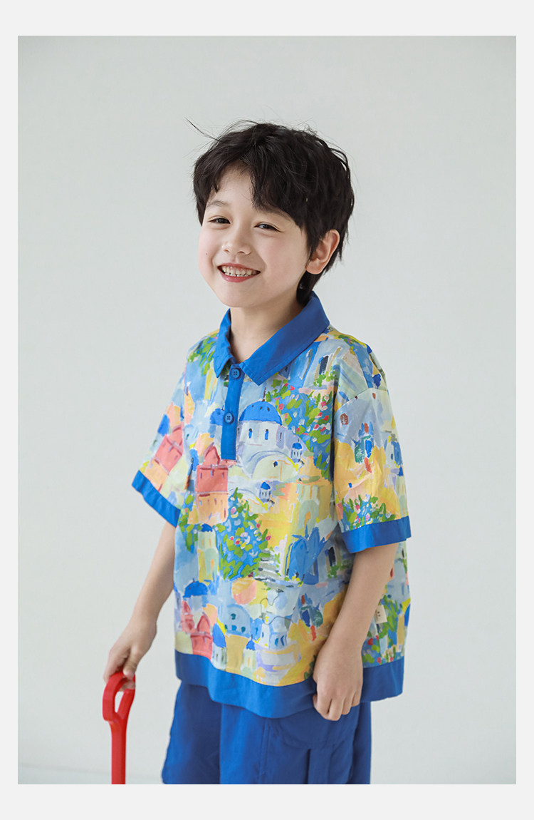 Wurib 소년 여름 새로운 유화 셔츠 짧은 소매 티셔츠 느슨한 도구 반바지 휴가 시리즈 세트스토어 가기