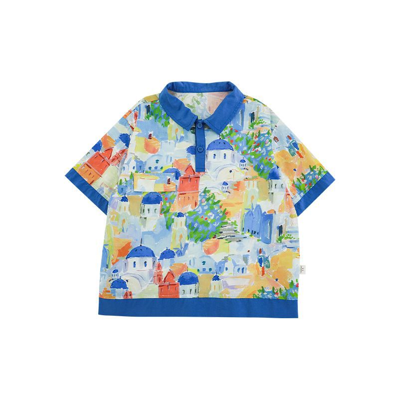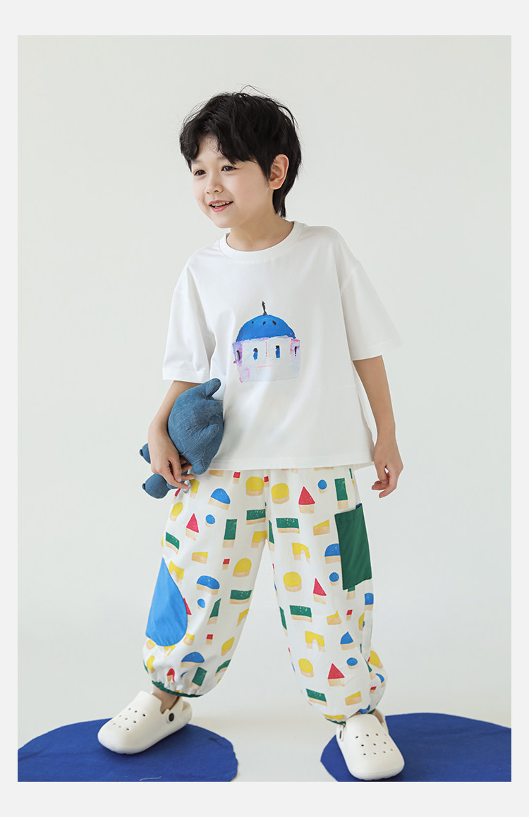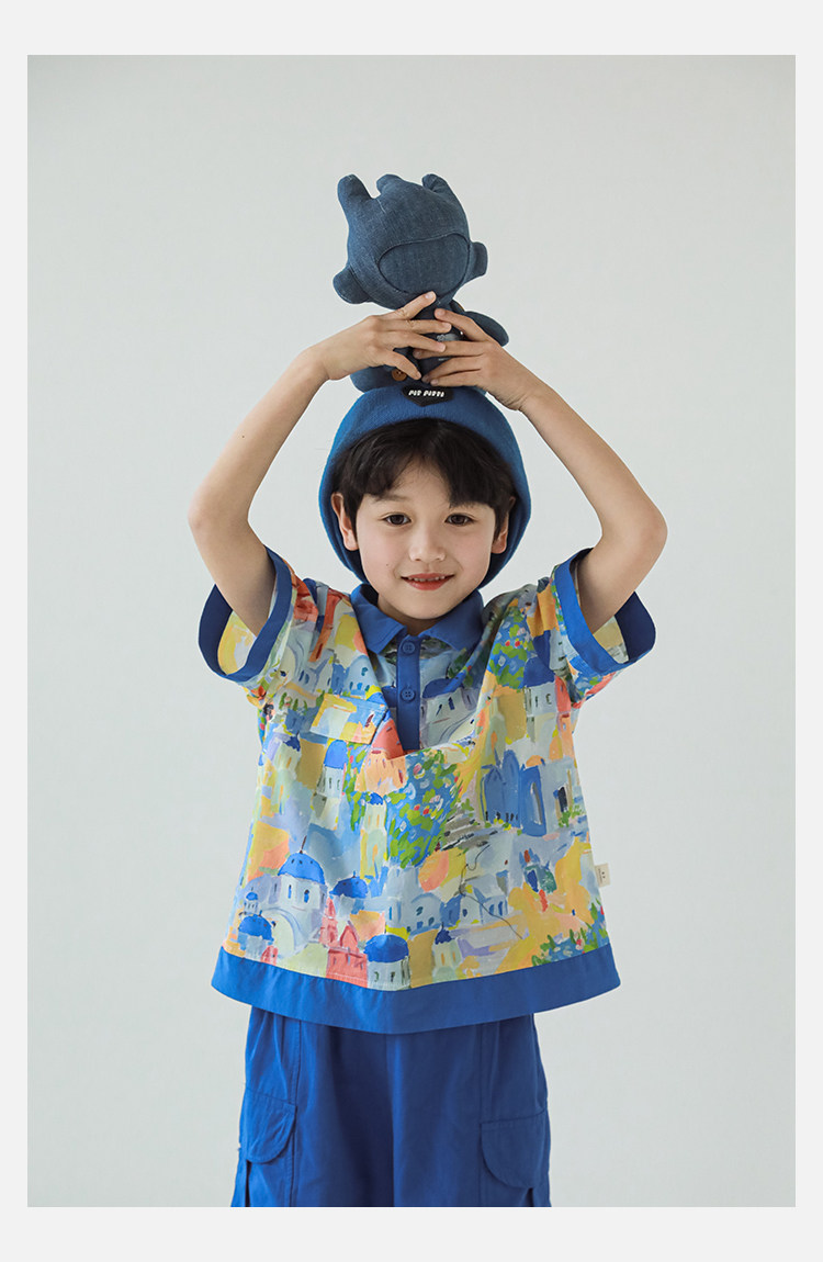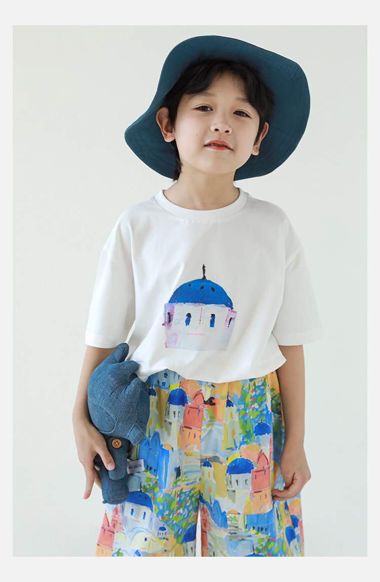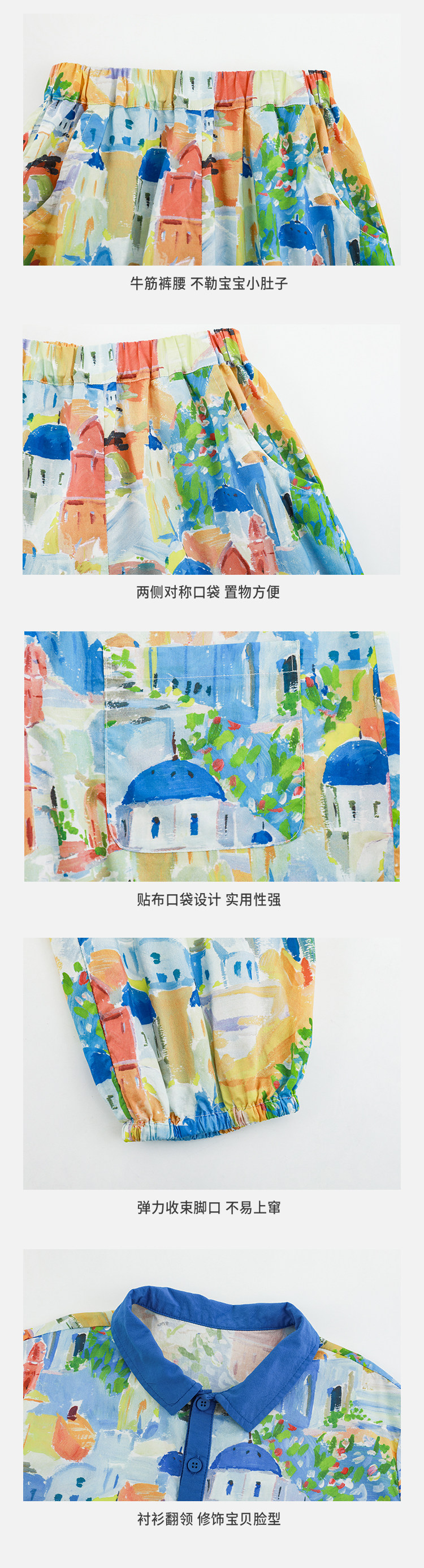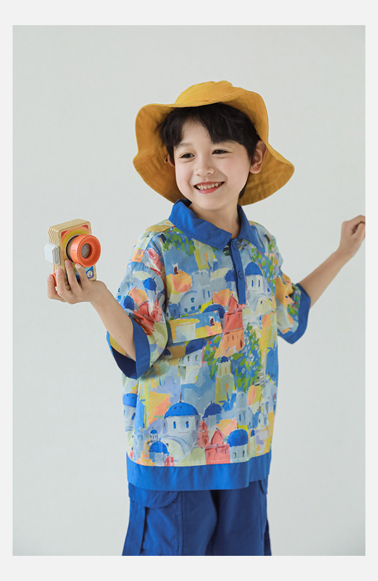 Wurib 소년 여름 새로운 유화 셔츠 짧은 소매 티셔츠 느슨한 도구 반바지 휴가 시리즈 세트스토어 가기
