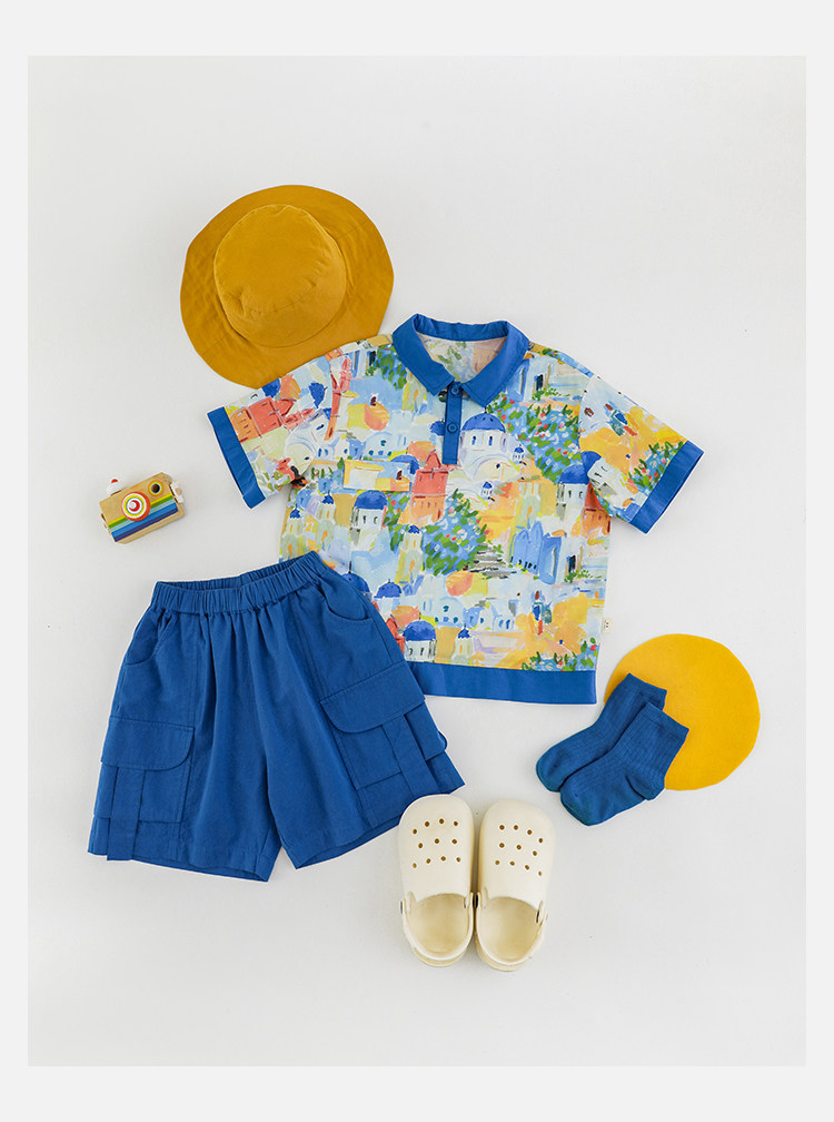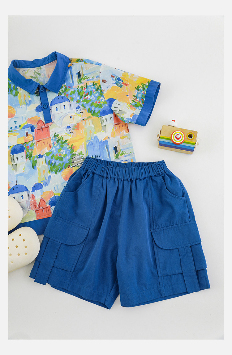 Wurib 소년 여름 새로운 유화 셔츠 짧은 소매 티셔츠 느슨한 도구 반바지 휴가 시리즈 세트