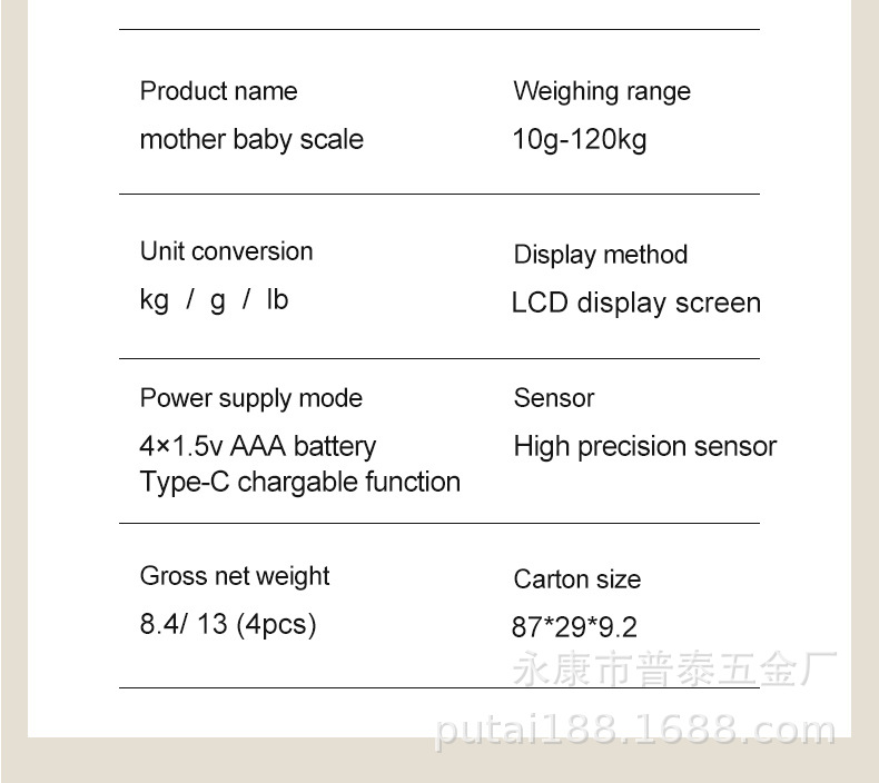 电池:4XAAA 120KG/10g KG/G/LB 测身高:10-80cm
