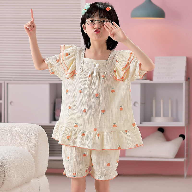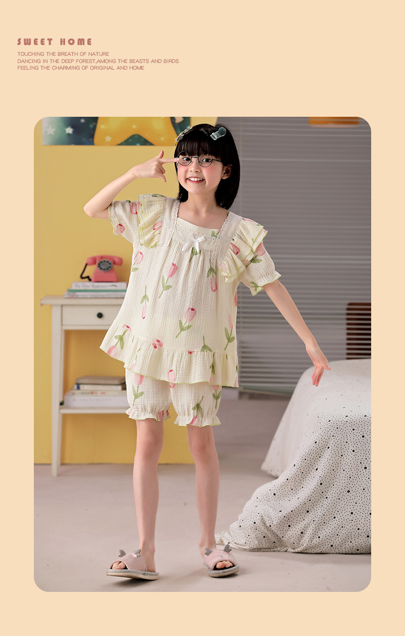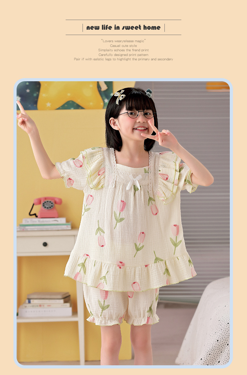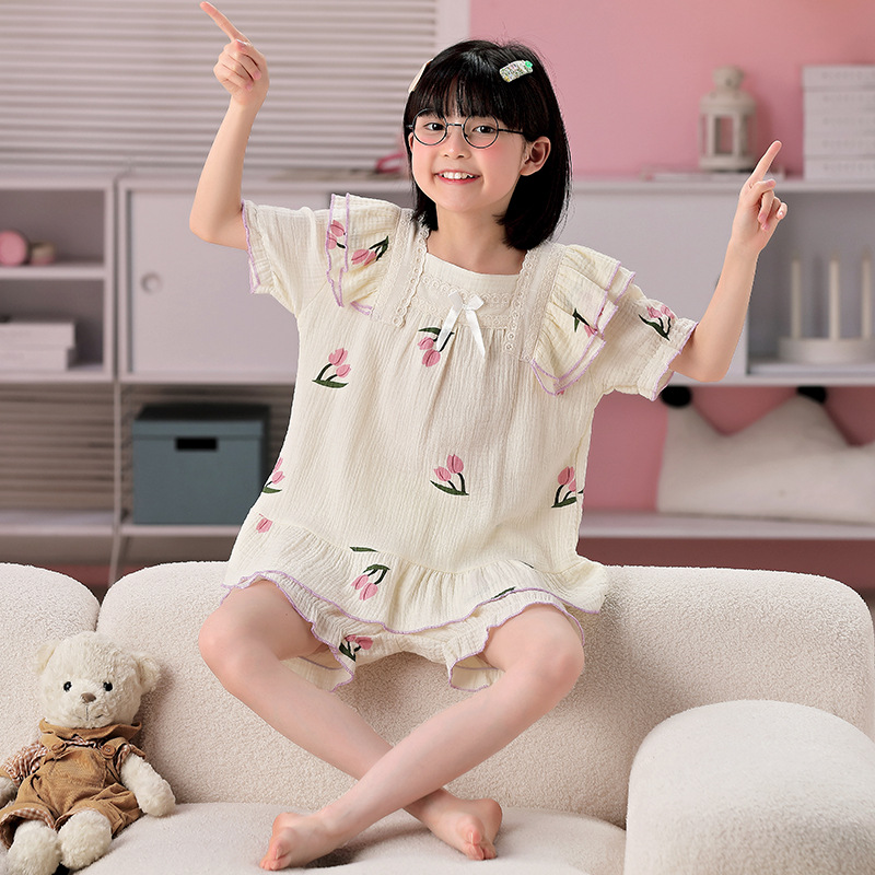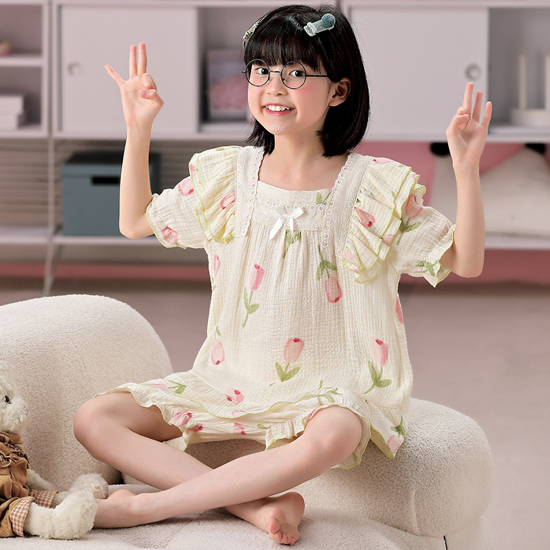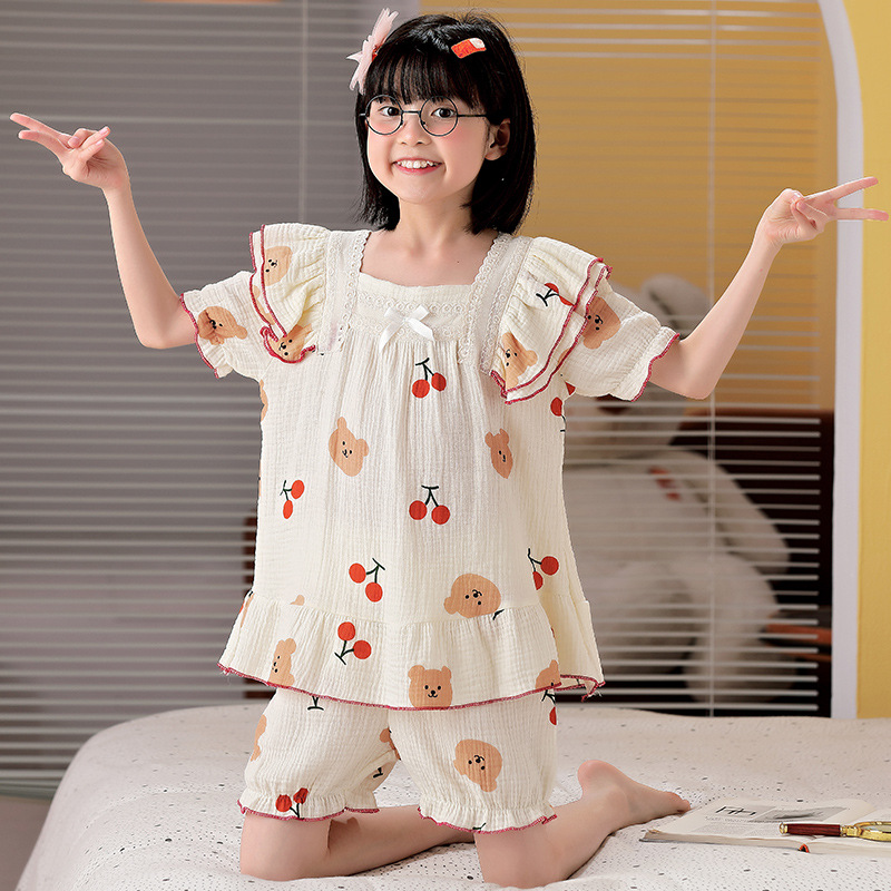 공주 스타일 코튼 거즈 어린이 잠옷 소녀 반팔 학생 귀여운 소녀 여름 홈 의류 세트스토어 가기