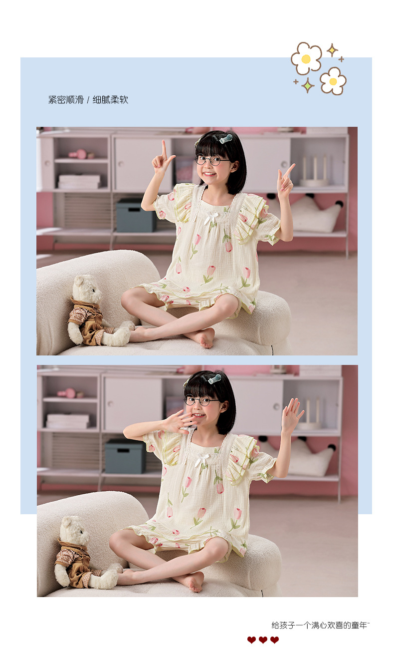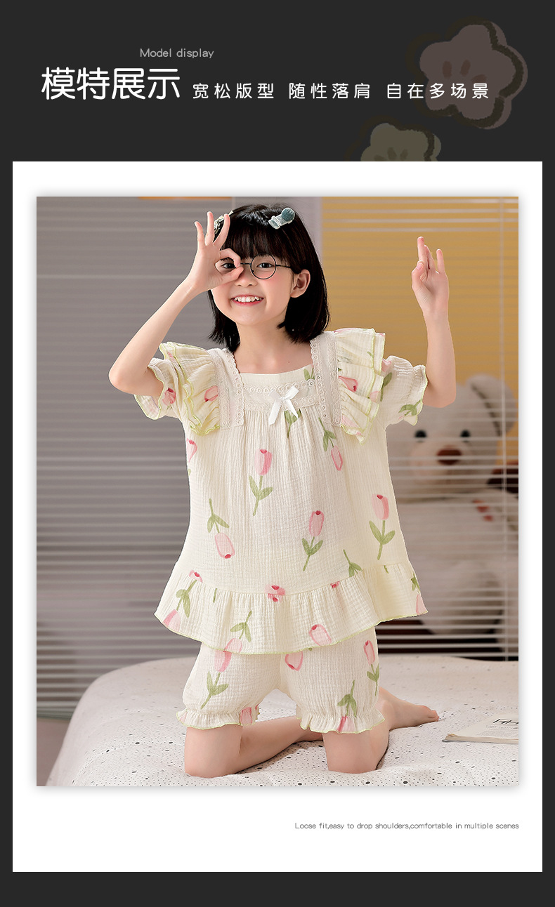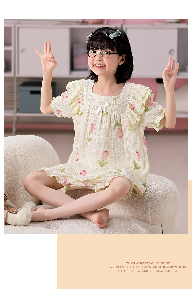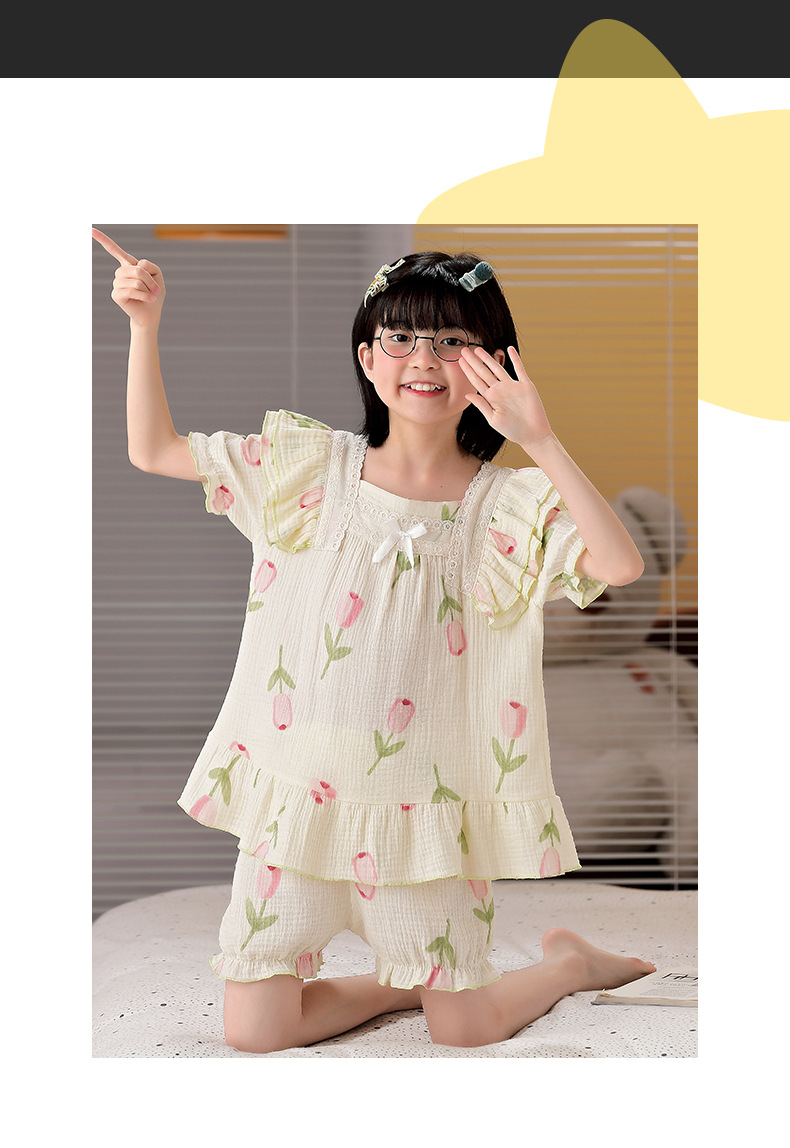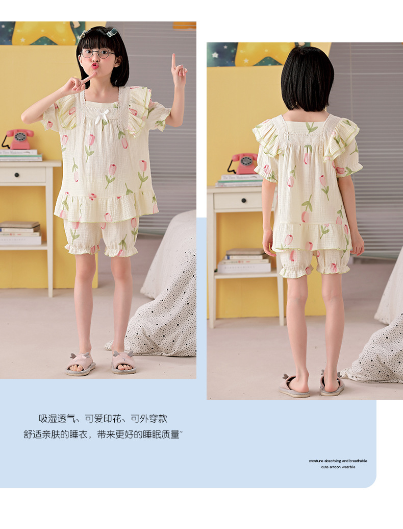 공주 스타일 코튼 거즈 어린이 잠옷 소녀 반팔 학생 귀여운 소녀 여름 홈 의류 세트스토어 가기