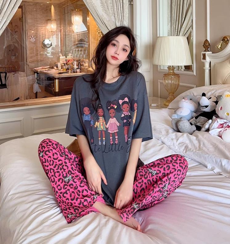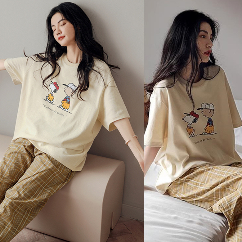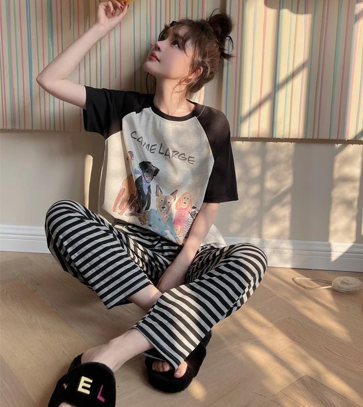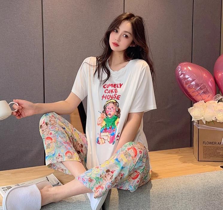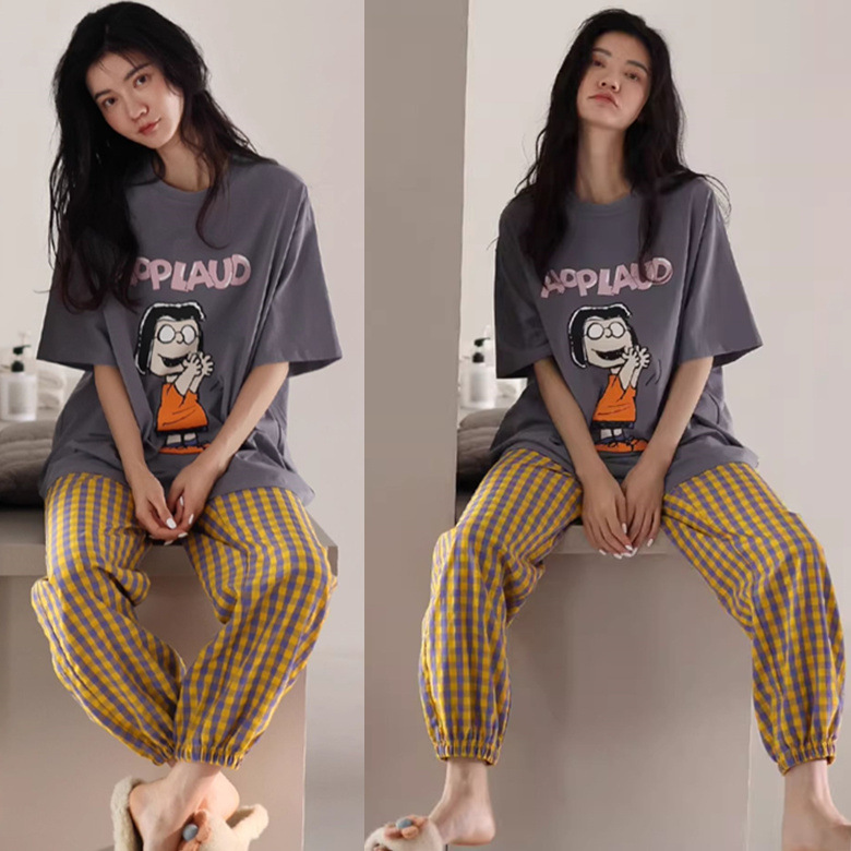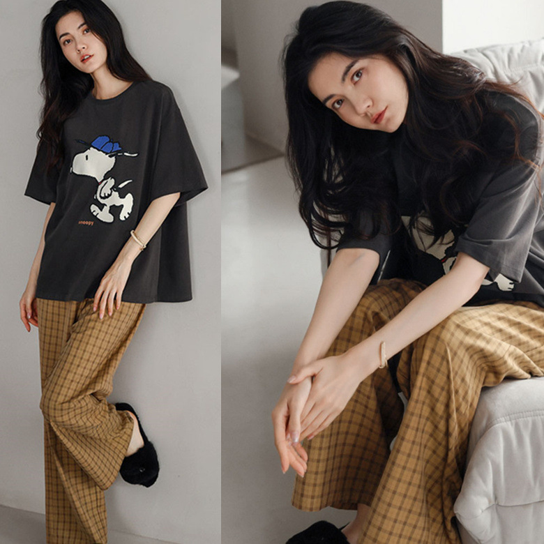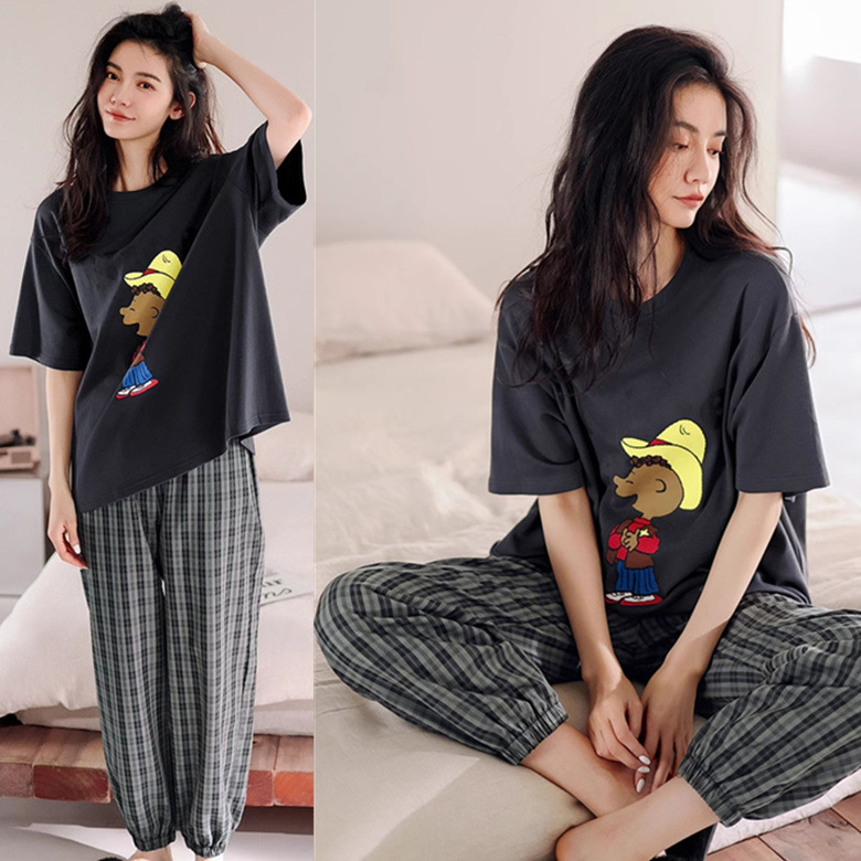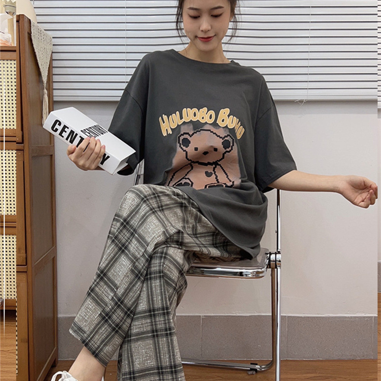 한국식 귀여운 곰 격자 무늬 잠옷 여성 여름 반팔 바지 느슨한 만화 크루 넥 학생 홈 옷