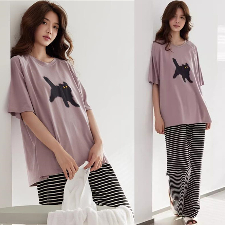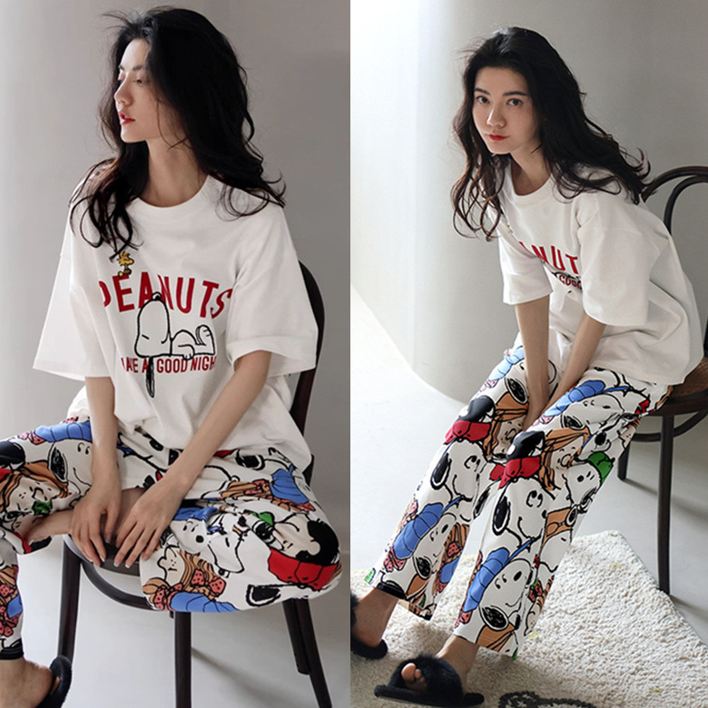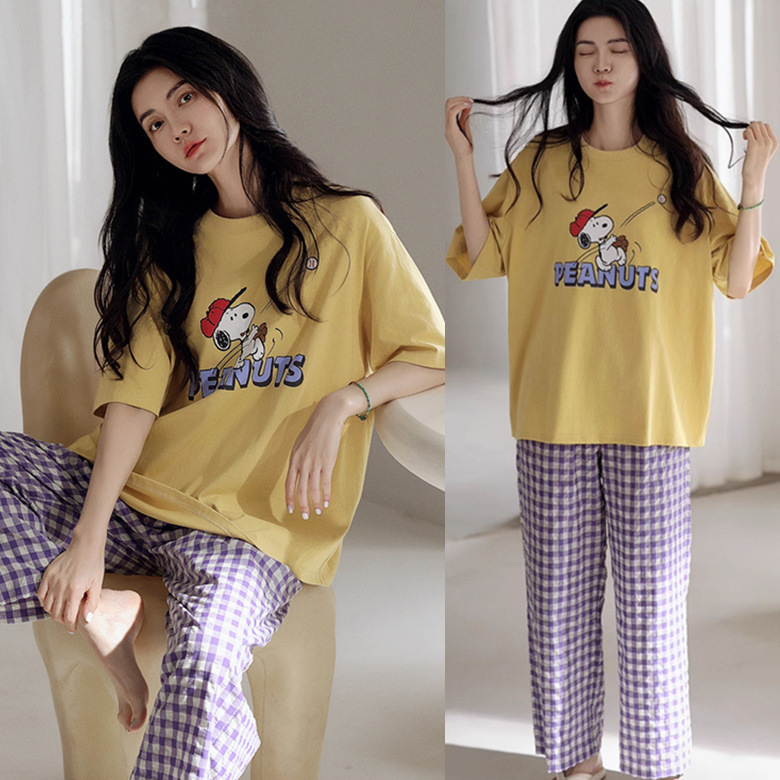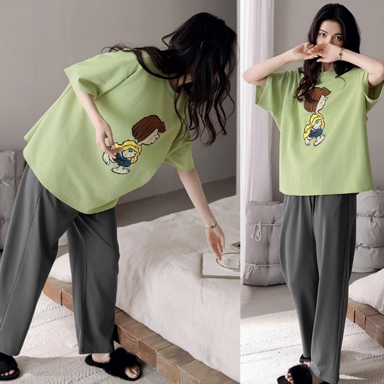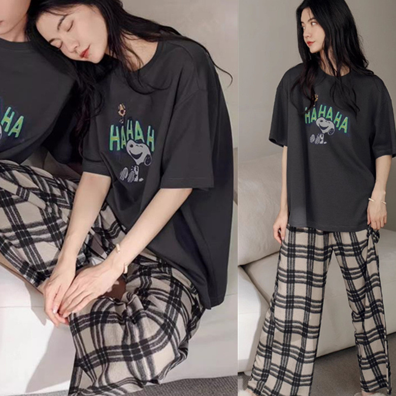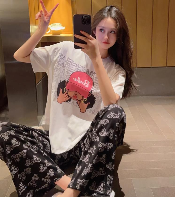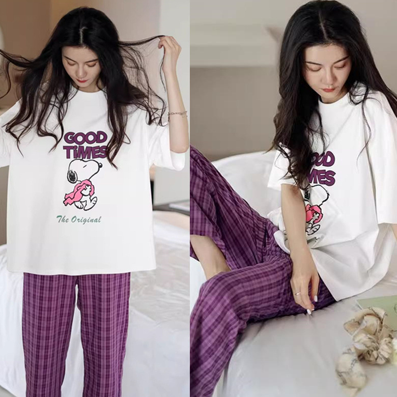 한국식 귀여운 곰 격자 무늬 잠옷 여성 여름 반팔 바지 느슨한 만화 크루 넥 학생 홈 옷