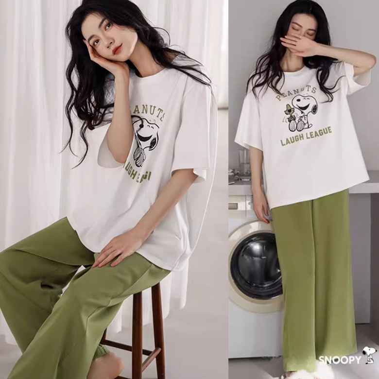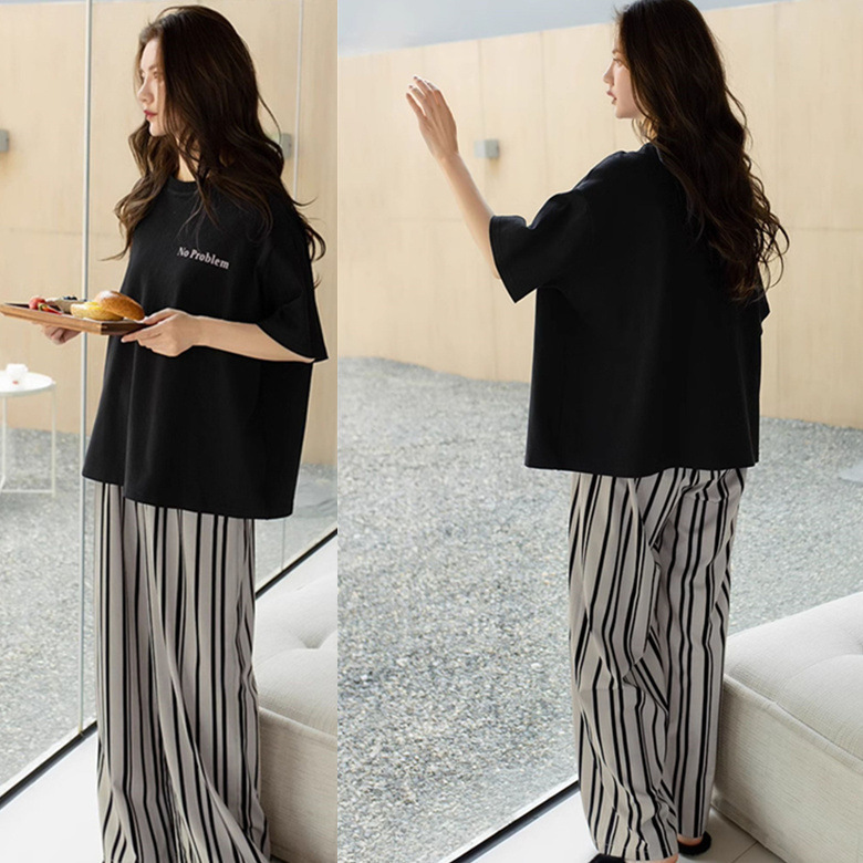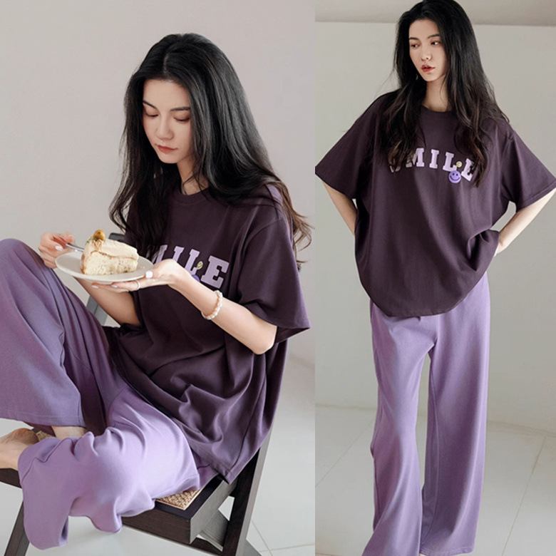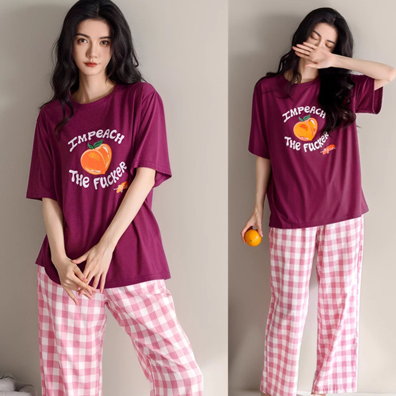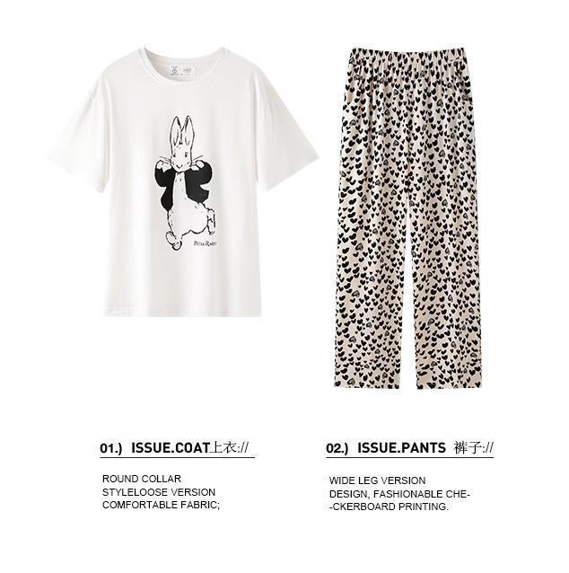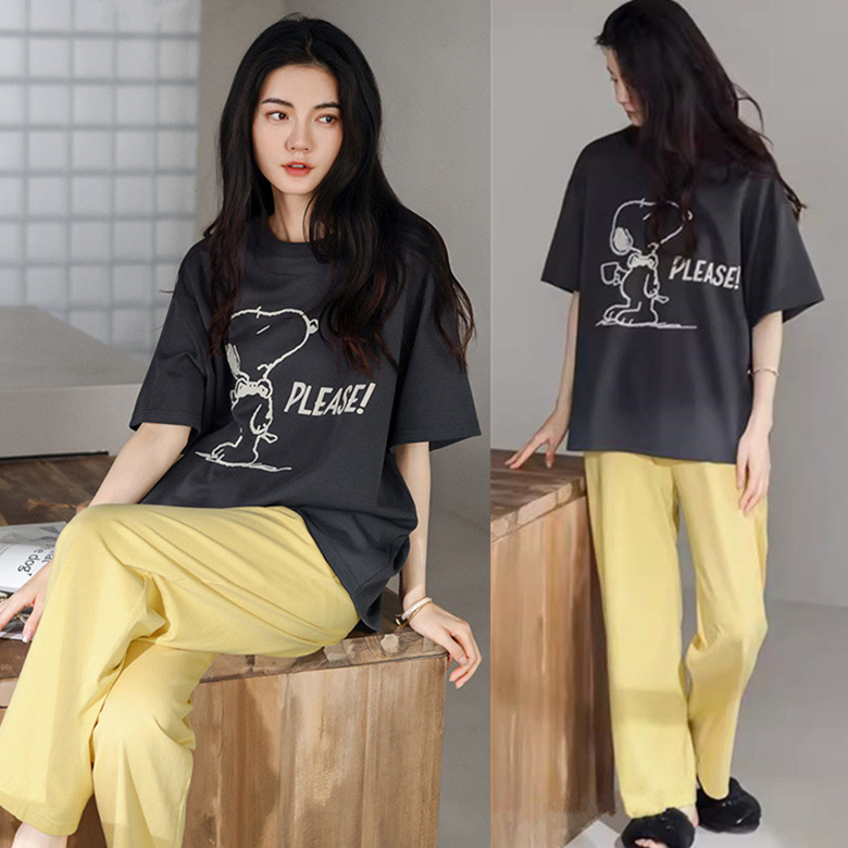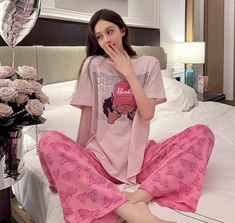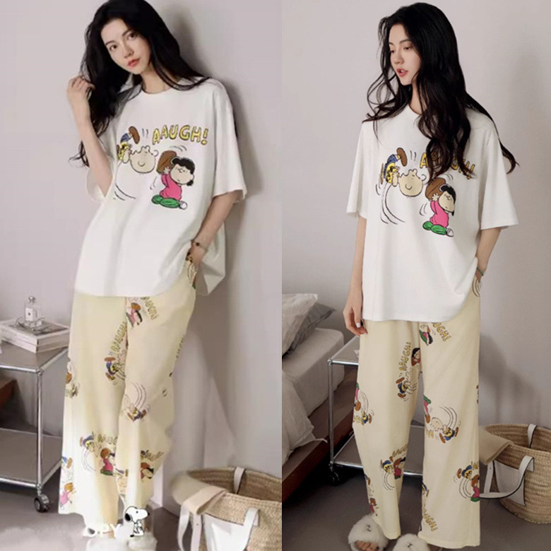 한국식 귀여운 곰 격자 무늬 잠옷 여성 여름 반팔 바지 느슨한 만화 크루 넥 학생 홈 옷