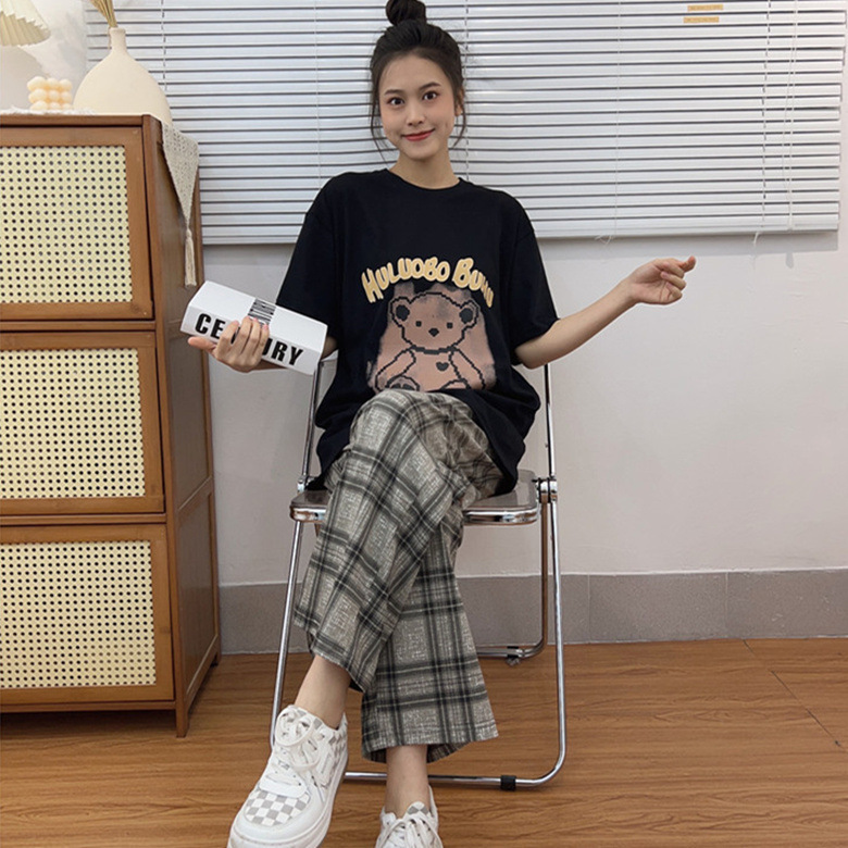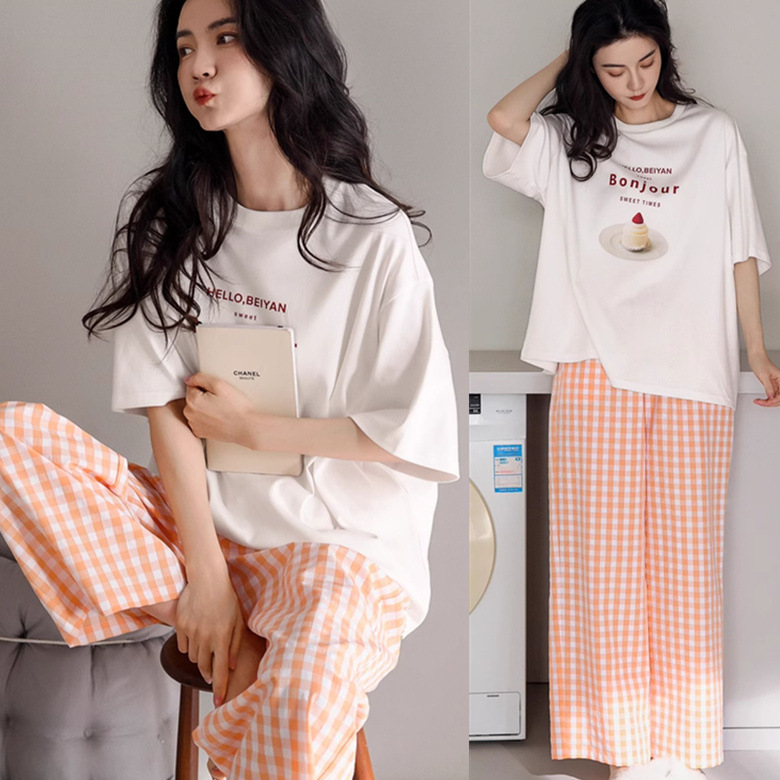 한국식 귀여운 곰 격자 무늬 잠옷 여성 여름 반팔 바지 느슨한 만화 크루 넥 학생 홈 옷스토어 가기