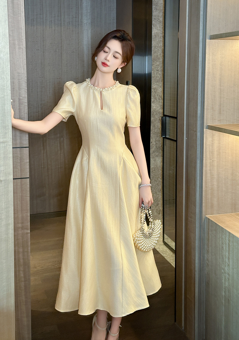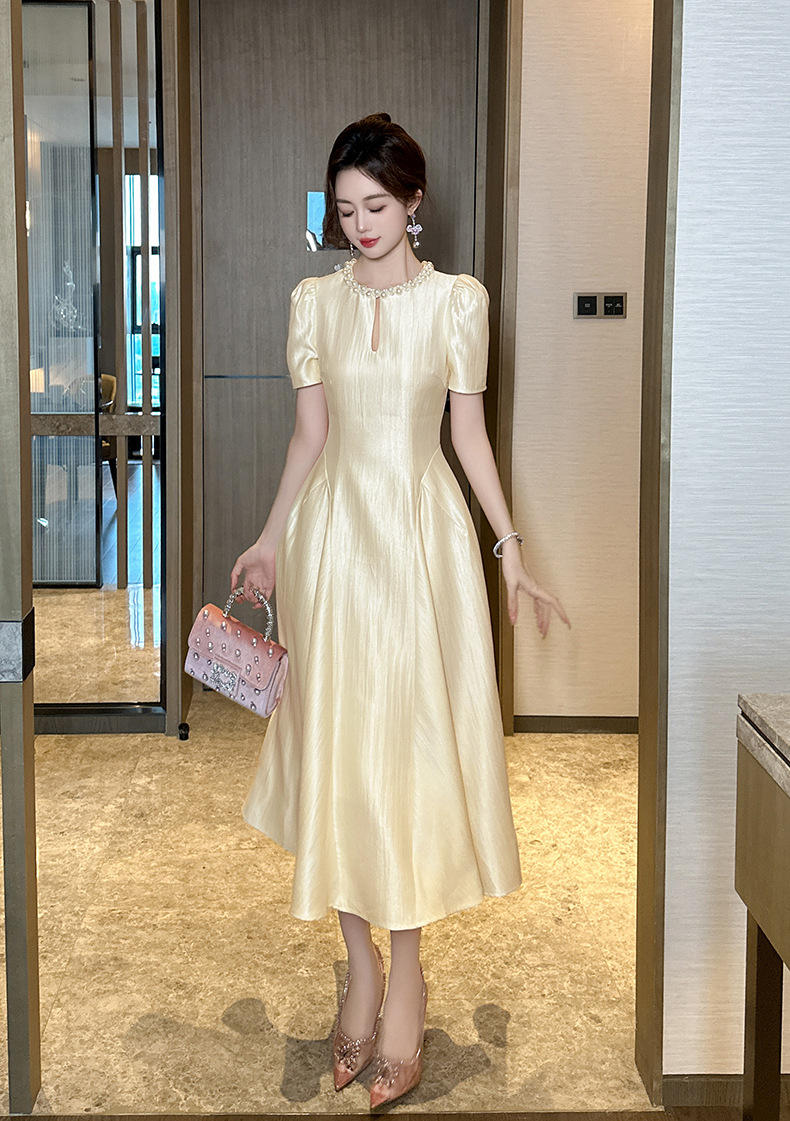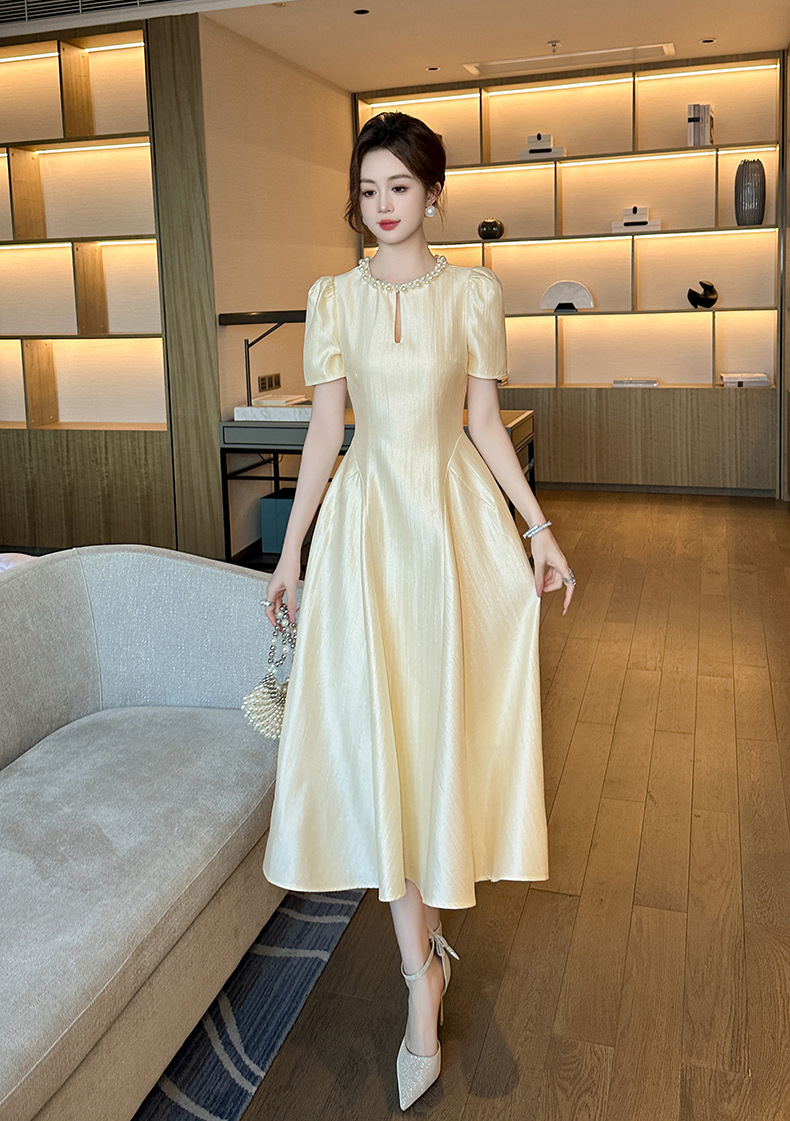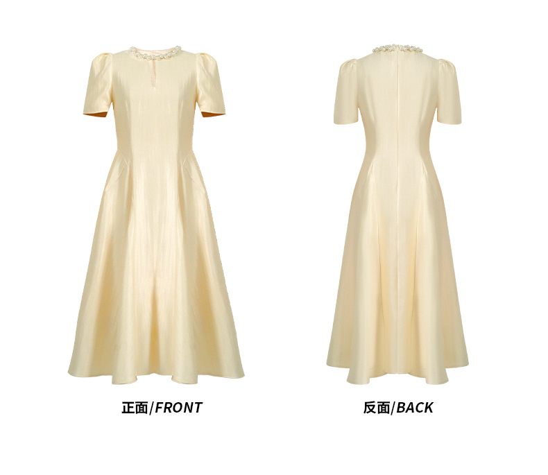 티 브레이크 롱 스커트 2025 여름 신작 여성 프랑스 스타일 라운드 넥 허리 드레이프 무릎 길이 드레스 80219