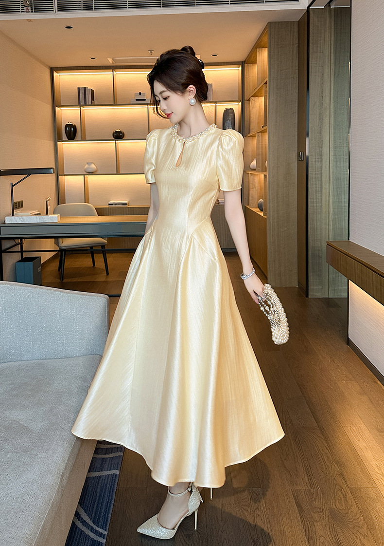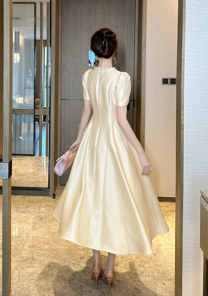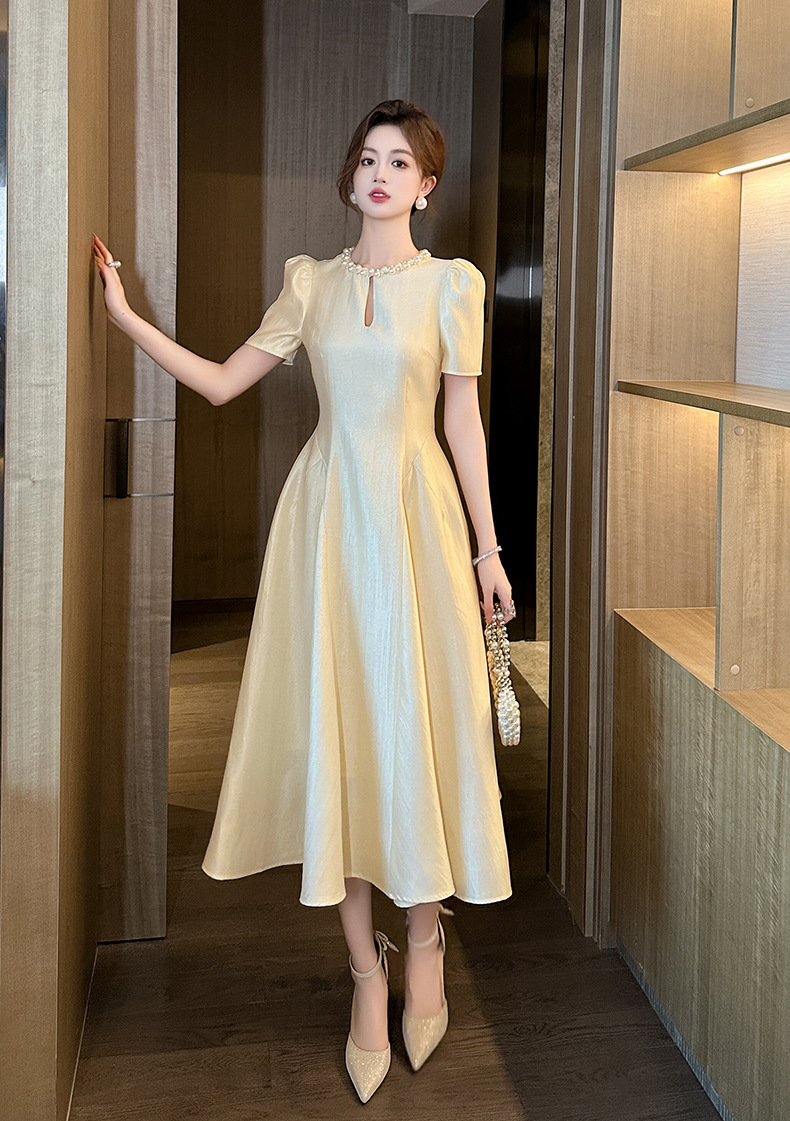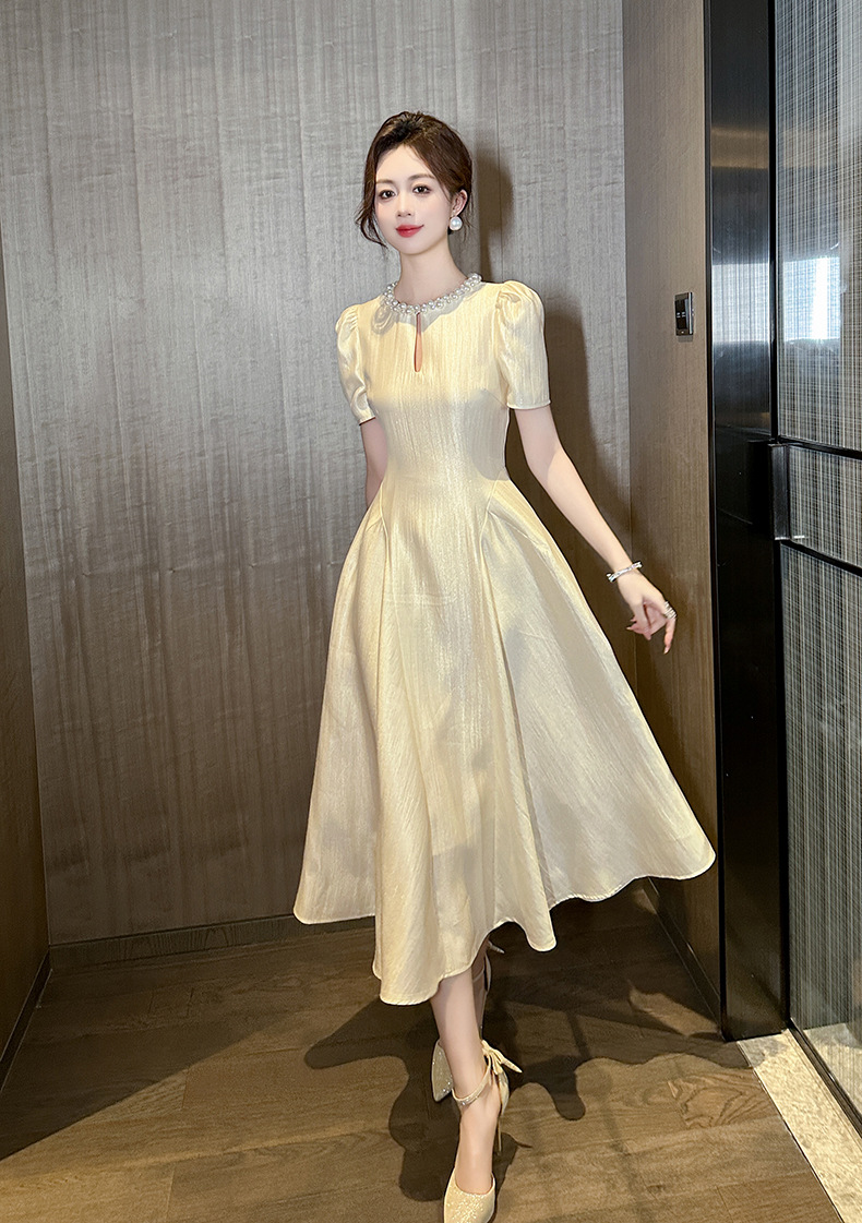 티 브레이크 롱 스커트 2025 여름 신작 여성 프랑스 스타일 라운드 넥 허리 드레이프 무릎 길이 드레스 80219