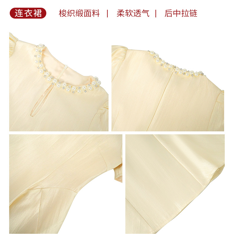 티 브레이크 롱 스커트 2025 여름 신작 여성 프랑스 스타일 라운드 넥 허리 드레이프 무릎 길이 드레스 80219스토어 가기