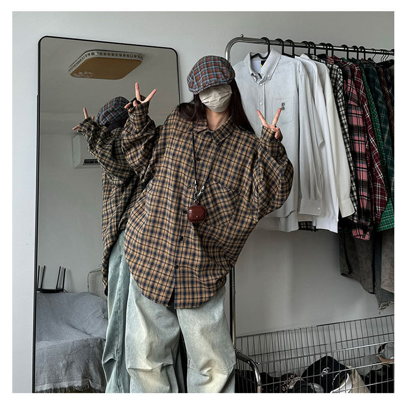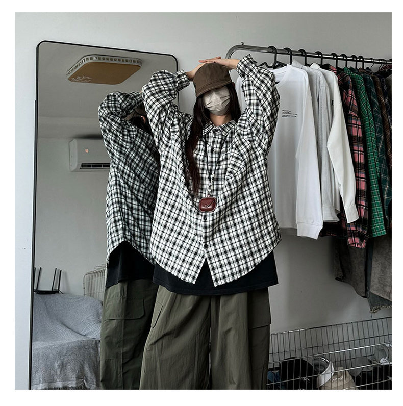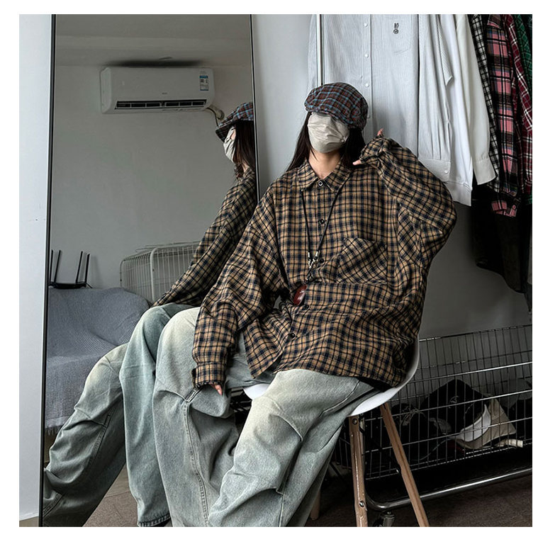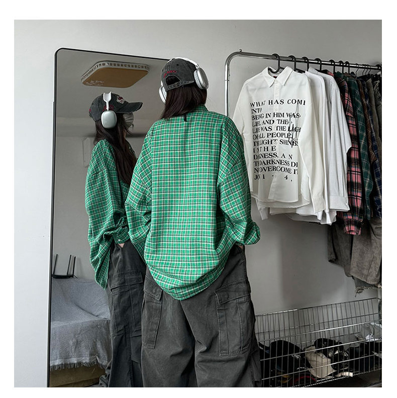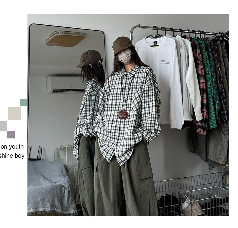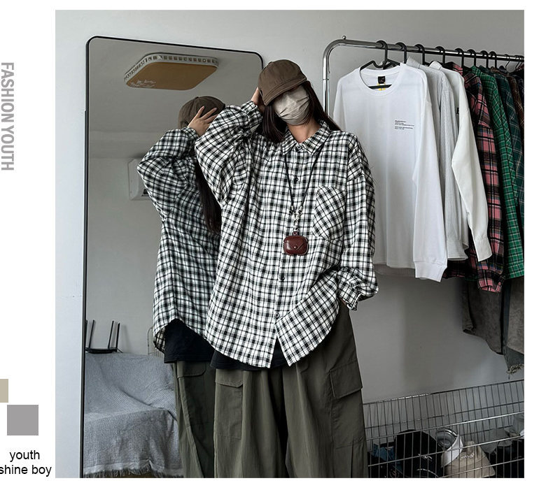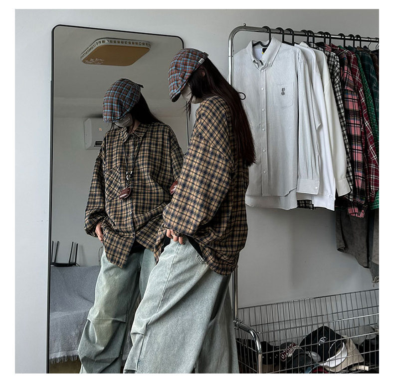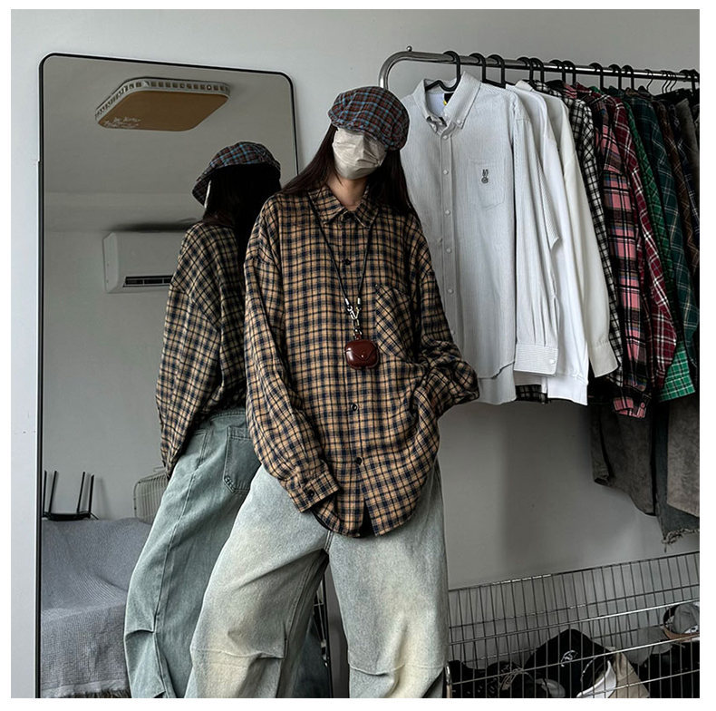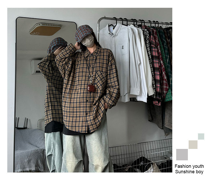 24 봄과 가을 새로운 셔츠 남자의 새로운 캐주얼 트렌디 홍콩 스타일 느슨한 샌딩 다색 격자 긴 소매 셔츠