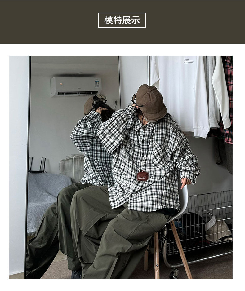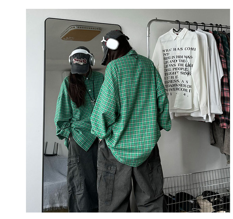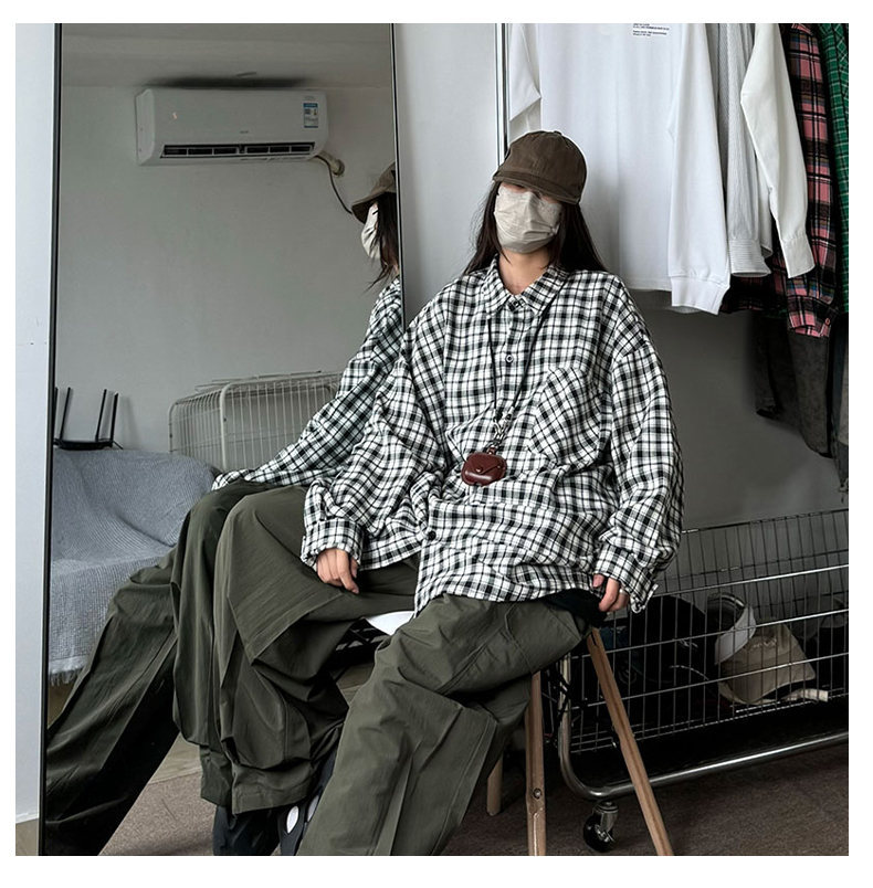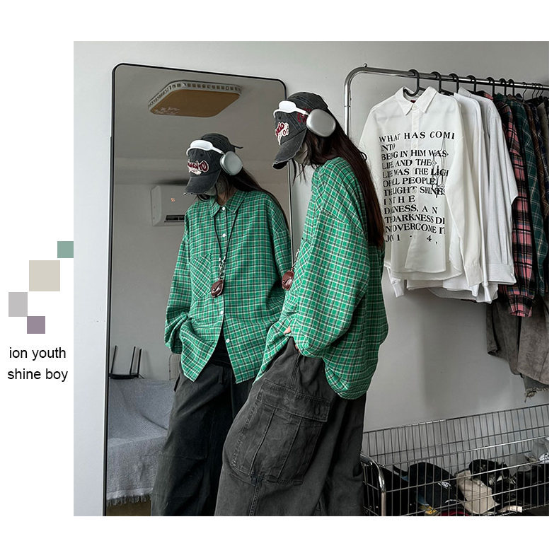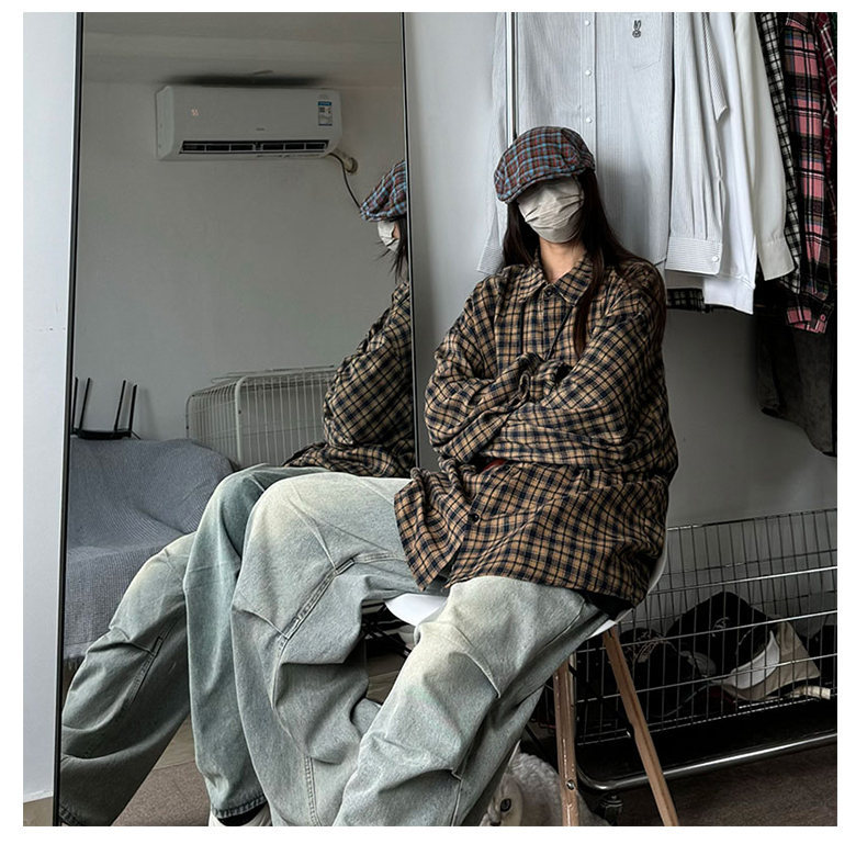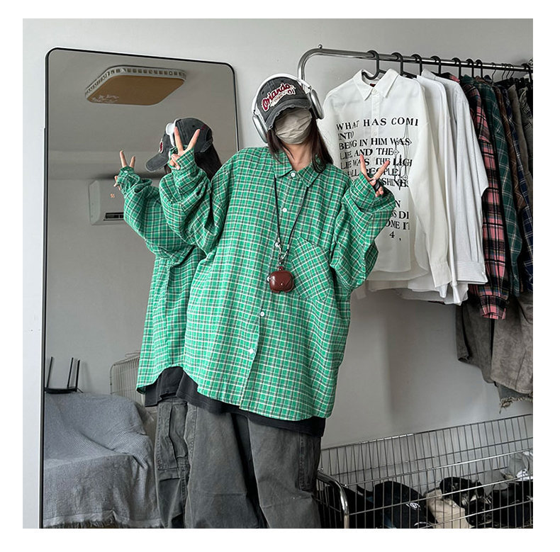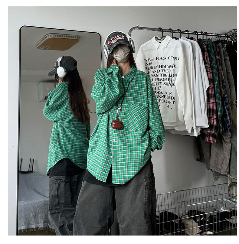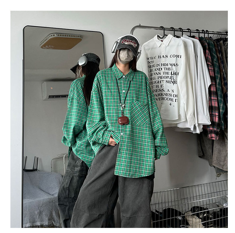 24 봄과 가을 새로운 셔츠 남자의 새로운 캐주얼 트렌디 홍콩 스타일 느슨한 샌딩 다색 격자 긴 소매 셔츠