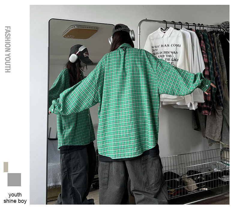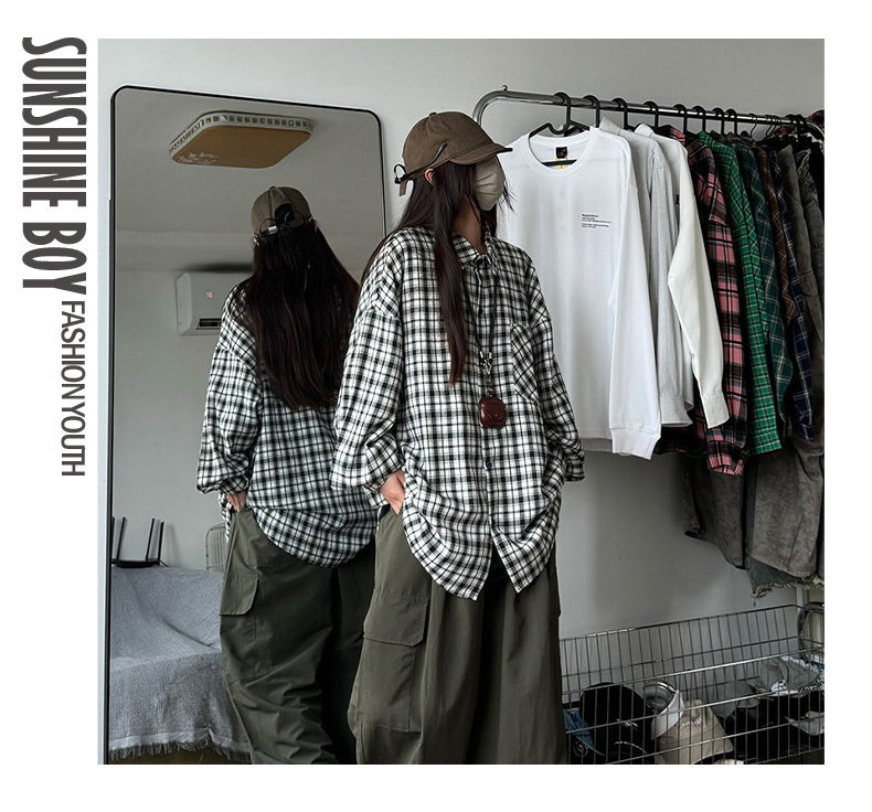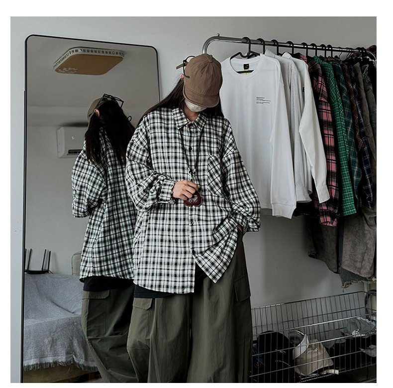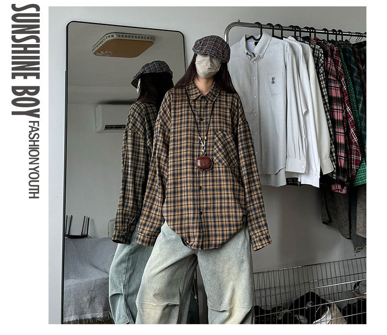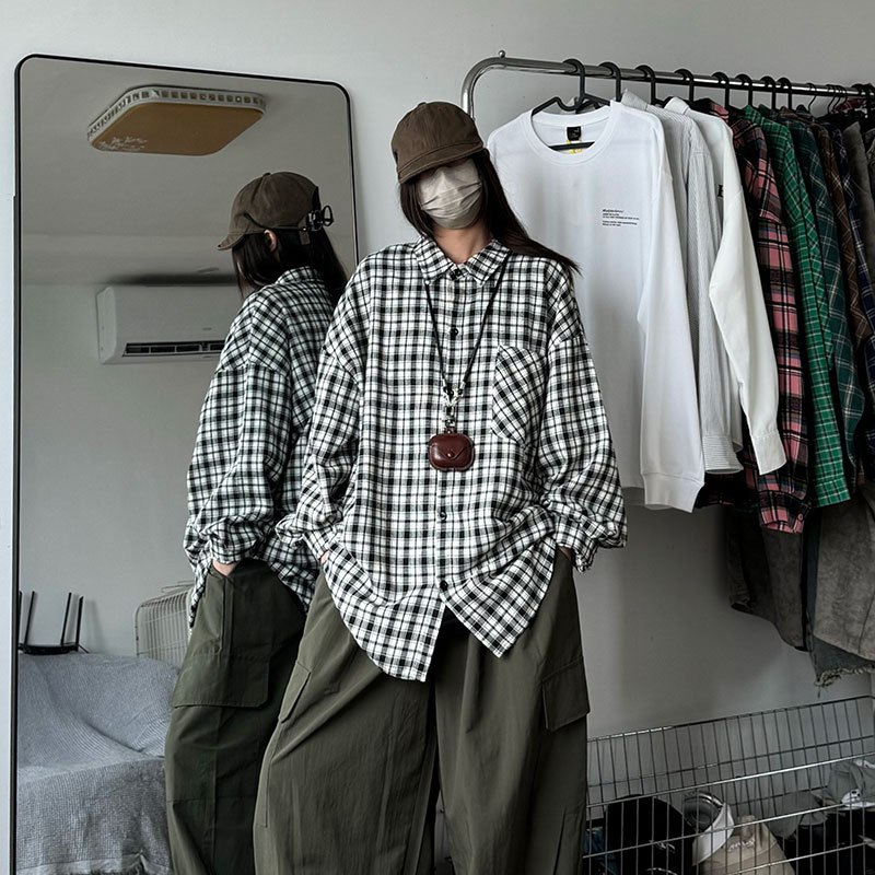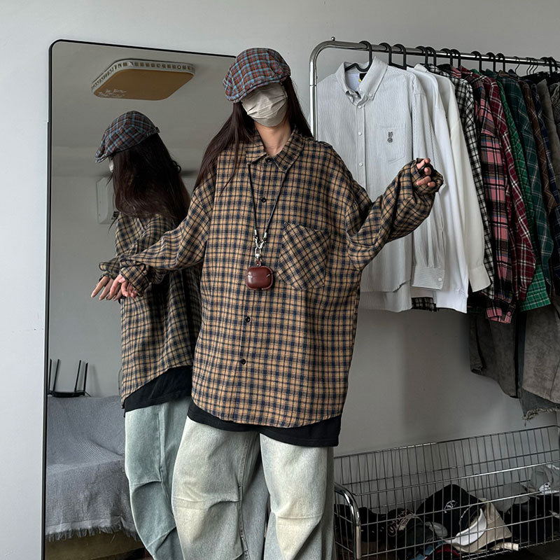 24 봄과 가을 새로운 셔츠 남자의 새로운 캐주얼 트렌디 홍콩 스타일 느슨한 샌딩 다색 격자 긴 소매 셔츠스토어 가기