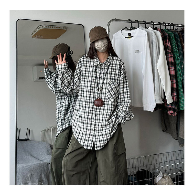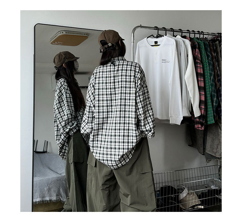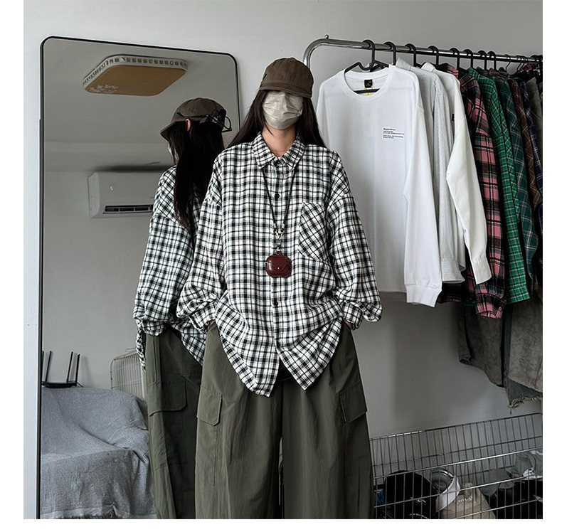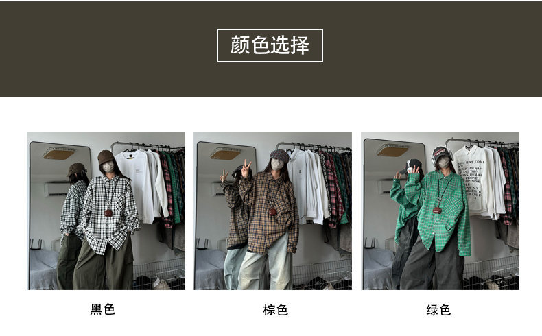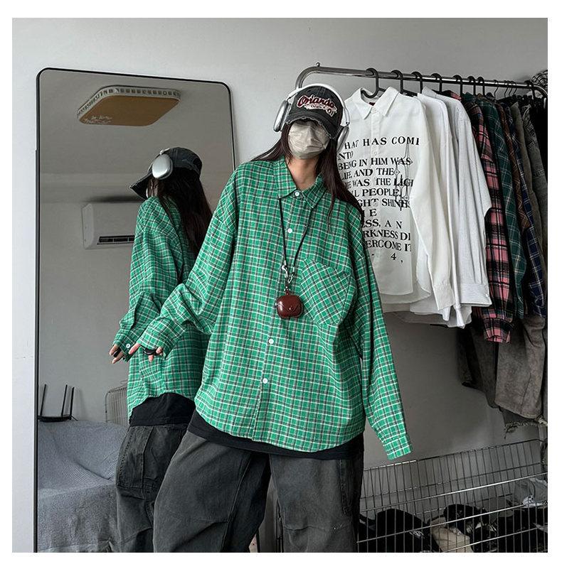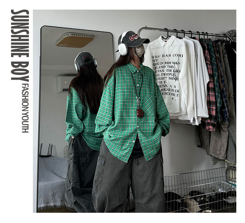 24 봄과 가을 새로운 셔츠 남자의 새로운 캐주얼 트렌디 홍콩 스타일 느슨한 샌딩 다색 격자 긴 소매 셔츠스토어 가기