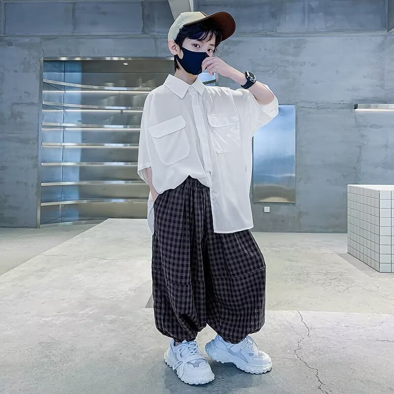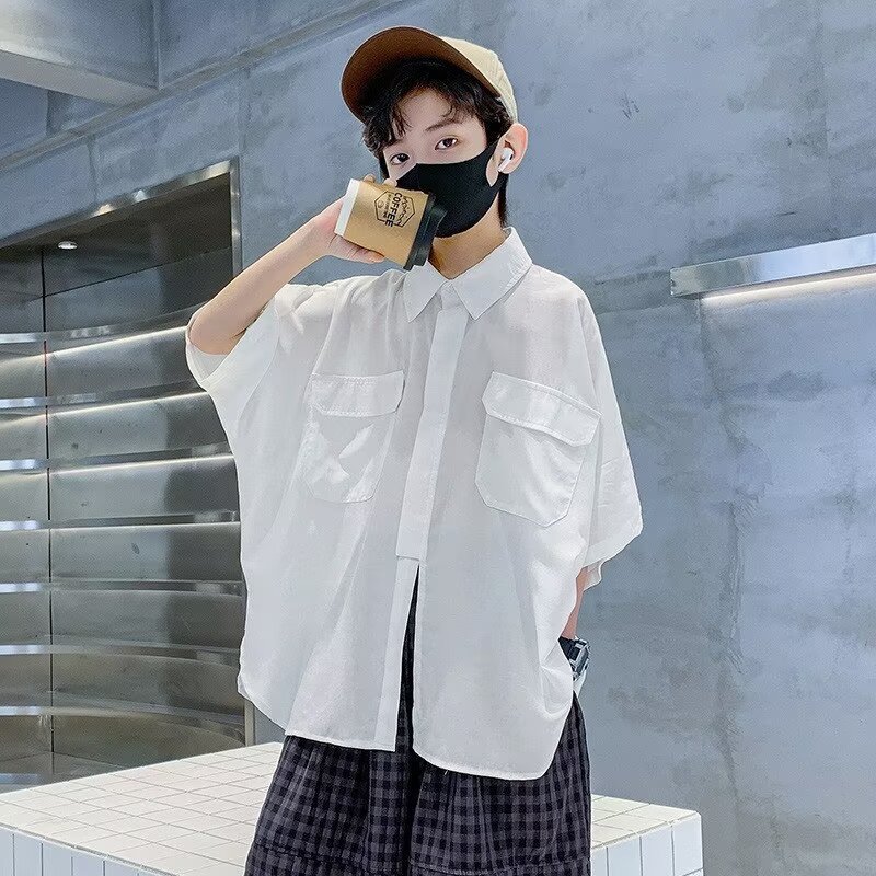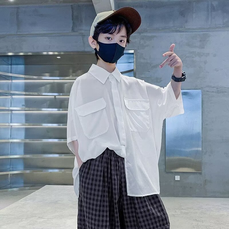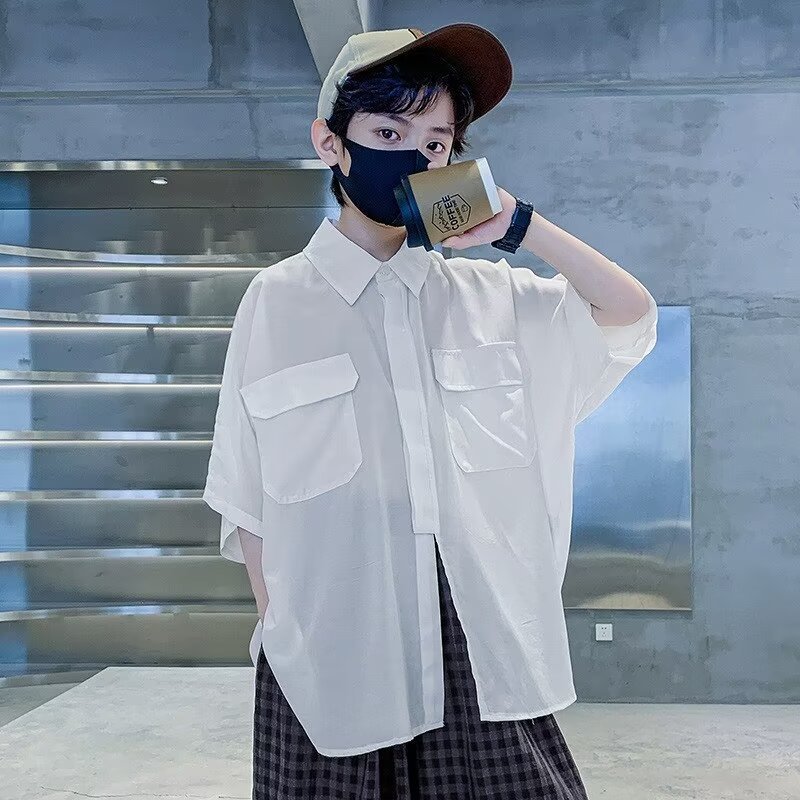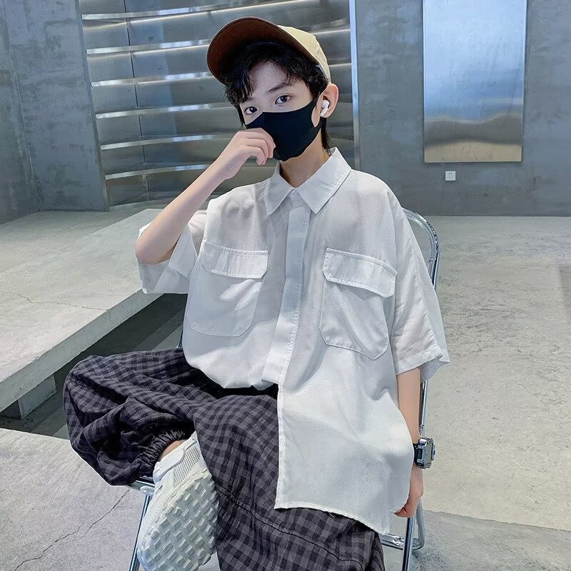 2025 여름 신상 남아용 일본식 더블 포켓 셔츠 중대형 어린이 포켓 셔츠 아동 캐주얼 단색 상의스토어 가기