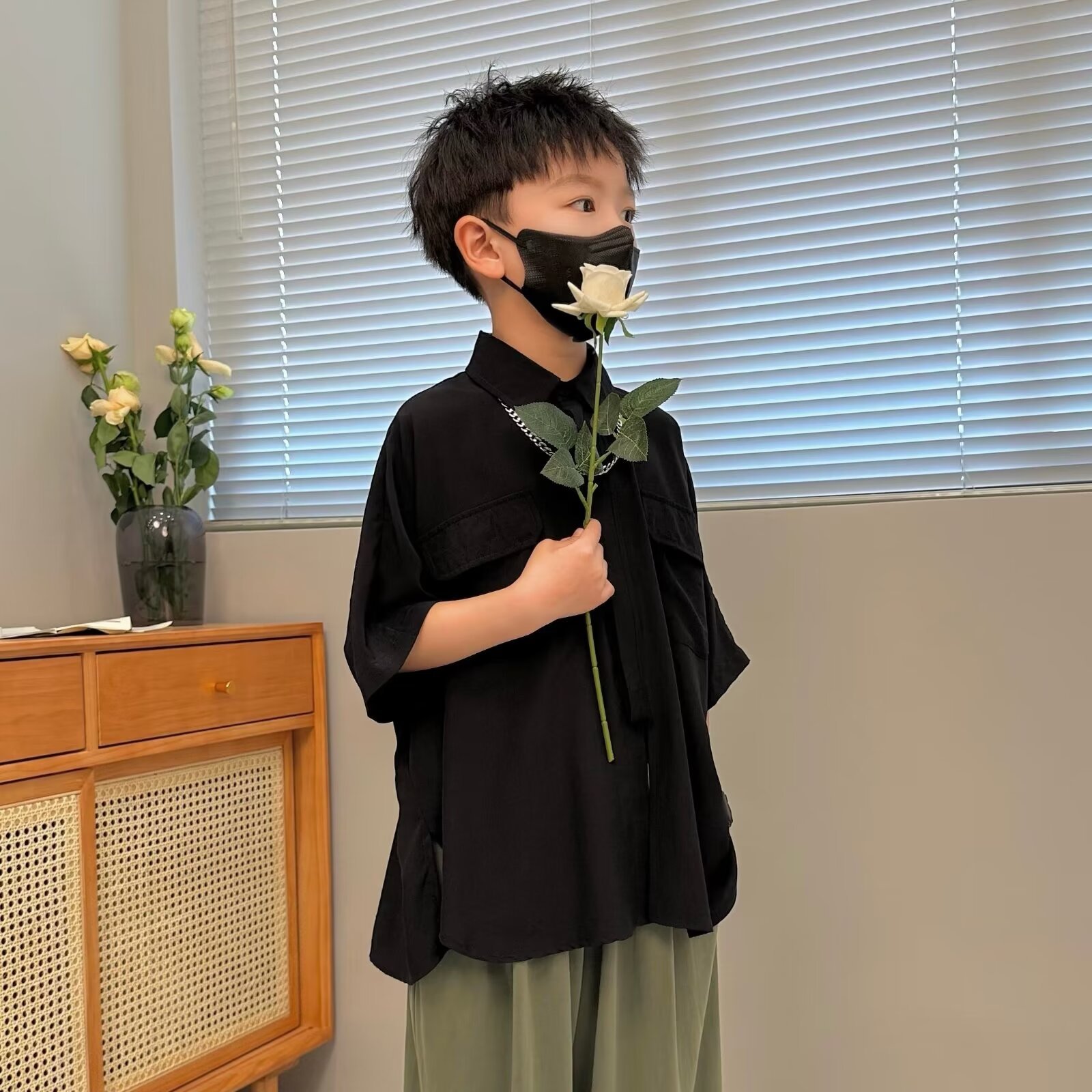 2025 여름 신상 남아용 일본식 더블 포켓 셔츠 중대형 어린이 포켓 셔츠 아동 캐주얼 단색 상의
