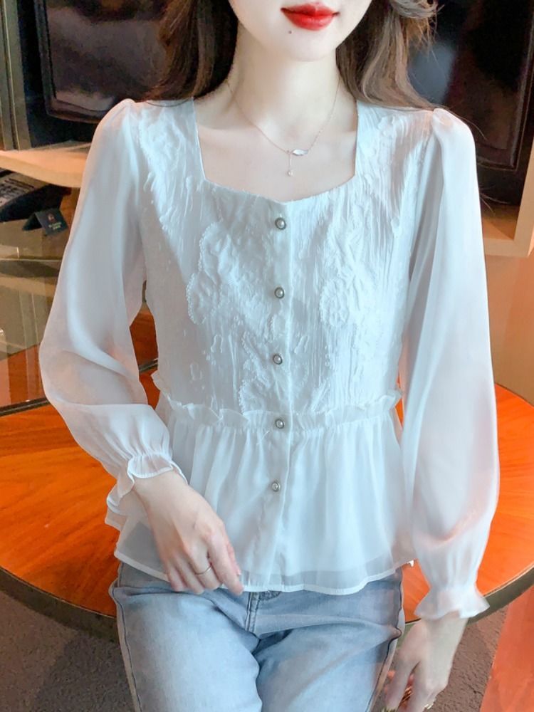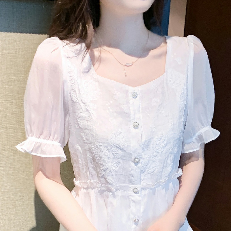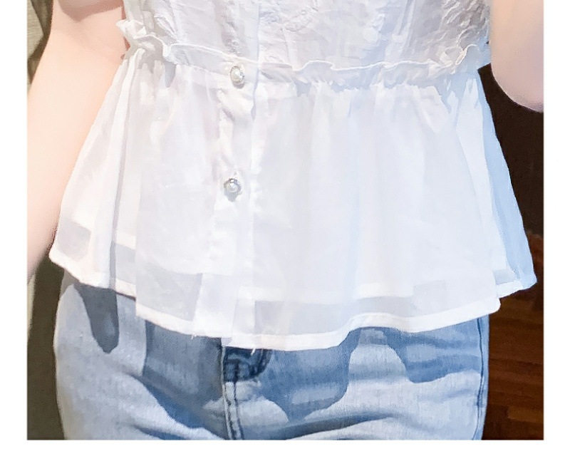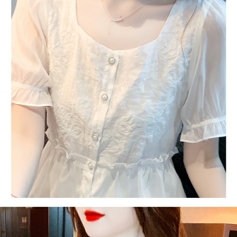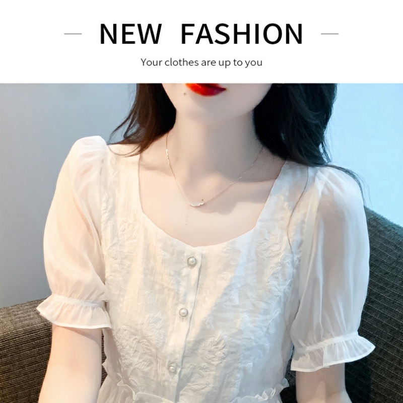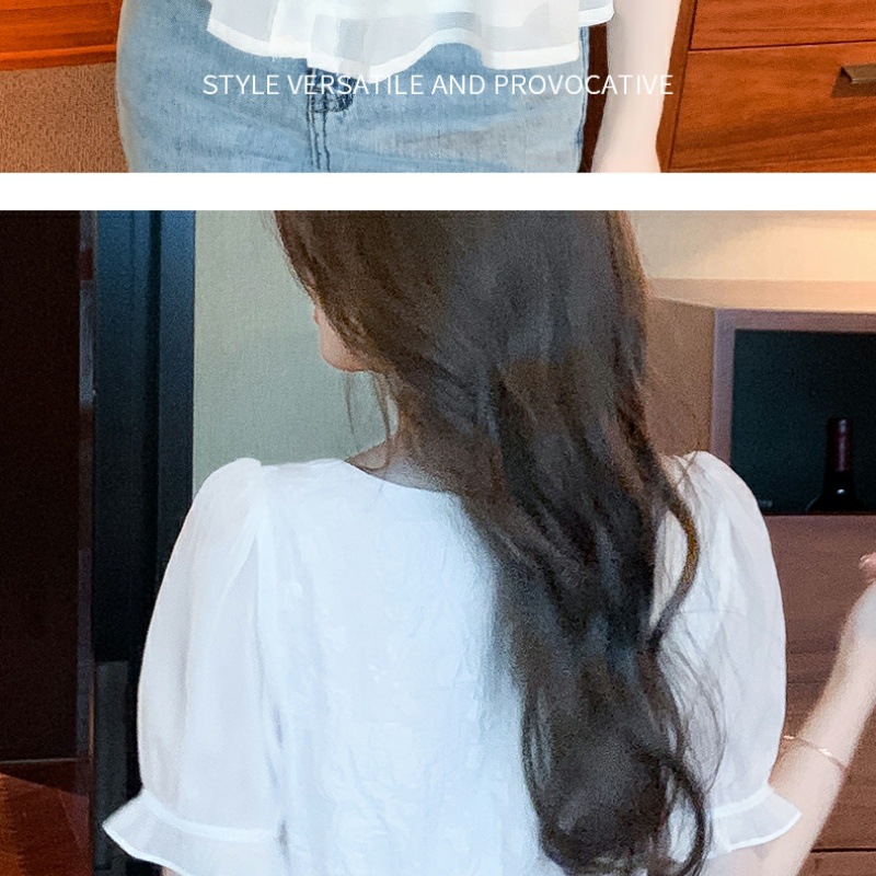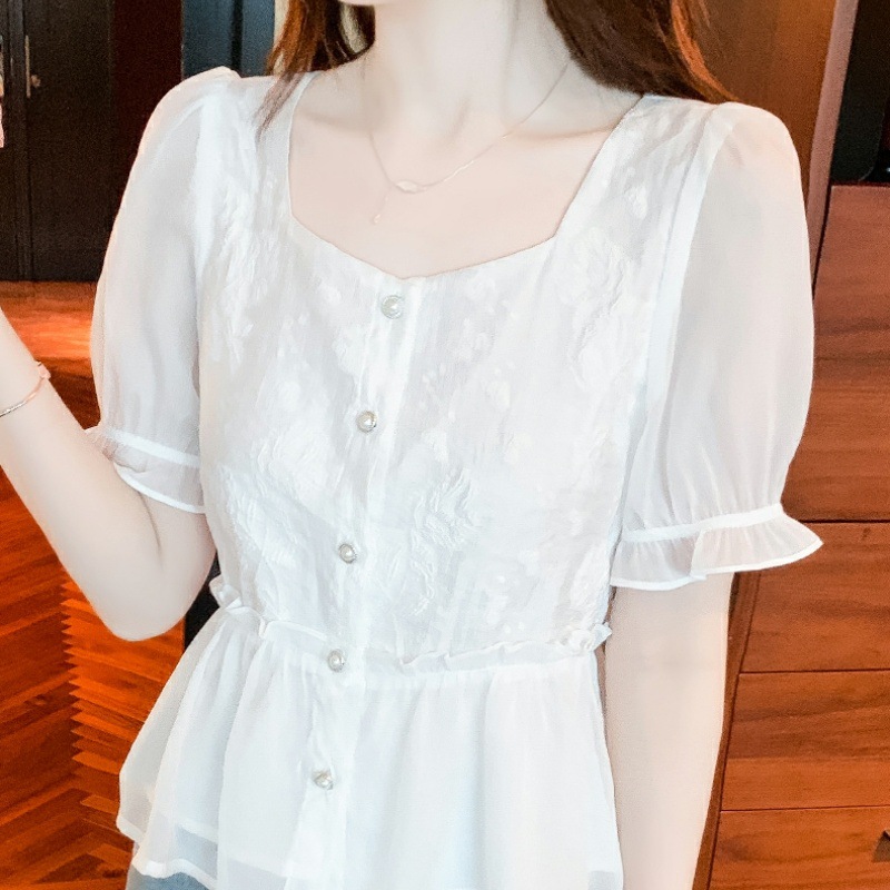 반팔 쉬폰 셔츠 여성 여름 2024 새로운 패션 서양식 연령 감소 셔츠 허리를 덮은 배꼽 레이스 녹색 마이크로스토어 가기