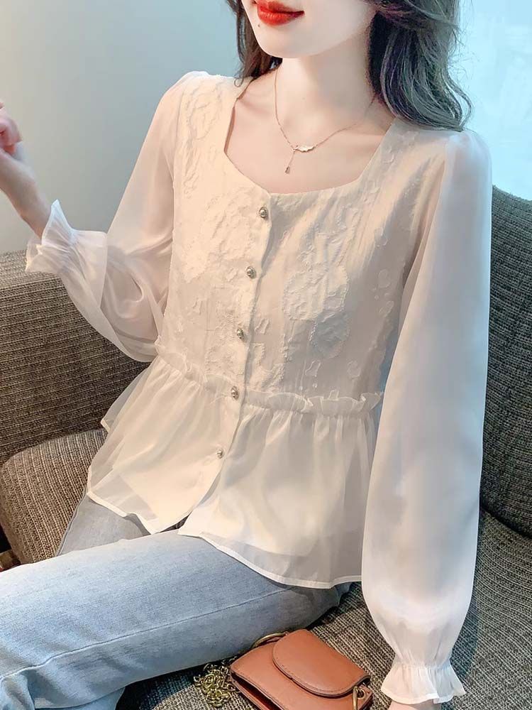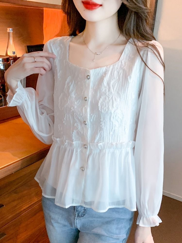 반팔 쉬폰 셔츠 여성 여름 2024 새로운 패션 서양식 연령 감소 셔츠 허리를 덮은 배꼽 레이스 녹색 마이크로