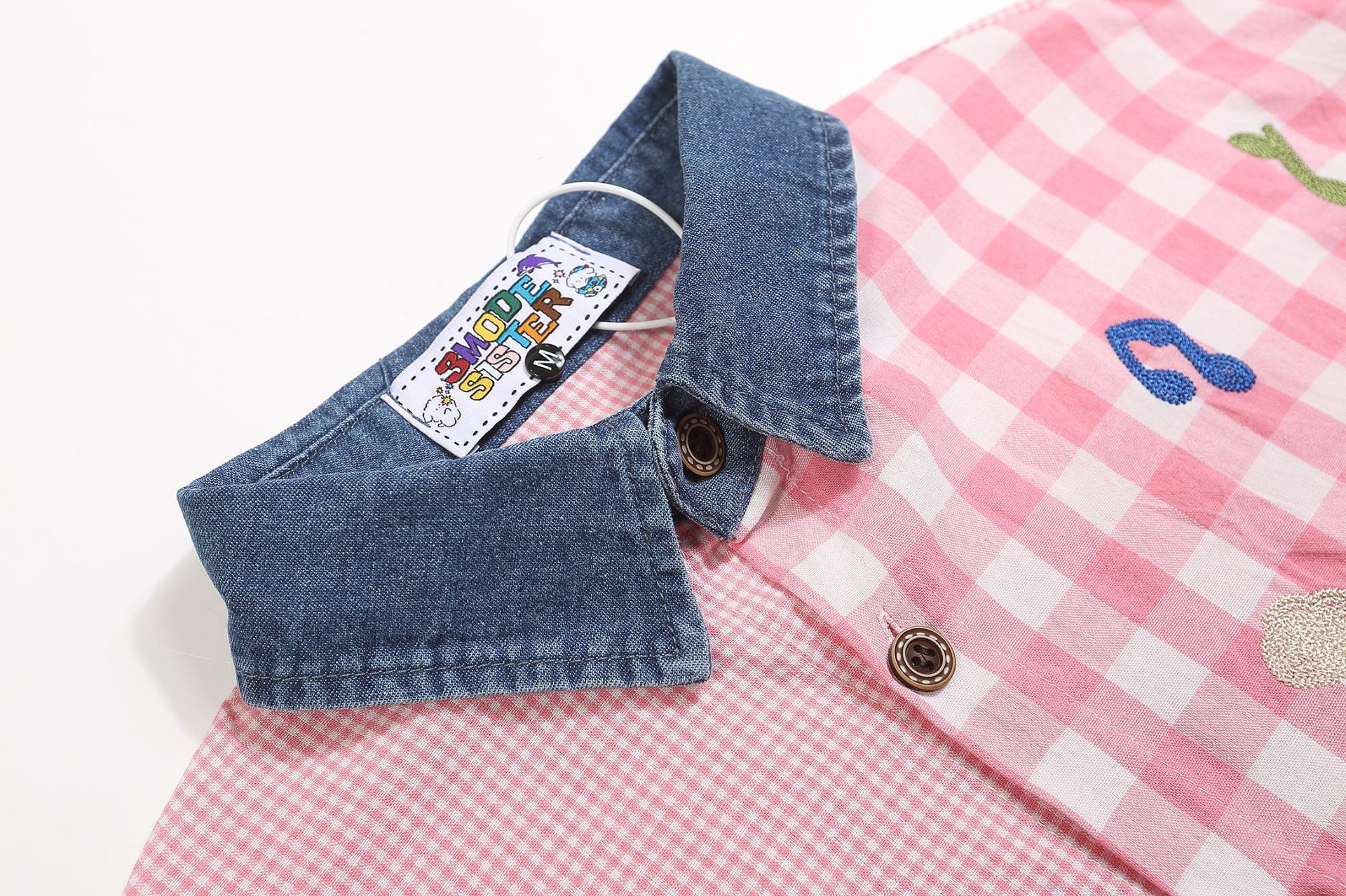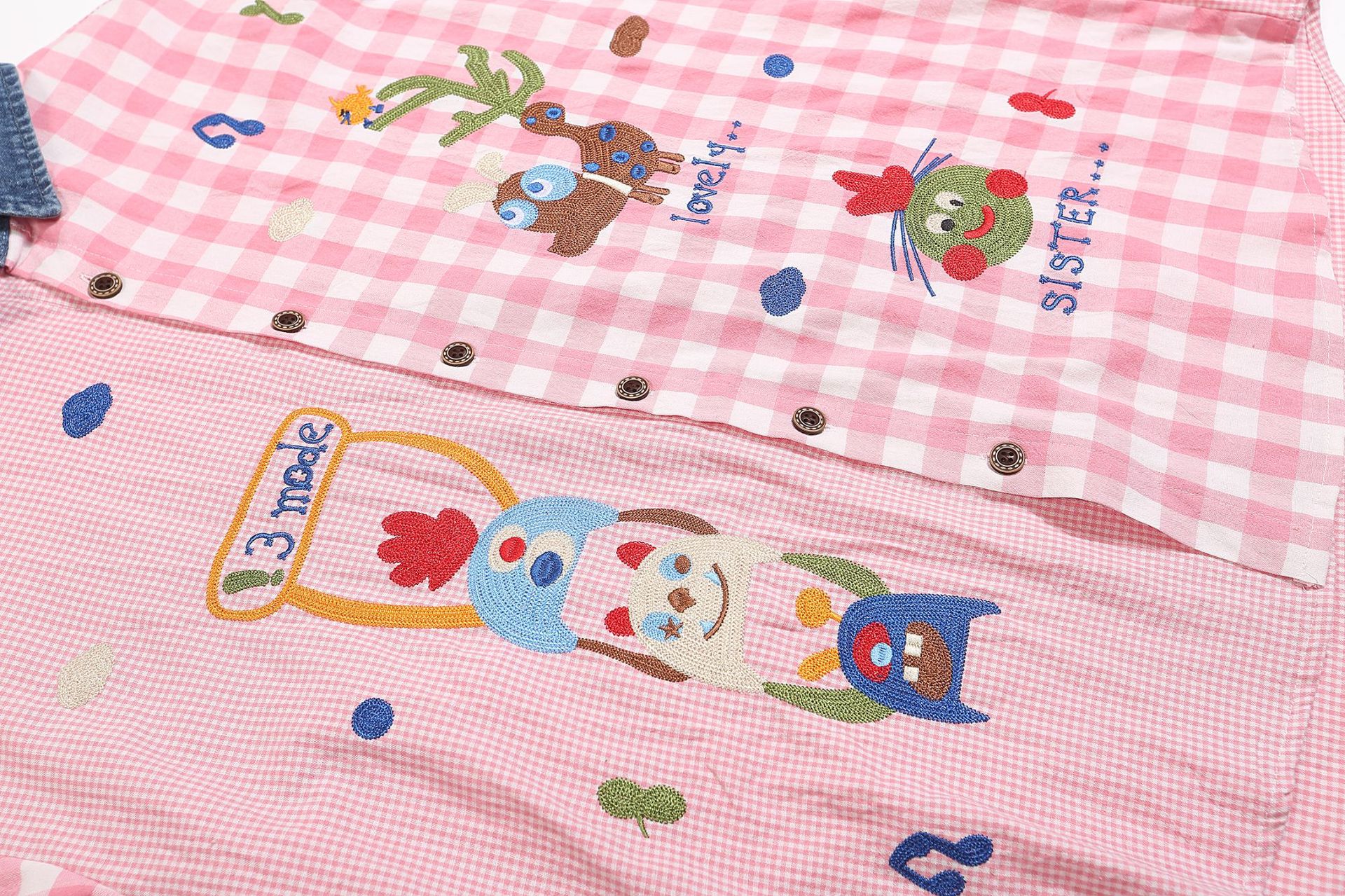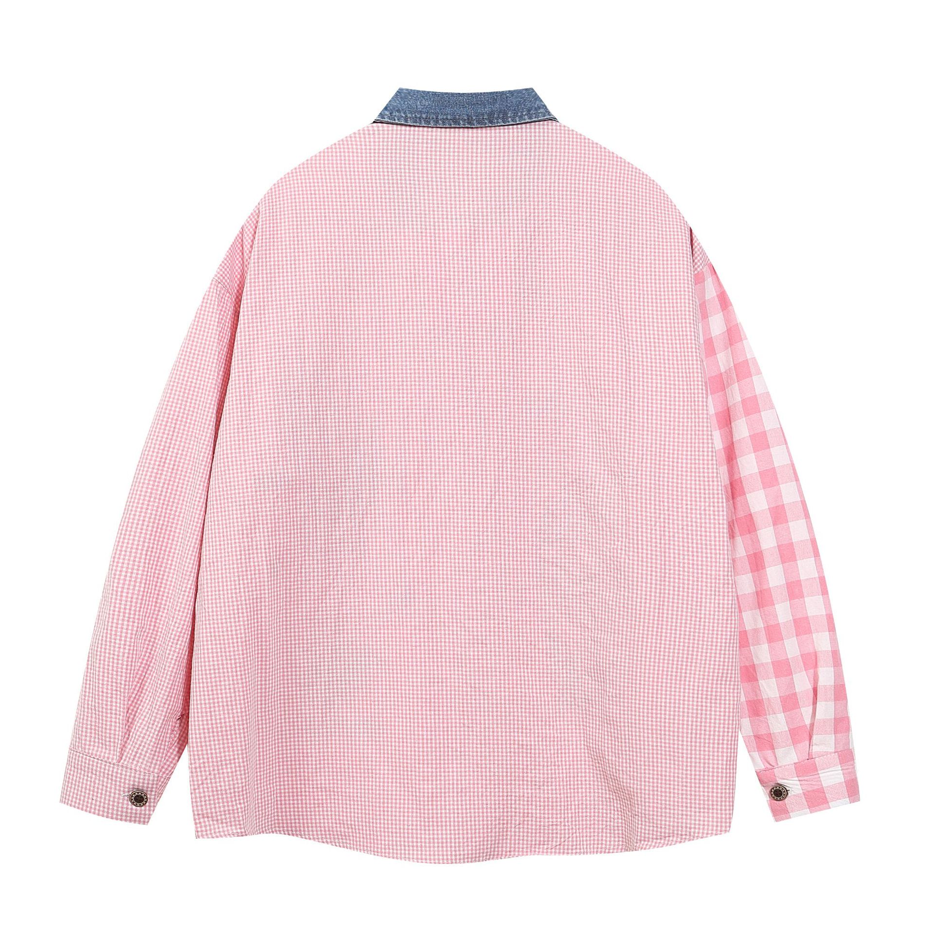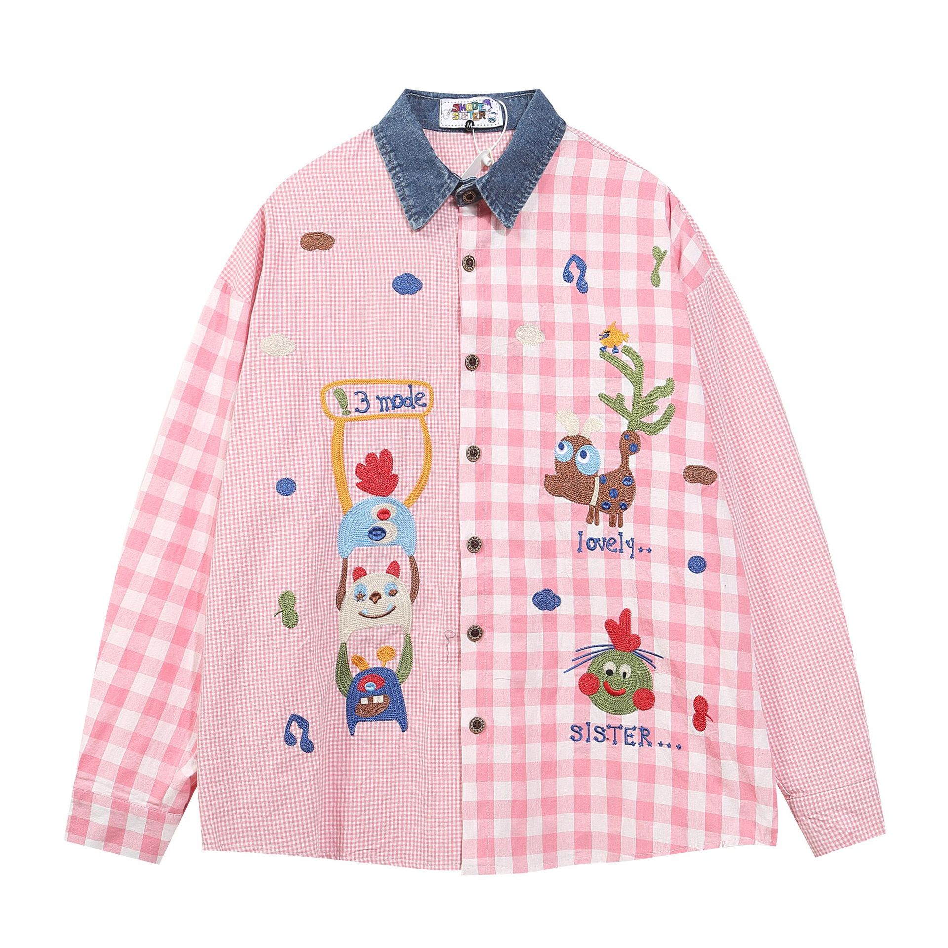 도파민 자수 만화 격자 무늬 긴팔 셔츠 여성의 2024 봄 새로운 느슨한 Bf 일본 빈티지 탑스토어 가기