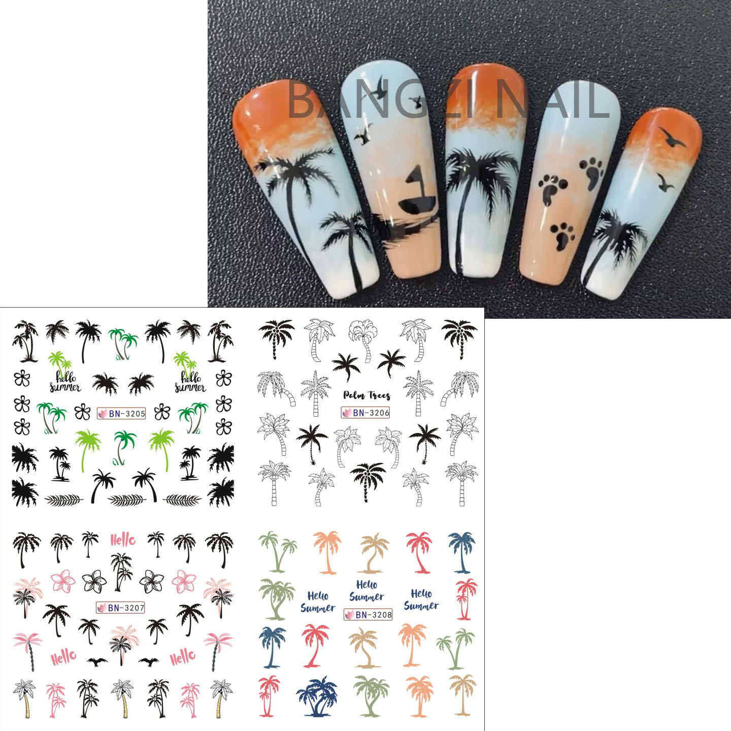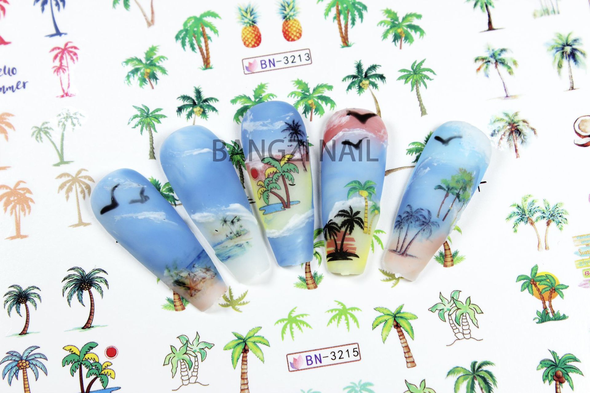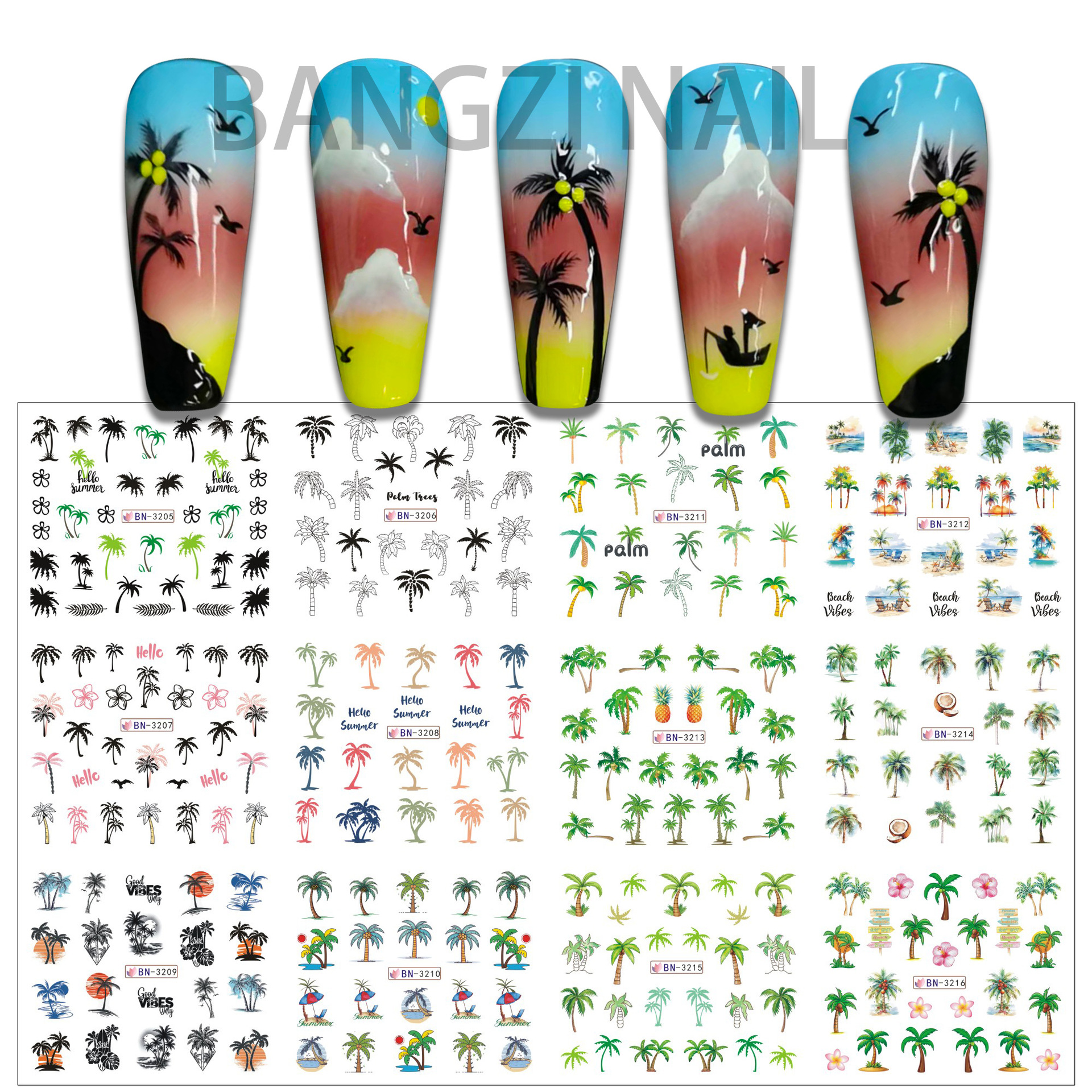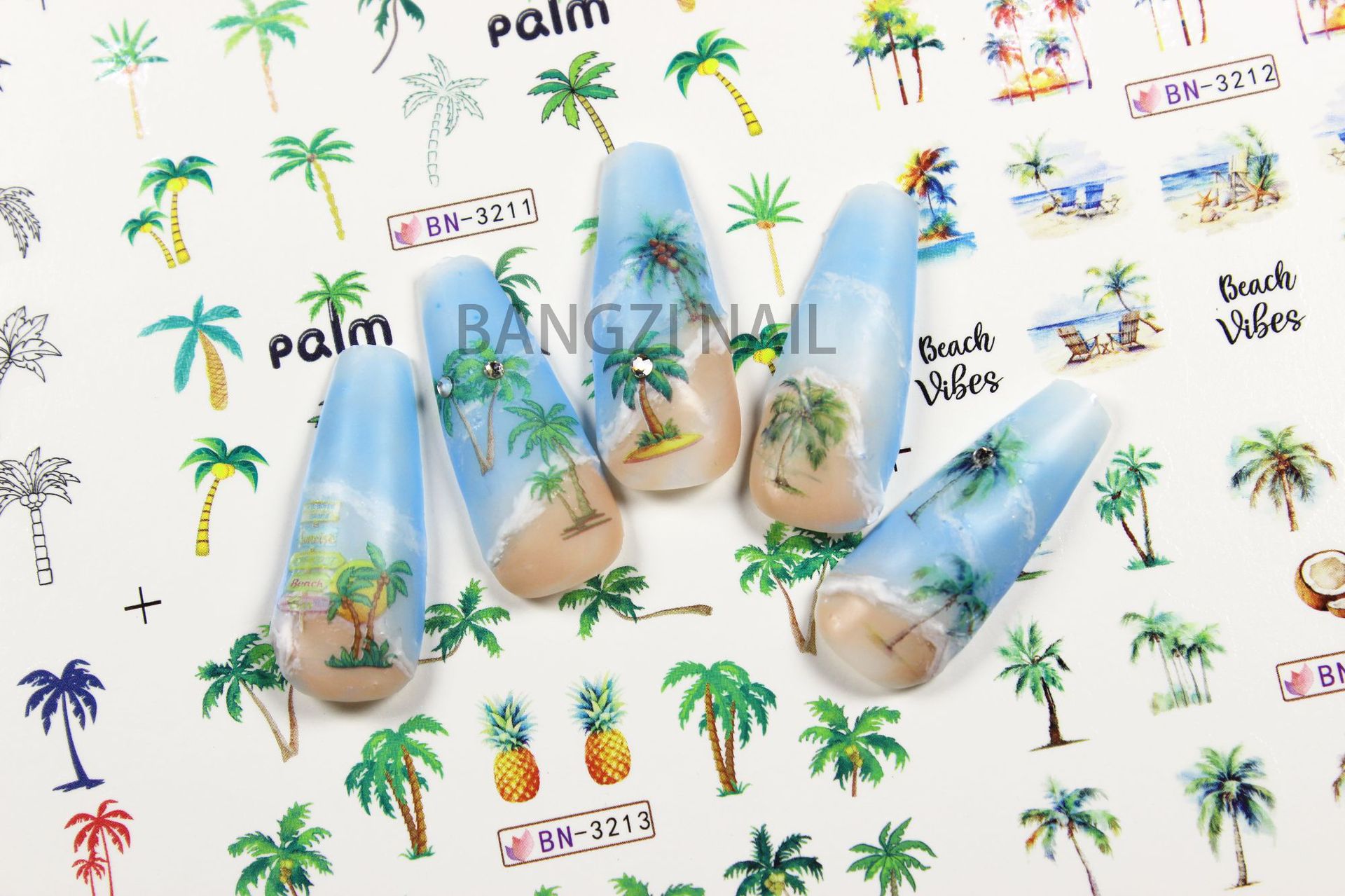 국경 간 뉴 네일 아트 워터 마크 스티커 여름 섬 일몰 코코넛 나무 식물 잎 큰 워터 마크 네일 스티커스토어 가기