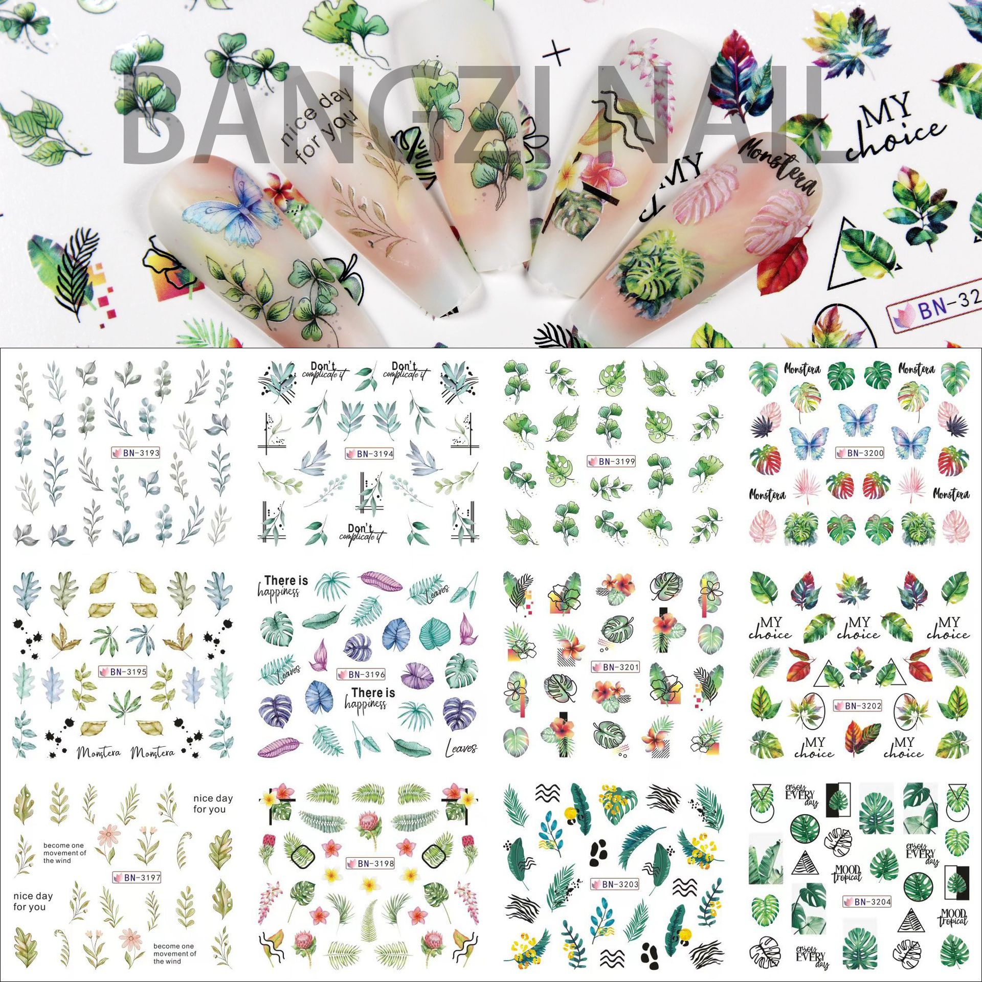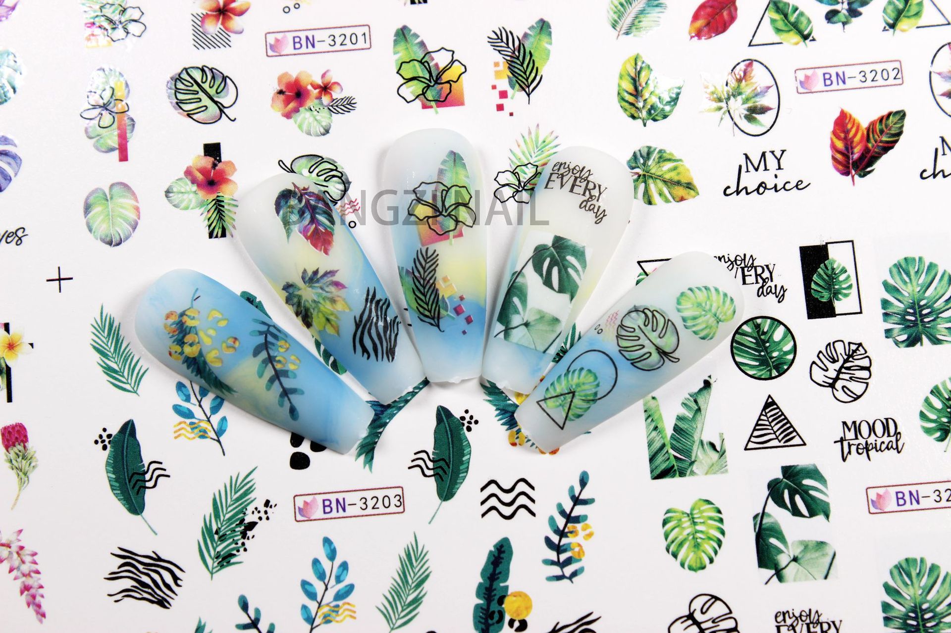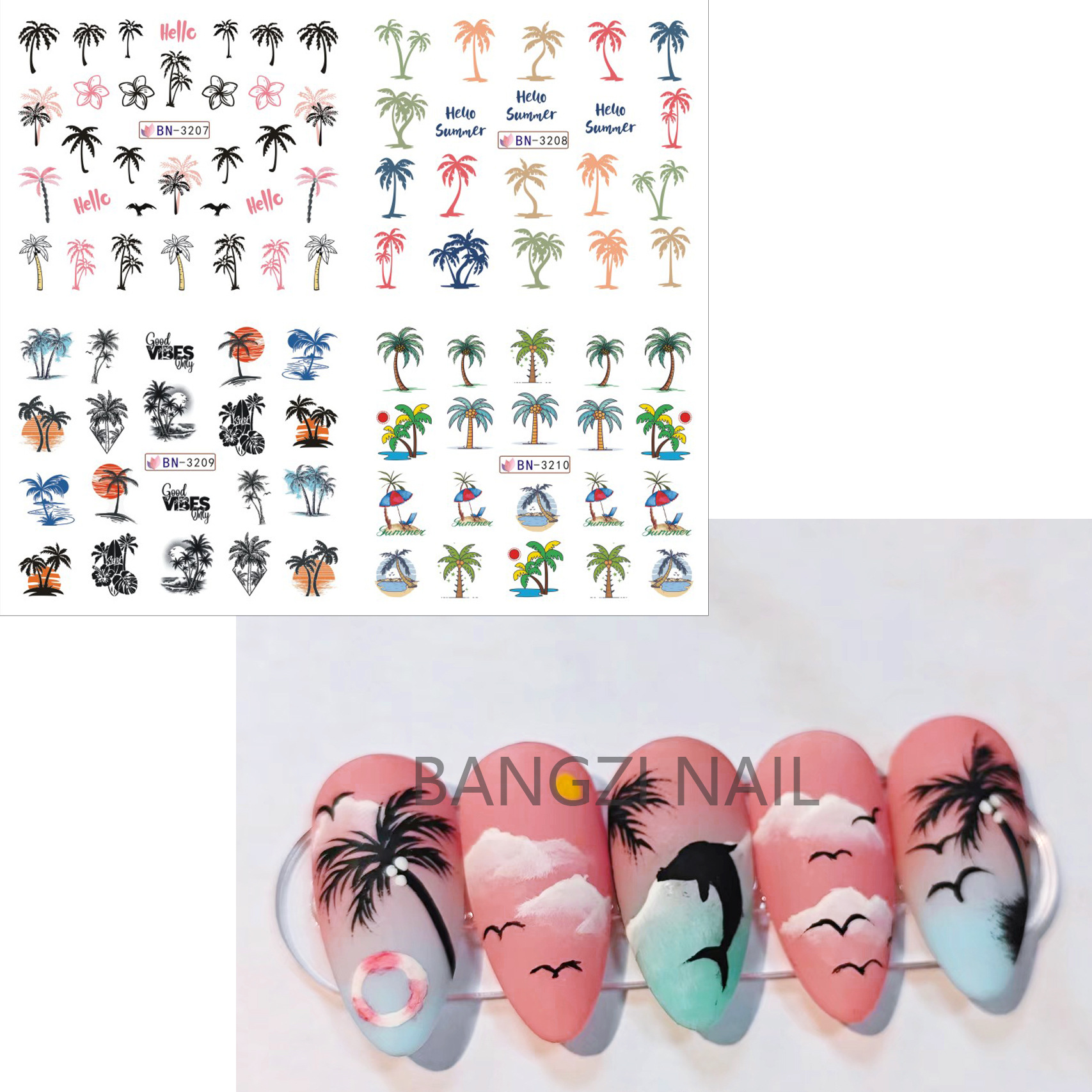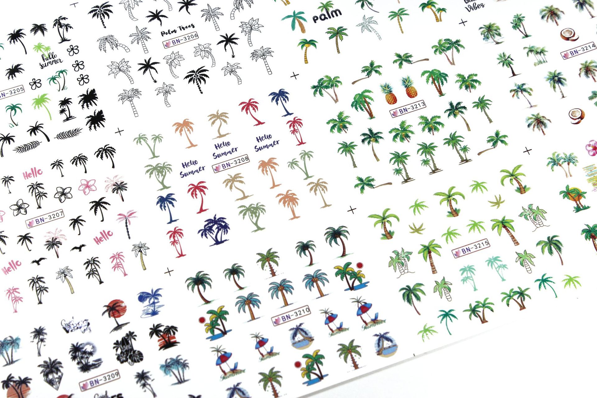국경 간 뉴 네일 아트 워터 마크 스티커 여름 섬 일몰 코코넛 나무 식물 잎 큰 워터 마크 네일 스티커스토어 가기