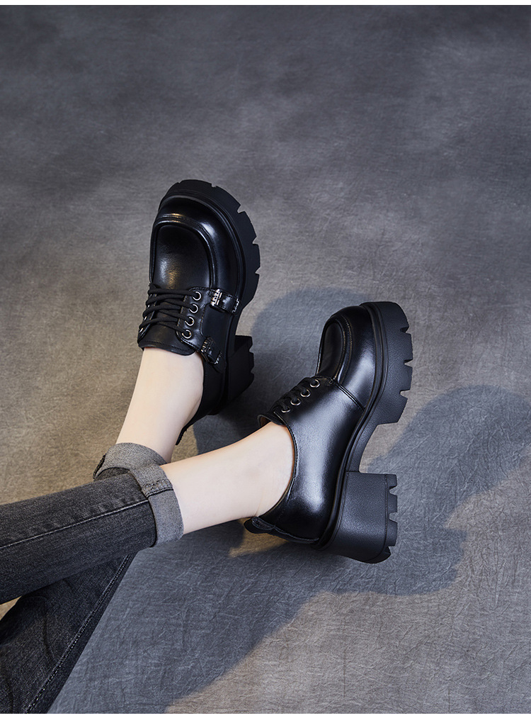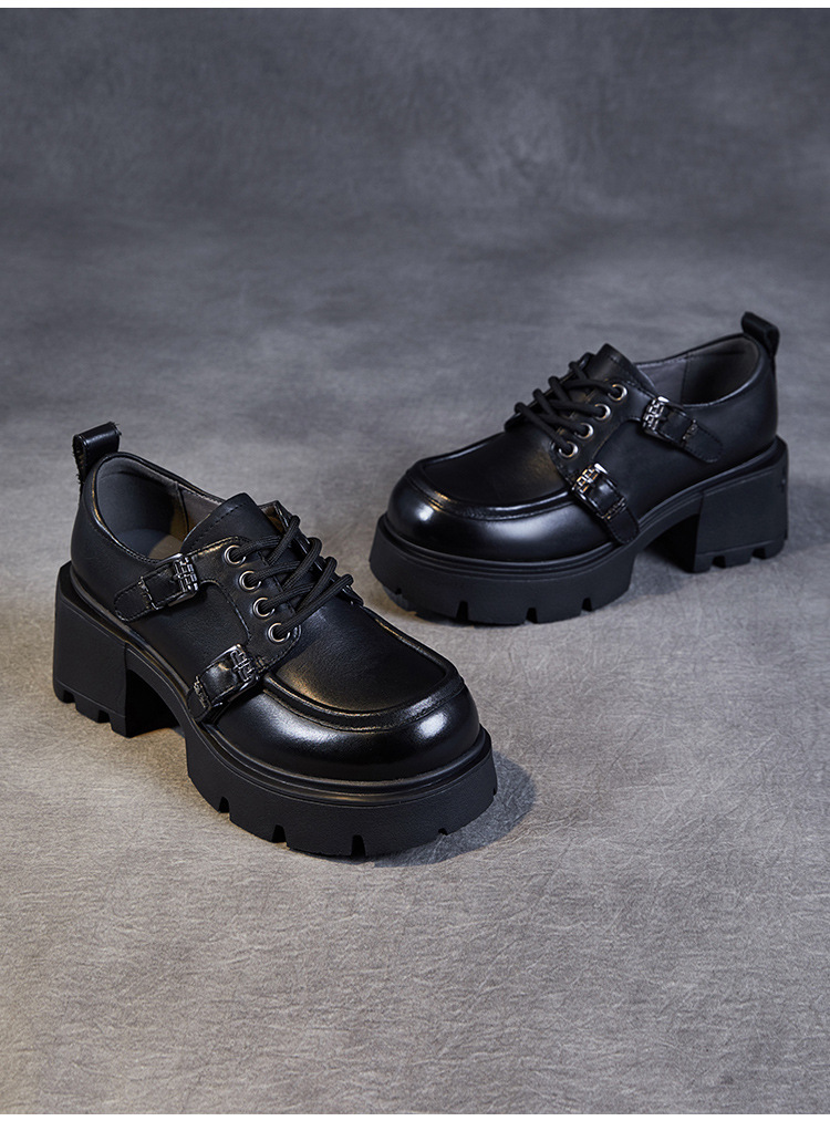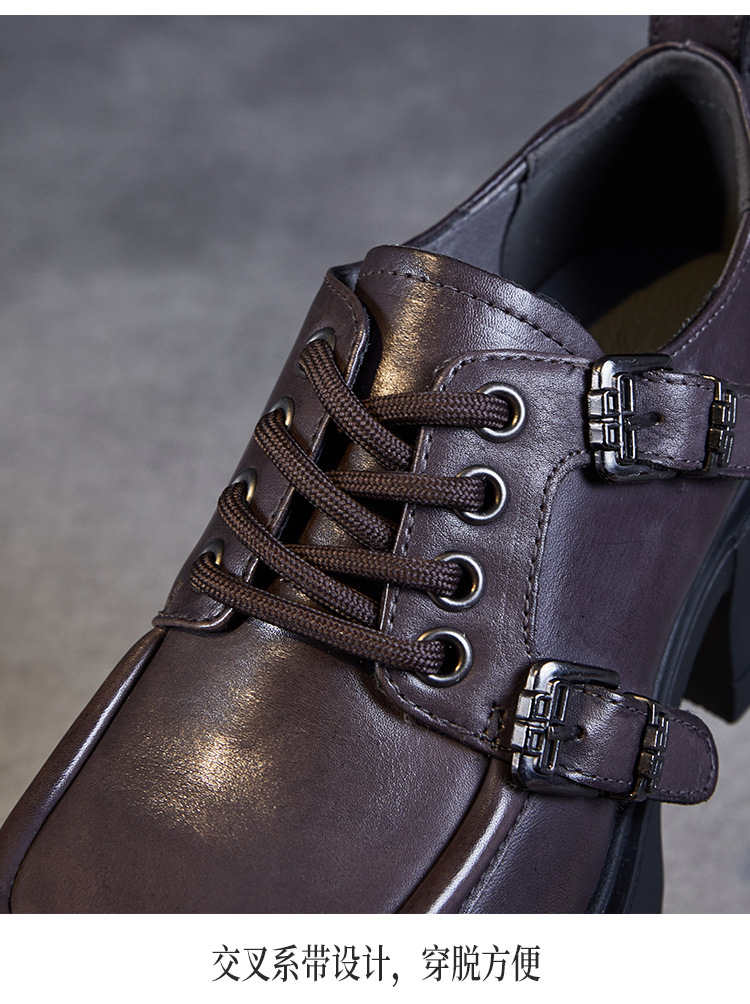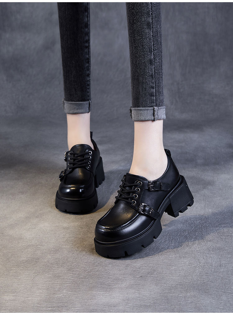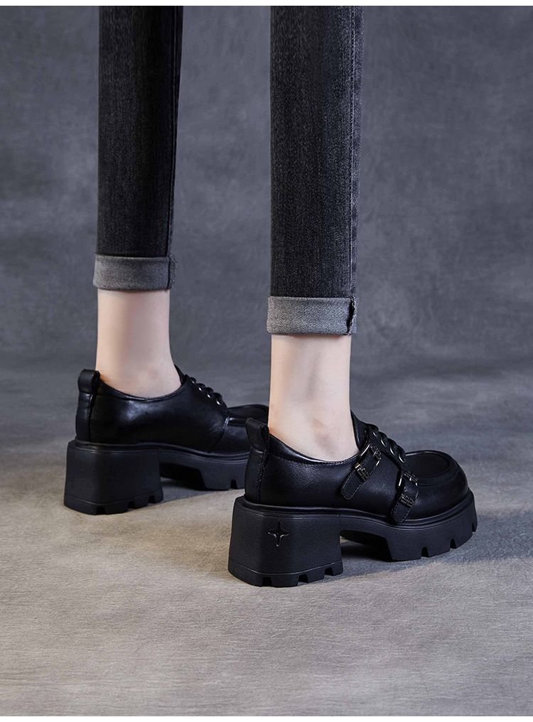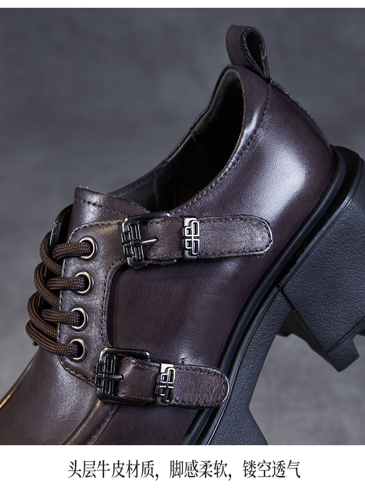 2024 봄과 가을 새로운 리얼 벨트 버클 레이스 업 두꺼운 바닥 Chunky Heel Jk Loafers 여성용 하이힐 영국 가죽 신발 여성