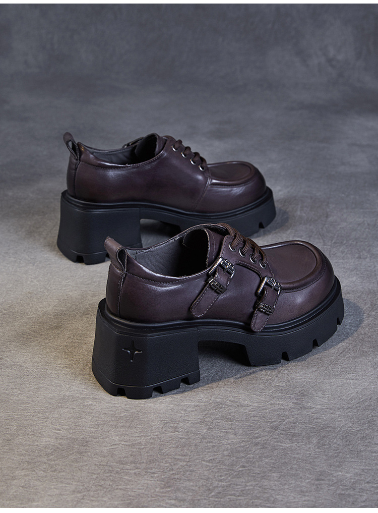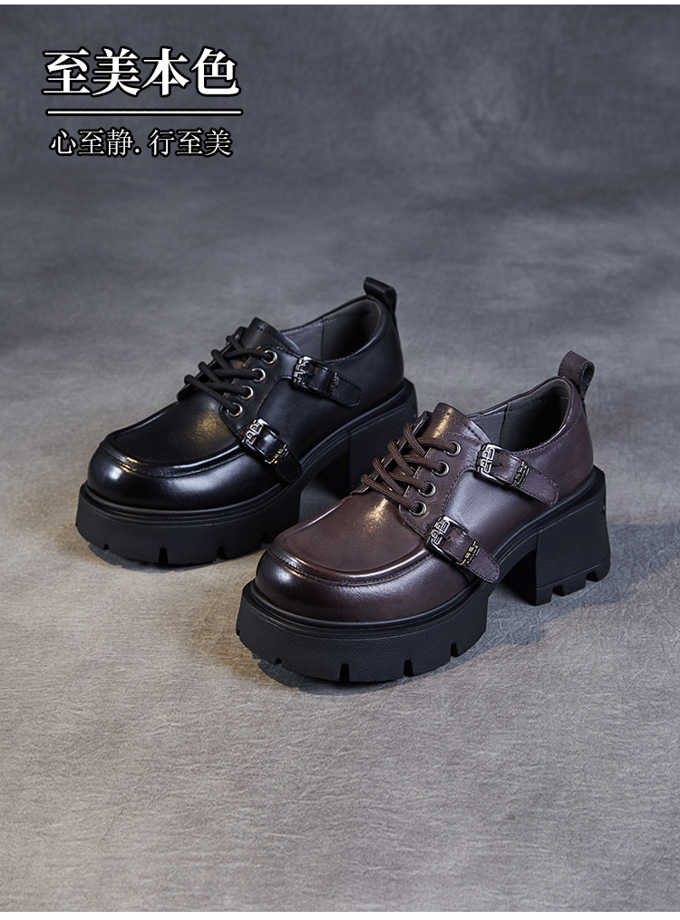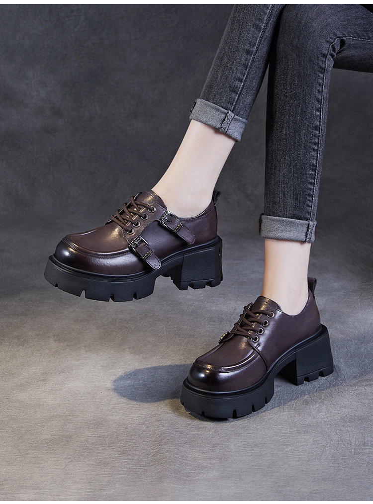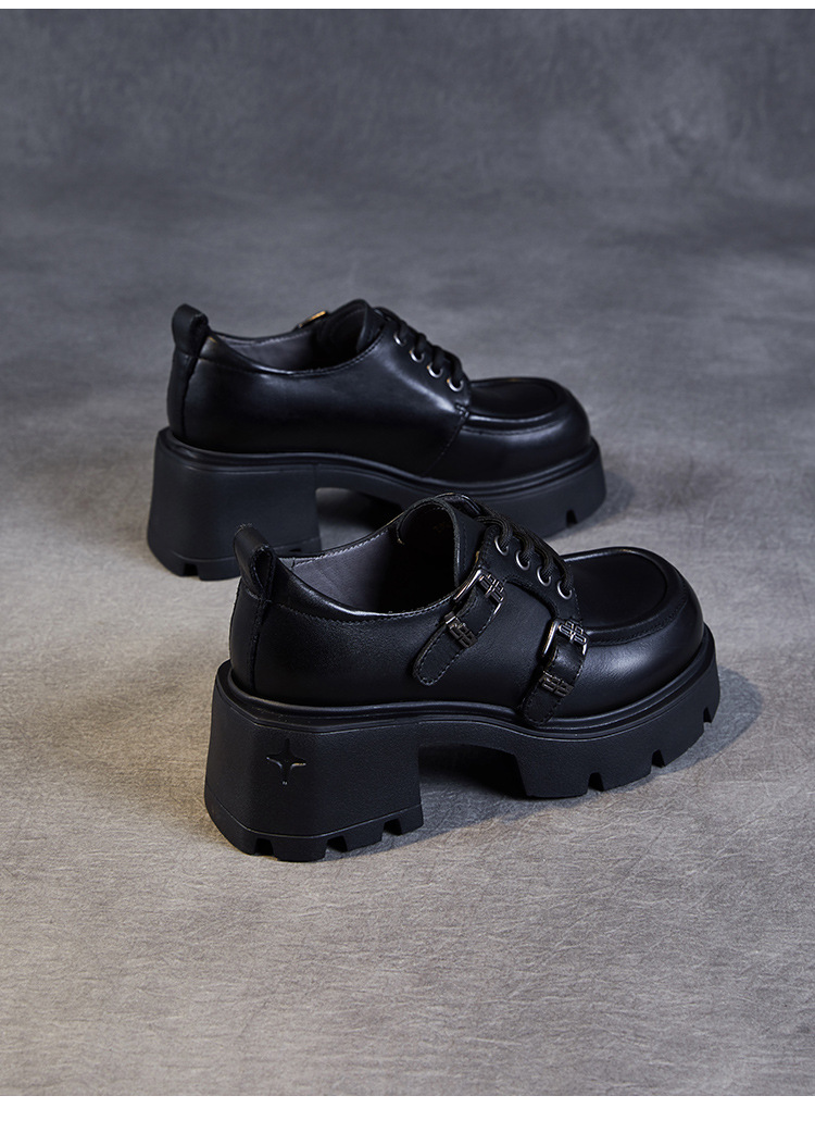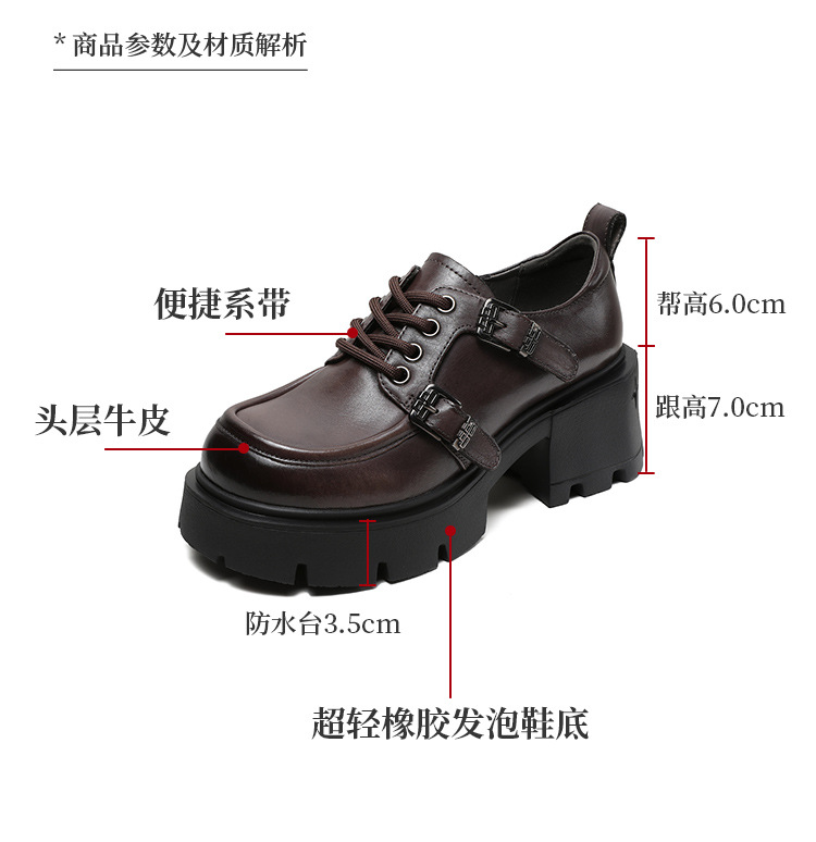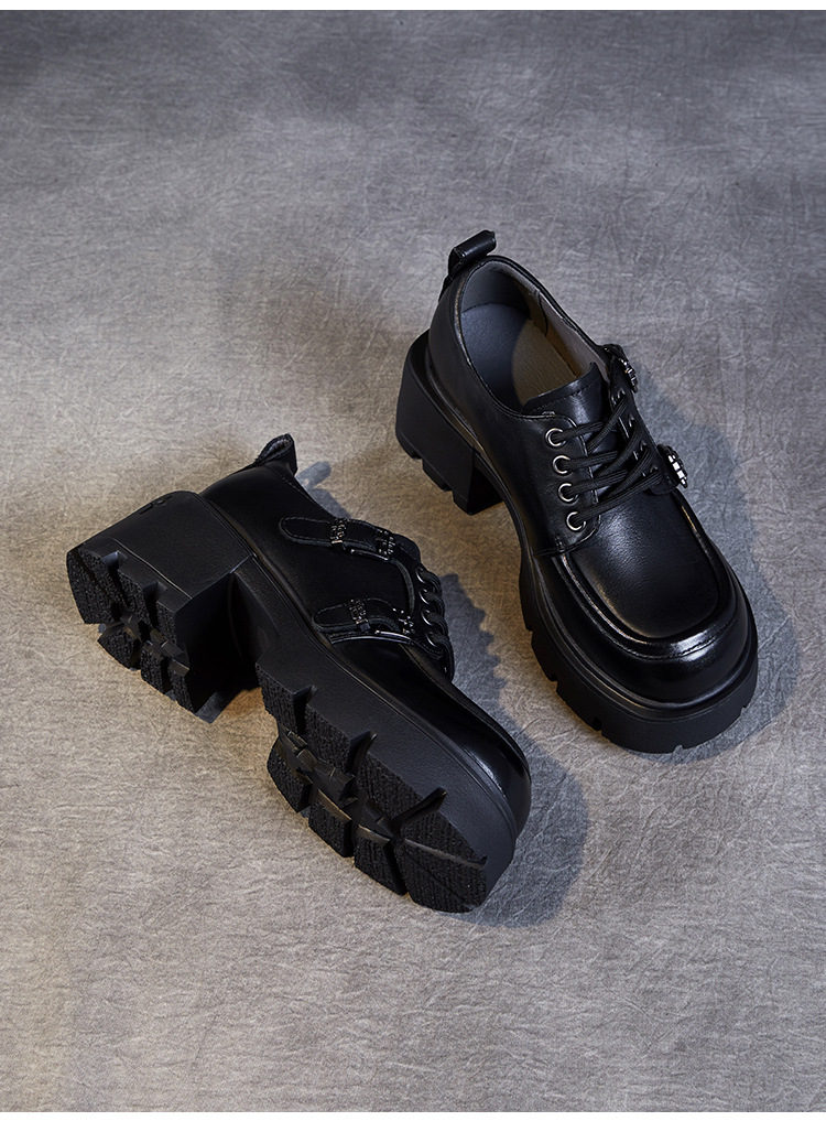 2024 봄과 가을 새로운 리얼 벨트 버클 레이스 업 두꺼운 바닥 Chunky Heel Jk Loafers 여성용 하이힐 영국 가죽 신발 여성