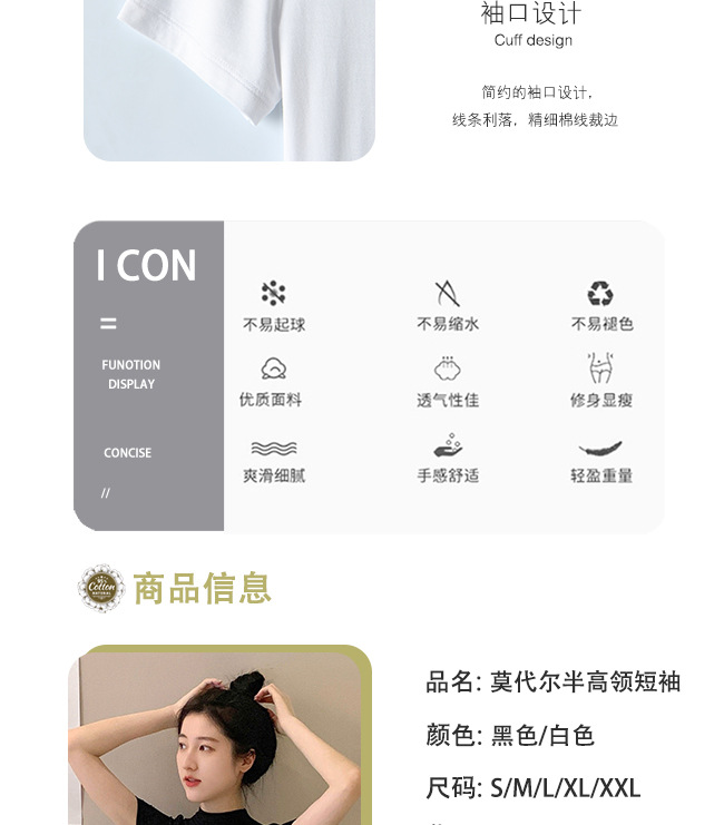 모달 블랙 하프 하이 넥 반소매 티셔츠 여성용 봄과 여름 2024 아이스 실크 미드 넥 탑 타이트한 반소매 베이스 셔츠