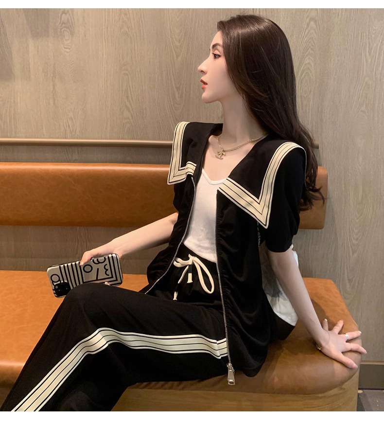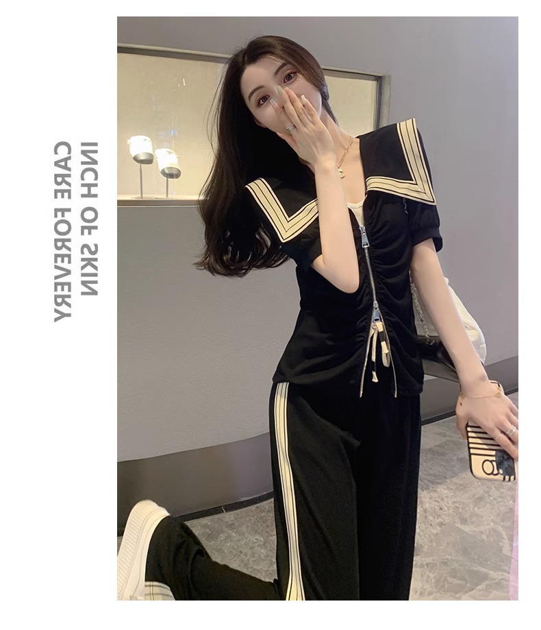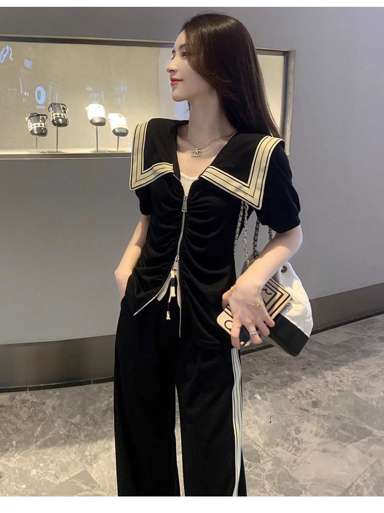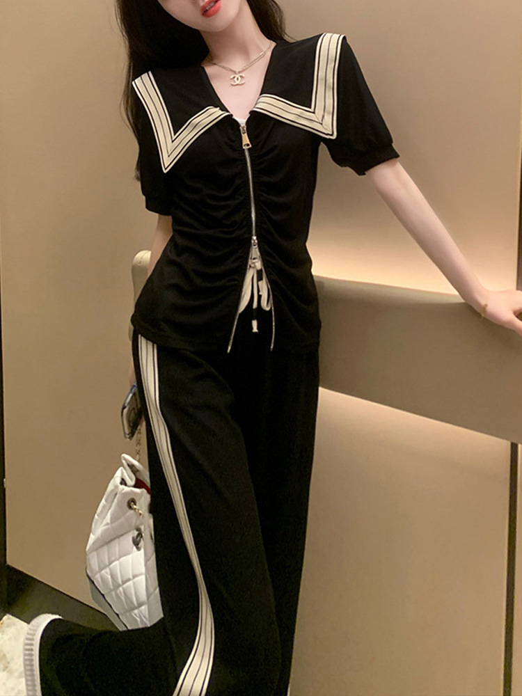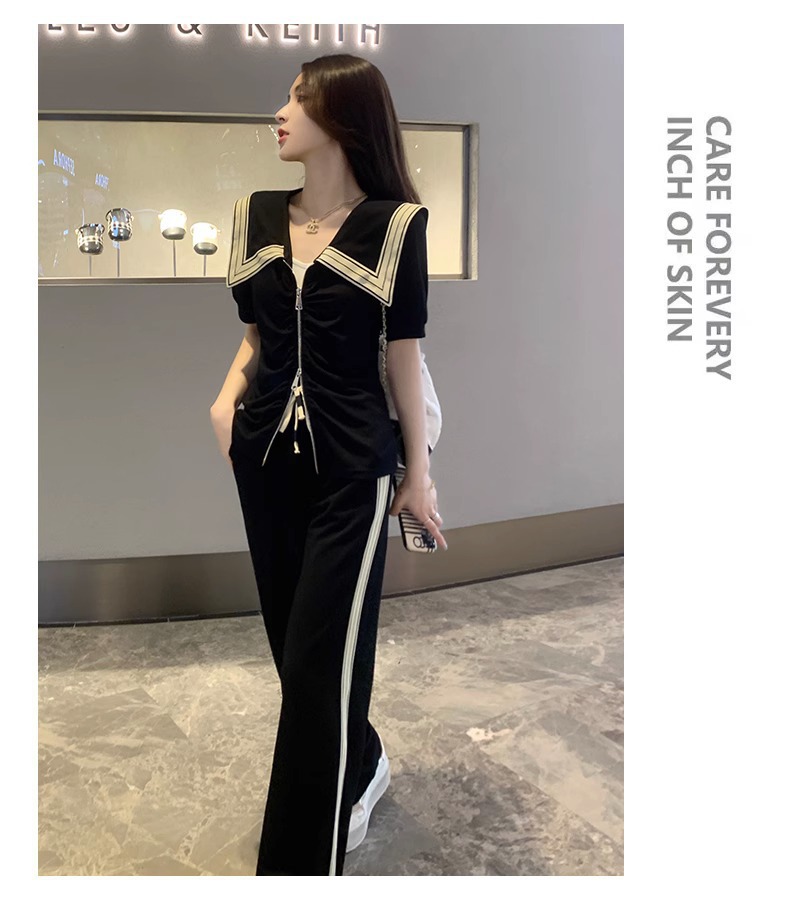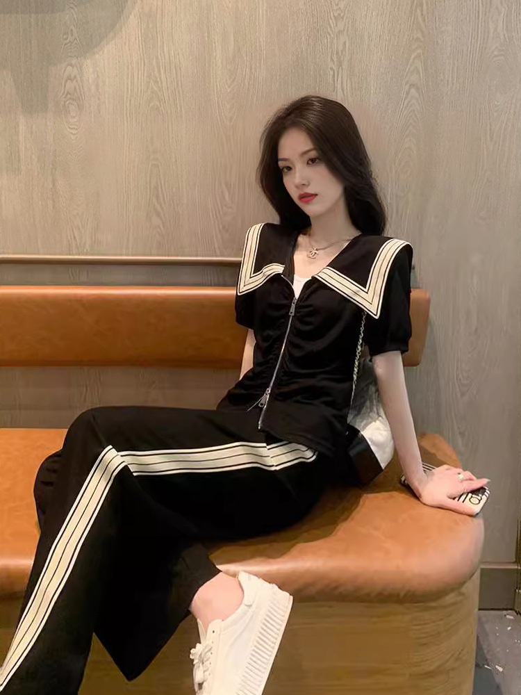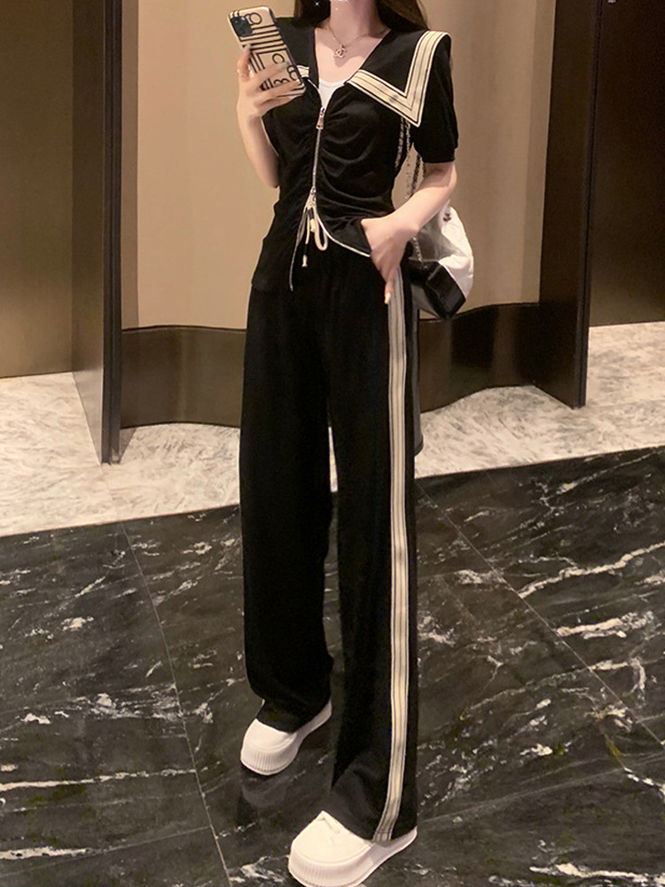 블랙 캐주얼 스포츠 세트 여자 여름 2024 새로운 느슨한 나이 감소 인터넷 연예인 프라이드 스트리트 반팔 와이드 레그 팬츠 투피스 세트